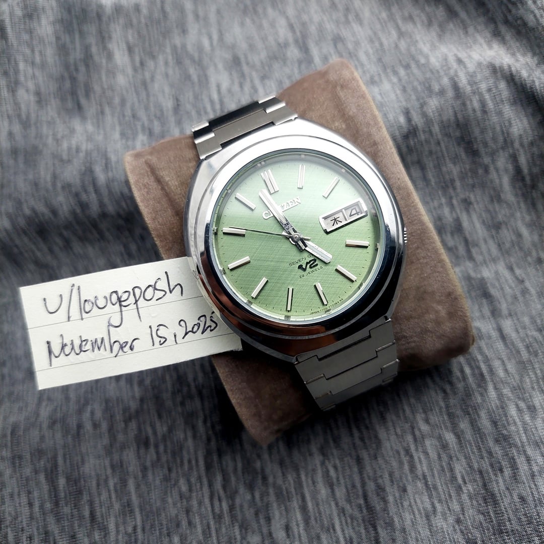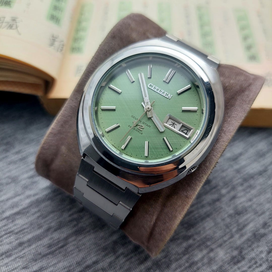 Up for sale Citizen V2 comes with beautiful light green matcha dial with linen texture which is rare to find, The watch is in good condition with time different +8 seconds in a day The watch also comes with solid after marketbracelet fit up to wrist size 20 cm / 8 inch The Citizen V2 is a series of vintage automatic watches produced by Citizen, primarily during the late 1960s and early 1970s. The watch, particularly the Citizen Seven Star V2, was introduced around 1969. It was a successor to the original Seven Star models which used the earlier Calibre 52 movement. The watch were notable for housing the newer and improved Calibre 72 and Calibre 77 family of automatic movements. These movements typically featured a higher beat rate of 21,600 beats per hour (bph), compared to the older 18,000 bph movements, indicating a step up in precision for the time. Ref No : 4-770978-K Production year : 80's Case size: 37 mm (include crown) Lug to lug: 41 mm The case has received a gentle polish, enhancing its appearance while carefully preserving its original edge shape and the crystal is in good condition. Looking to get $250 shipped and tariffs covered for USA Payment via Paypal F&F and G&S + 4.8%. Video of watch : https://www.instagram.com/reel/DRFSGNwj_gP/?igsh=MXEwYTMzMjhqbzN2cA== for more collection please follow my instagram: https://www.instagram.com/lougeposh/ Please COMMENT FIRST before sending me a pm or chat. Tracking number (Airwaybill) will available within 3 days once payment confirmed