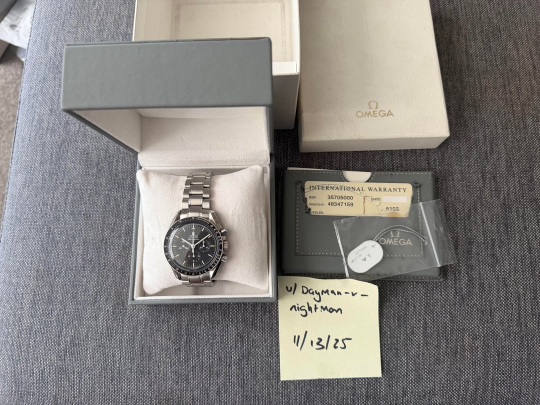 Up for sale today is this very lovely **Omega Speedmaster Professional (ref. 3570.50)**, which comes as a full set, from 1996. This is a fairly unique example, as it has the tritium dial and hands which were used for a couple of years only before the change over to superluminova. The warranty card is dated 1996, and the watch was serviced approx. 18 months ago. **Price: $4,250.** I have been a trusted seller on Reddit since 2018, and can provide positive feedback from 700+ prior watch transactions. If you have any questions or would like to see a video, just let me know! Thanks