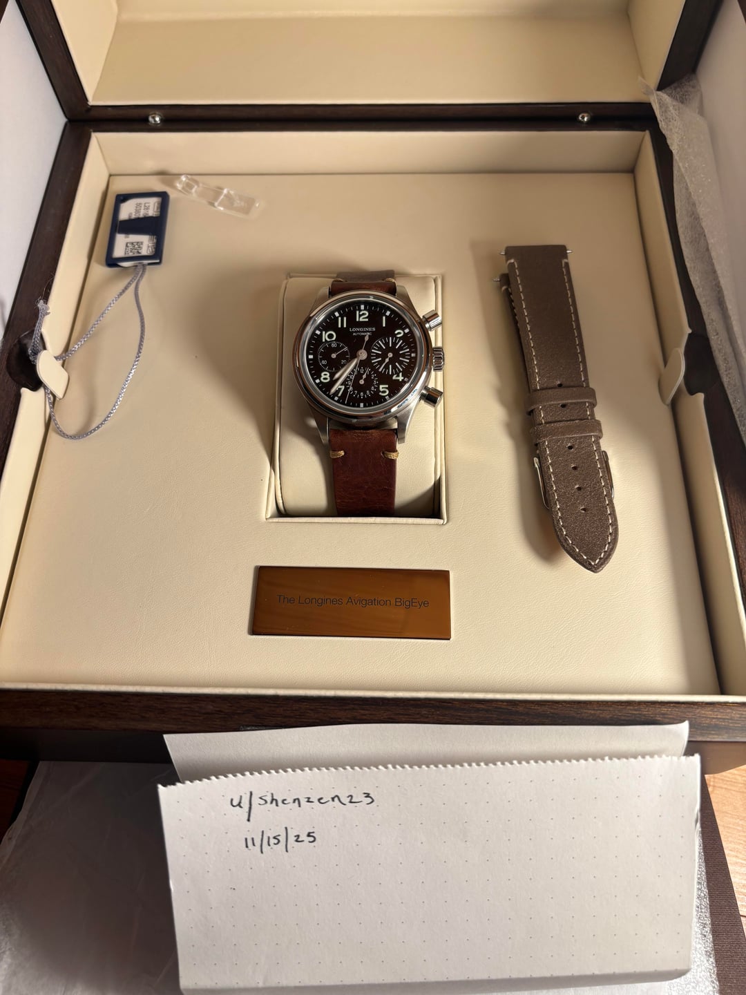 am selling my stunning Longines Avigation BigEye Chronograph. This wonderful watch features a 41mm brushed and polished case with a box sapphire crystal and a beautifully detailed dial with the standout Big Eye register. The watch is in excellent condition, and has only been worn a few times. I have kept the OEM strap aside in the case (you can see it in the pics), and the watch is on a non-OEM leather strap which I will include. I hate to sell this watch, but need the funds. Full Kit Includes the following: * Original large presentation box * Hang tag, booklet, and warranty card (undated) * OEM brown leather strap (great condition) * non-OEM brown leather strap strap (good condition) $1475 shipped CONUS. Zelle, Venmo, or PayPal (add 3% for G&S). No trades. Feel free to reach out with any questions. Thanks for looking!
