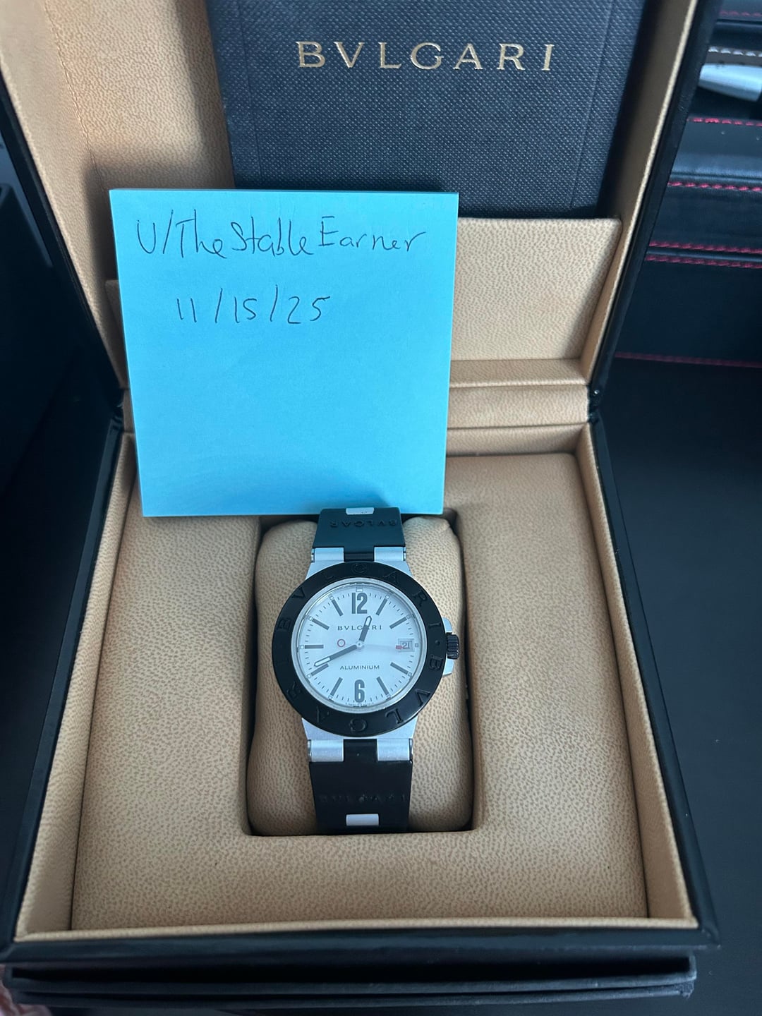 Hello everyone, here I have a very nice 2004 Bvlgari AL38! This is the first-generation Bulgari Aluminium Automatic that started Bvlgaris iconic aluminum line. (pre-revival model), known for its lightweight titanium–aluminium build and unique Italian design. The earlier models recently gaining more collectibility since the reissue pushed prices upward. In my opinion this is a very fun way to change up your rotation with a more polarizing watch, yet still keeping it classy! This watch comes with original inner and outer box, warranty card, Authenticity card, and papers. These full sets are much more rare and collectable! Condition: The watch is in Great used condition especially for its age. There are some scratches and light chipping on the aluminum in some more prone areas but nothing major! The titanium case back also has some light scratches. The sapphire crystal is clean and the rubber band is also holding up really well. Price and payment: This watch is priced very fairly at $758 shipped within the continental United States. After some research almost all the ones available do not include full kit and they’re almost all outside the country and priced similarly! Payment via PayPal FF or Zelle please. As I always state, I completely understand that there has been a noticeable rise in scammers within this community lately. I will do my best to make sure you feel as comfortable as possible doing business with me! Please refer to my feedback as well. Thanks for taking a look!