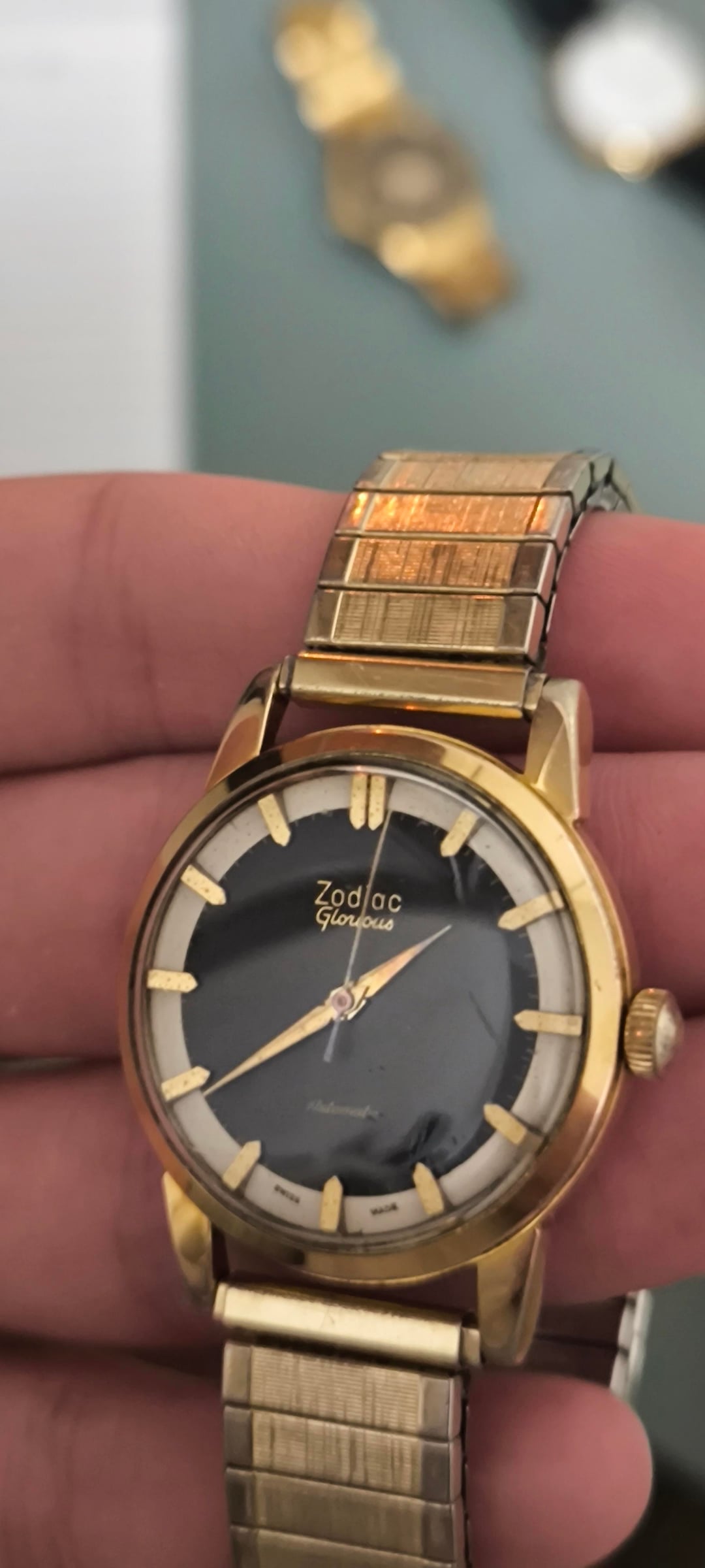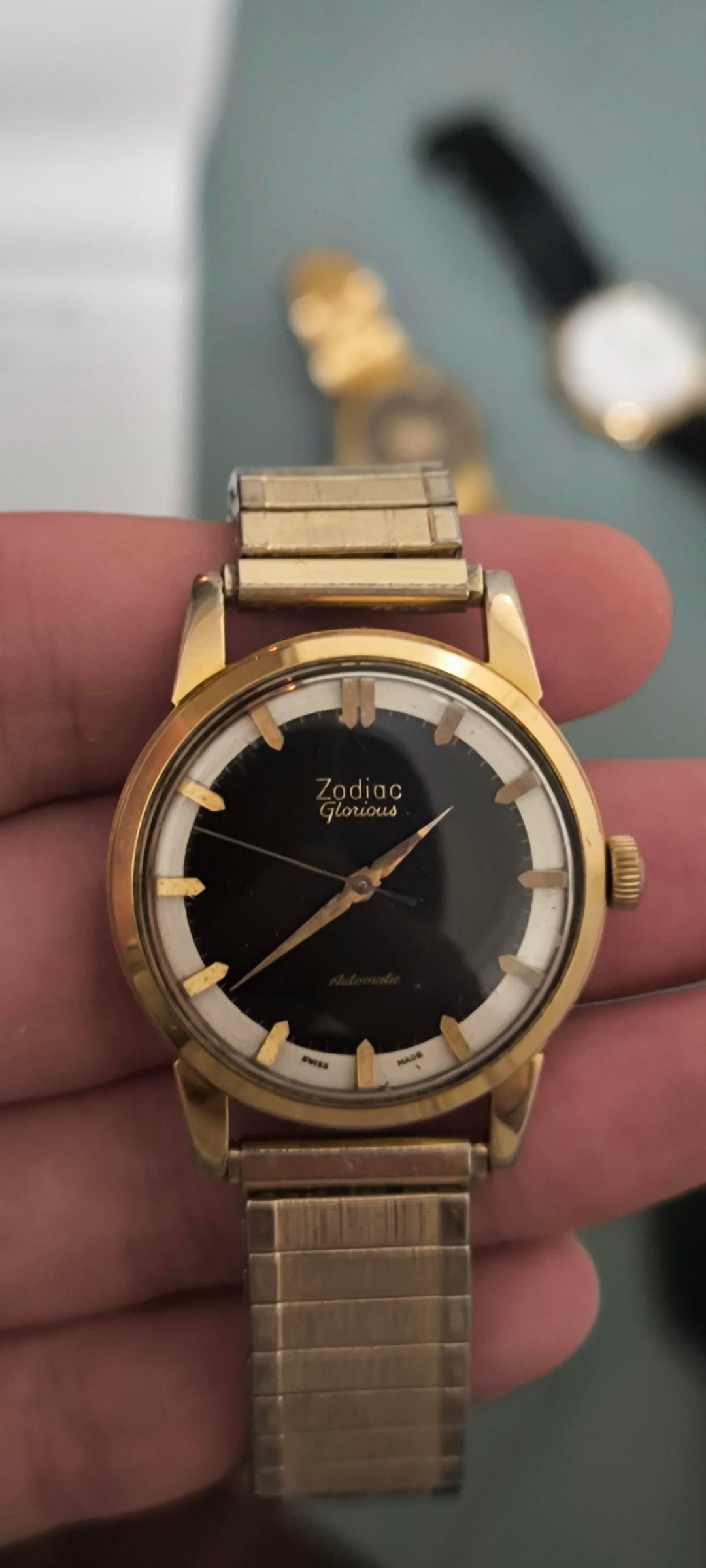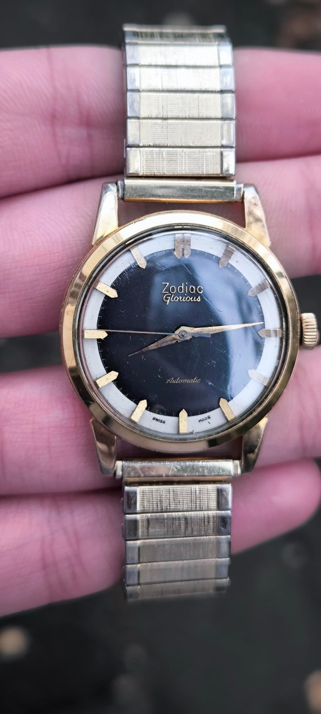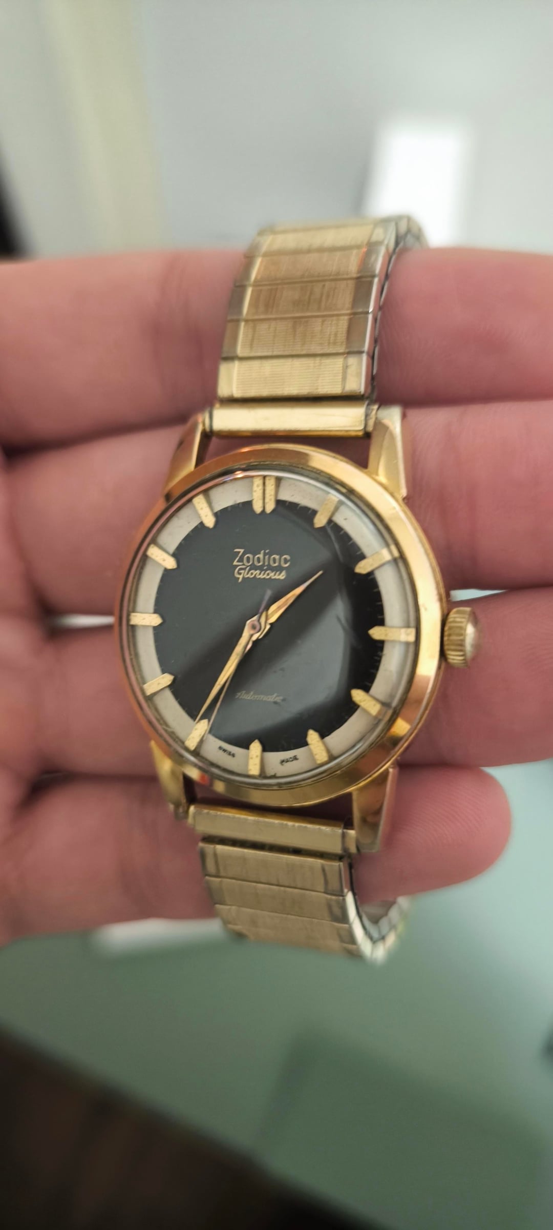 For sale: Zodiac Glorious Automatic Men's watch ref 688 (1950-1959). Other watchesfor sale: https://www.reddit.com/u/Ezodan/s/B83Xu0QO9E Condition: good/very good , some light scratches and light discoloration on the lugs but no deep scratches/marks/dents. Both automatic+manual winding functions work. Movement, case and dial are all in original condition, only the Speidel bracelet didnt originally come with the watch. Details: Men's model from 1950-1959 (65-75yr old), dimensions 34mm, 42mm lug to lug, 11mm thickness. Reference 688, cal. 1361, automatic winding + manual winding. Includes: Watch only + aftermarket NOS Speidel bracelet (can change this for a black strap upon request) Price: $385, + shipping Payment: PayPal F&F or G&S for anyone with at least 1 transaction/reference on watchexchange (+4,3% fee for the buyer). Shipping: Worldwide with tracking, signature for delivery and insurance (FedEx to the US). Ask me for a quote any time. Location: The Netherlands, Europe.