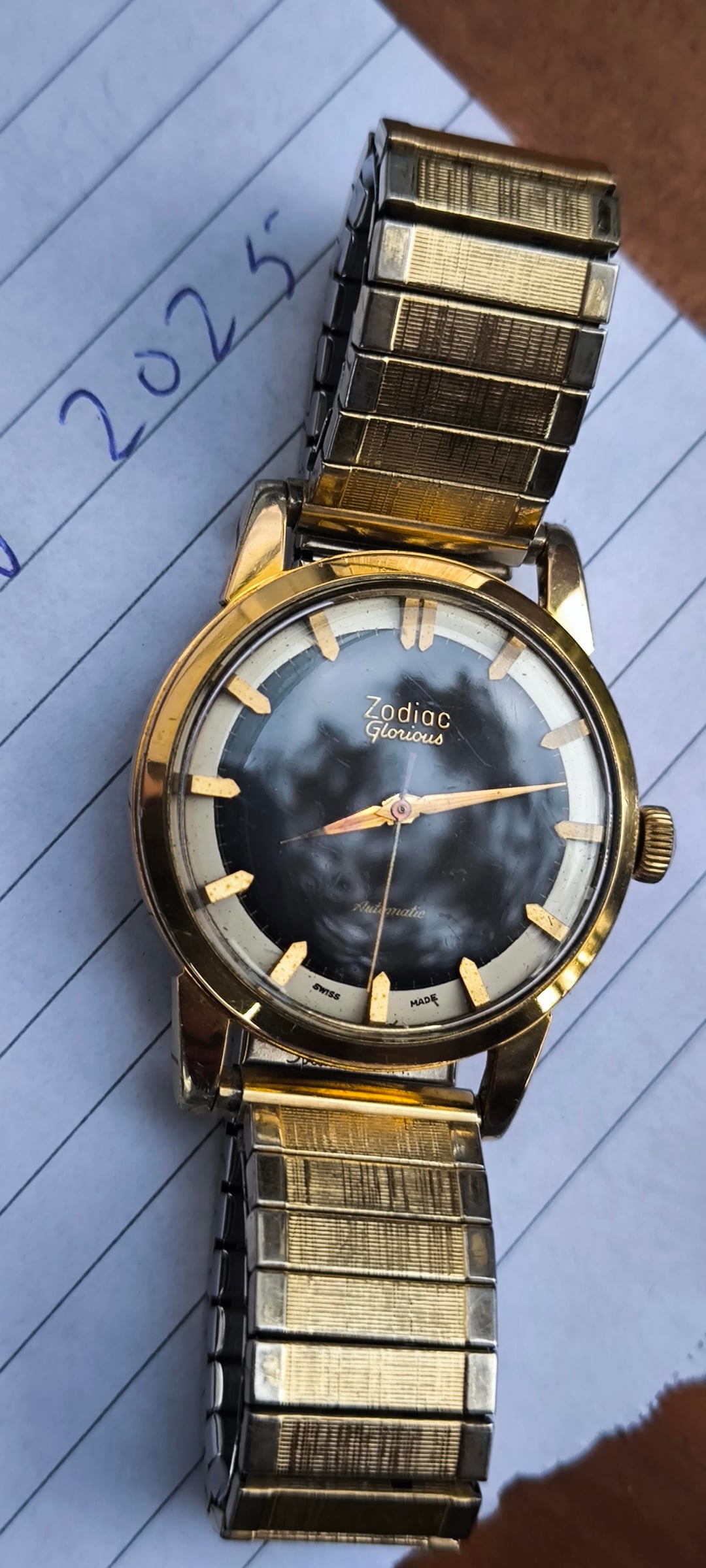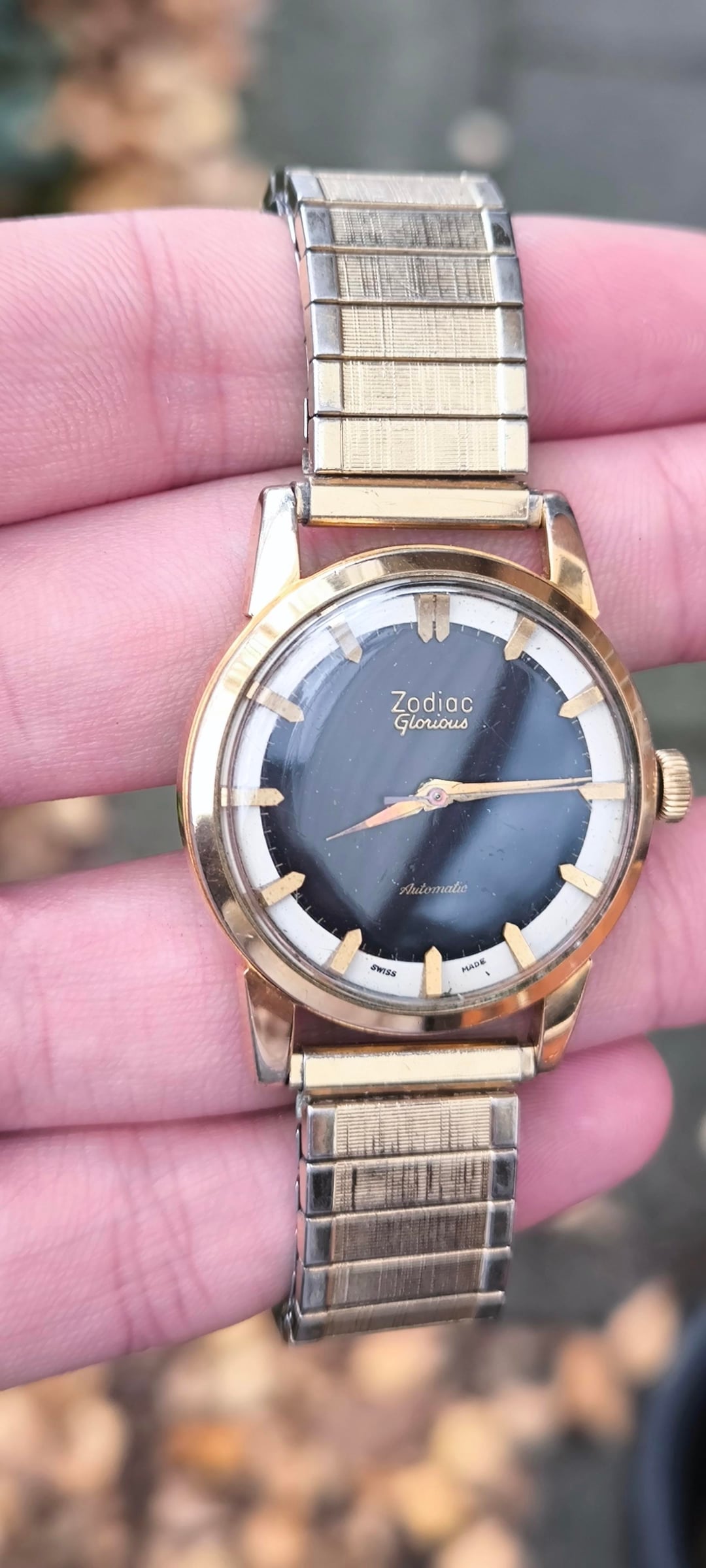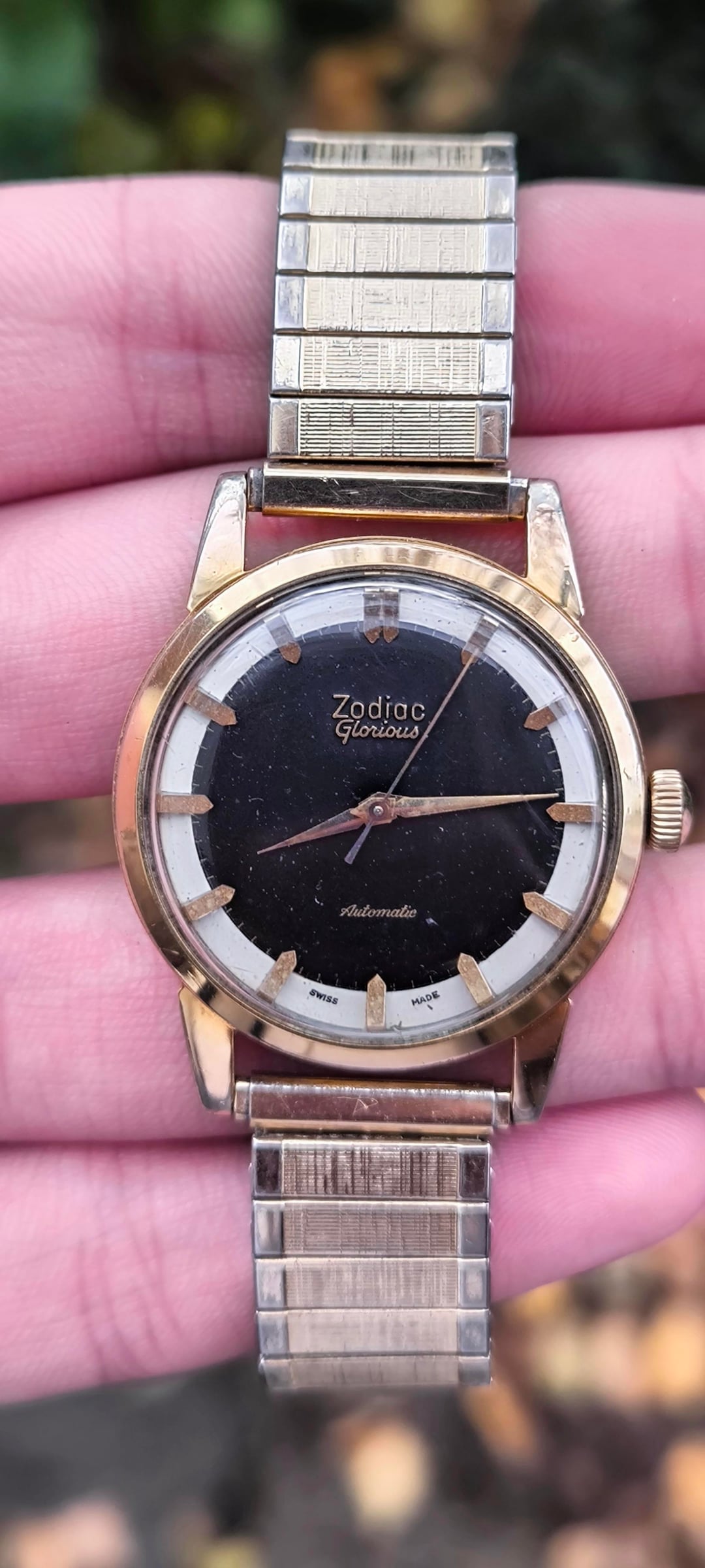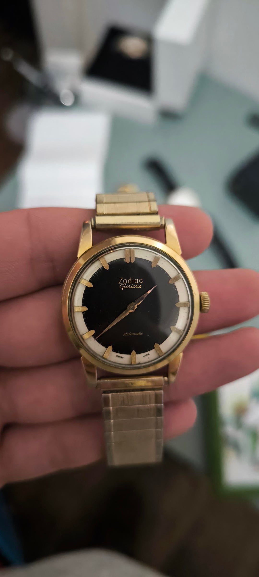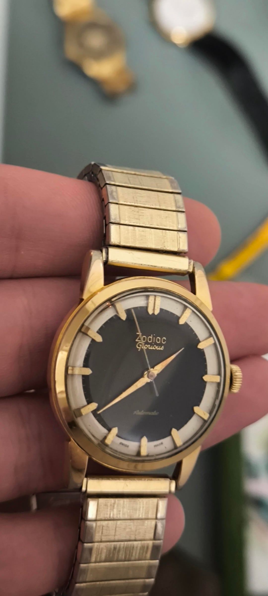 For sale: Zodiac Glorious Automatic Men's watch ref 688 (1950-1959). Other watchesfor sale: https://www.reddit.com/u/Ezodan/s/B83Xu0QO9E Condition: good/very good , some light scratches and light discoloration on the lugs but no deep scratches/marks/dents. Both automatic+manual winding functions work. Movement, case and dial are all in original condition, only the Speidel bracelet didnt originally come with the watch. Details: Men's model from 1950-1959 (65-75yr old), dimensions 34mm, 42mm lug to lug, 11mm thickness. Reference 688, cal. 1361, automatic winding + manual winding. Includes: Watch only + aftermarket NOS Speidel bracelet (can change this for a black strap upon request) Price: $385, + shipping Payment: PayPal F&F or G&S for anyone with at least 1 transaction/reference on watchexchange (+4,3% fee for the buyer). Shipping: Worldwide with tracking, signature for delivery and insurance (FedEx to the US). Ask me for a quote any time. Location: The Netherlands, Europe.