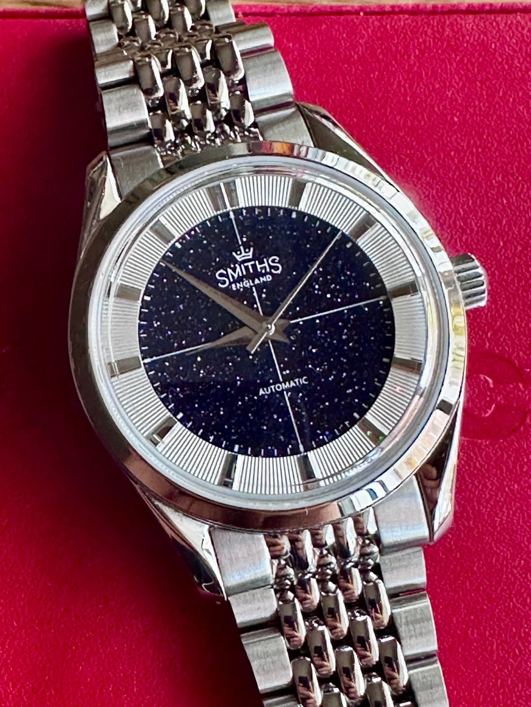 I have enjoyed this watch so much. The twinkling depth of the adventurine dial is never boring. It can be dressy or quite sporty with it’s 10 ATM, screw down crown and anti-magnetism. Asking $375. Comes with bracelet sized for 7” wrist, extra links, and travel case. Open to trades.