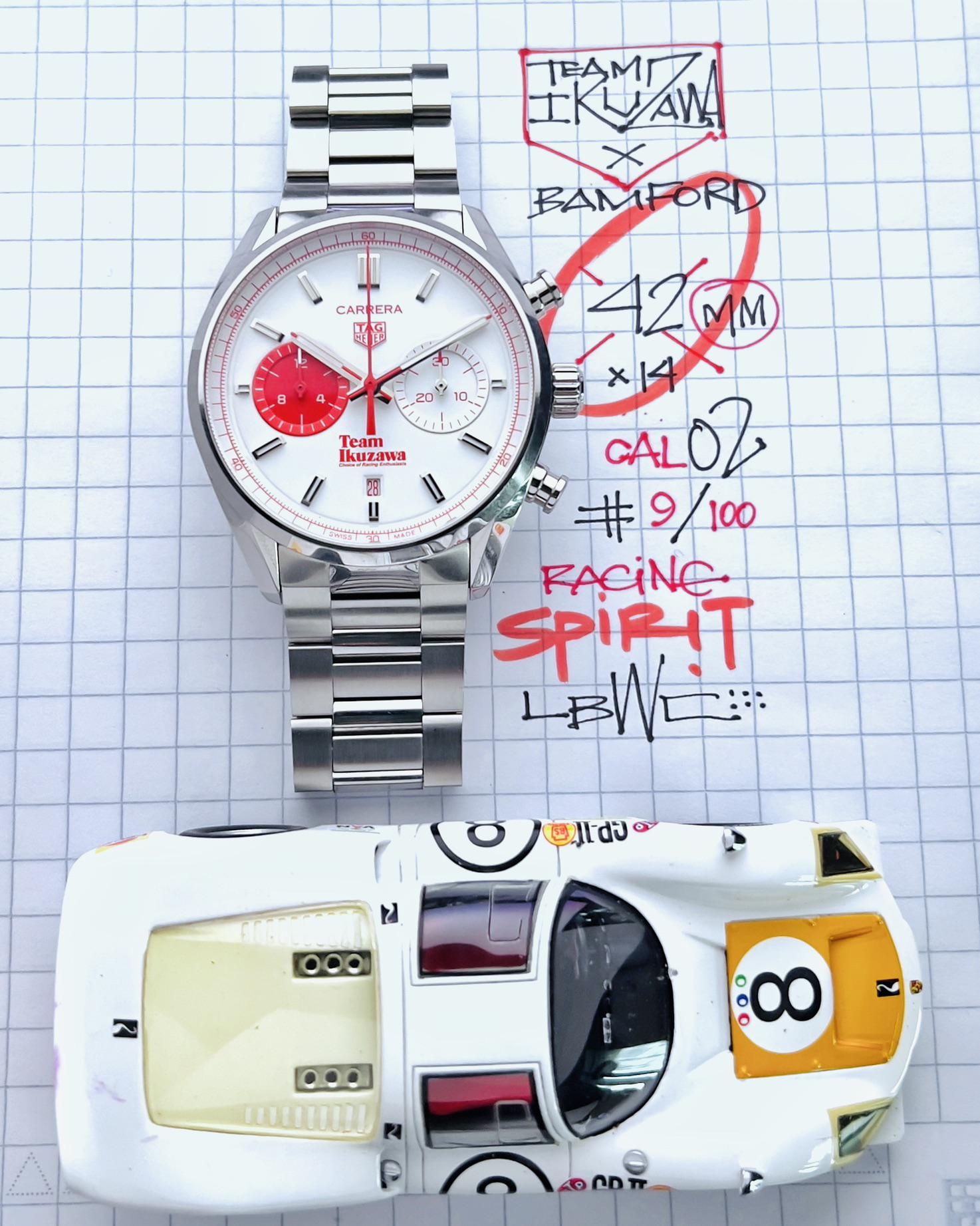 Tag Heuer Ikuzawa X Bamford Team Carrera ref. CBN201F.EB0356 Team Ikuzawa is a cultural brand and a modern racing team with a rich Japanese heritage, and this piece is tribute to Tetsu Ikuzawa a pioneer in Japanese racing. Today, his daughter Mai Ikuzawa's fashion and design bonafides, Team Ikuzawa carries the torch. The Carrera chronograph measuring 42mm X 14.3cc X 48h powered by the Heuer Calibre 02 Movement is not a traditional Glassbox—however— the white opaline dial rocks a red 60-second/minute scale at 9 and a minute chronograph counter at 3 anchored by a date at 6. This eye catcher comes full set: box, card, papers, extra strap and car. Overall, light wear but no damage. Videos and timegrapher: https://drive.google.com/drive/folders/1vGWfyzFToweXjXmZ6DPnWmRNeFW23HKI?usp=share_link Timestamp: https://imgur.com/a/12iLaE9 • Video is the best way to view the watch if in-person test drive is not available. Due to the different characteristic of the cameras and gadgets used, the color of the watch you purchase may not be the same as shown on this website or on our Instagram. * will consider trades that make sense but please consider time, shipping, and trade value—not market. - local special: can possibly accommodate at ButterScotch in Downtown Long Beach by appointment - All sales final unless the watch is misrepresented or lost in transit (always fully insured) - Link to [feedback here](https://www.reddit.com/r/WatchExchangeFeedback/search?q=soycowboy&restrict_sr=1&sort=new) & [watchcharts here](https://watchcharts.com/repcheck/user/soycowboy?source=reddit&type=feedback) Asking a *negotiable* **$5999** via bank wire, Zelle, or venmo. Price includes fully insured Fedex shipping in the USA— hand delivery in Long Beach with drinks or coffee on me ;). Cheers, Stephen