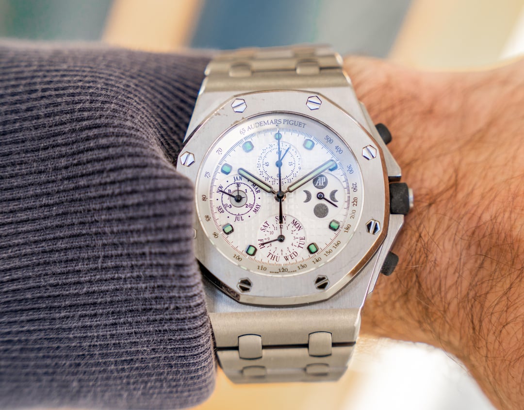 AP PERPETUAL CALENDAR OMG OMG OMG UNDER $60K What a nice little thingy. Actually it’s a big thingy. And it’s titanium. So it’s light. Royal Oak Offshore Perpetual 25854TI.OO.1150TI Thingy thingy etc etc etc Has papers dated 2016 $50,001.5 + label or trades which can be considered cool