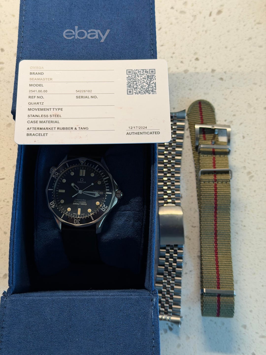 Omega Seamaster 300m 2541.80 41mm. Watch & eBay authentication. Comes on AM leather + AM NATO & jubilee bracelet. Quartz. **$1675** / Zelle, Venmo, or WU accepted. Timestamp: https://imgur.com/a/lNlfUfq I have **tons** of references on multiple platforms including WatchExchange. We also are a 5-STAR rated business on Google!