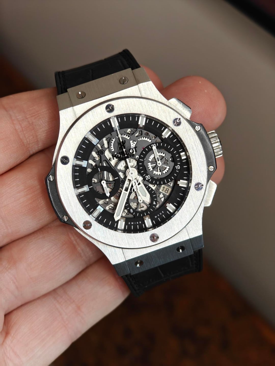 Up for sale is a Hublot Big Bang Aero Bang Ref. [311.SX.1170.GR](http://311.SX.1170.GR) — a 44mm skeleton-dial chronograph that blends industrial design with bold wrist presence. The openworked dial reveals the HUB4214 automatic movement beneath, framed by a brushed stainless steel case and black ceramic bezel. This example comes with 2013 papers, original receipt, booklets, and everything pictured. Just polished and looking sharp. Running strong and ready for wrist time. A statement piece with unmistakable Hublot DNA. 📐 **Specs**: – Ref. [311.SX.1170.GR](http://311.SX.1170.GR) – 44mm stainless steel case – Black ceramic bezel – Skeletonized dial with chronograph layout – HUB4214 automatic movement – Black hybrid leather/rubber strap with deployant clasp – Sapphire crystal front and back – 100m water resistance – 2013 papers, original receipt, booklets — all pictured – Just polished, great condition 📦 **Terms**: – 6,800 shipped & fully insured – Wire or Zelle only – Trades welcome — RLX, AP, Omega, IWC, Panerai, etc. – Plenty of references available – Located in Massachusetts – Happy to provide timestamped pics or video call to confirm condition 🔥 Bold skeleton chrono with industrial edge — perfect for collectors who want wrist presence and full set provenance DM with intent or comment below. Serious offers only. #Hublot #AeroBang #BigBang #SkeletonChrono #TradesWelcome