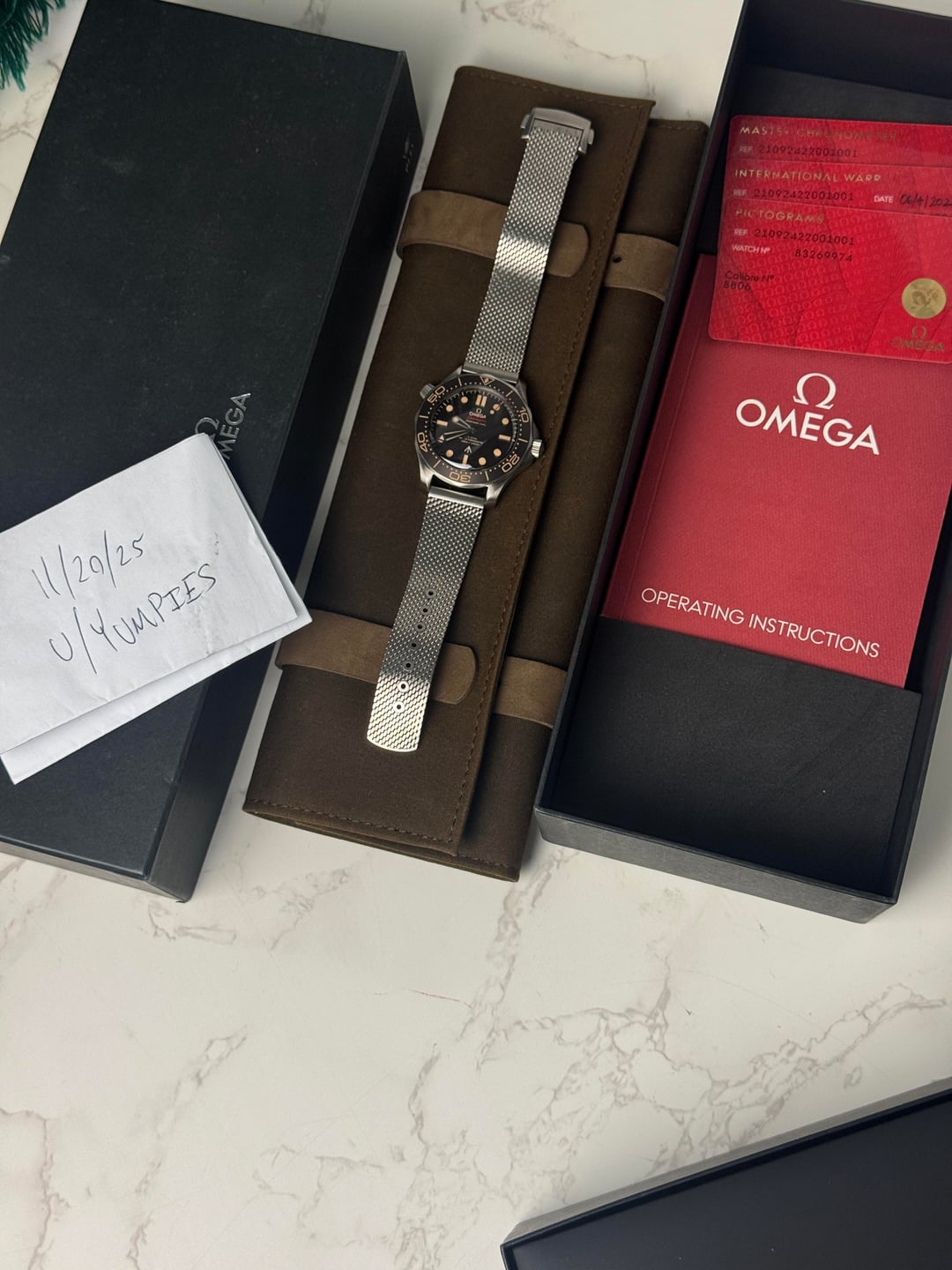 🧭 🤎OMG Seamaster 42mm “No Time To Die” NTTD 210.92.42.20.01.001 (born NATO, comes with OEM Mesh instead) 🧼 Great Pre-Owned Condition | Slight wear on bracelet and clasp | very faint mark towards the edge of the crystal by the 3 o’clock marker 📦📝 Watch | OEM Mesh | Double-Boxed | Manual | 2023 Card | Pictogram Card | Master Chronometer Card ⚙️ Just serviced 11/2025 (Lubrication) ; +3 s/d 275+ AMP 💲7500 Shipped Overnight! 💵 Wire | Zelle | Venmo | Crypt0 + 1.5% 📍 Phoenix, AZ 🌵 🤝 Trades are accepted (RLX, TDR, ZNT, OMG, and GS) 🙋♂️Feel free to message me if you have any other questions or would like to see more pictures, I would be more than happy to help. ✅ References available upon request. 📸 Talha.csc