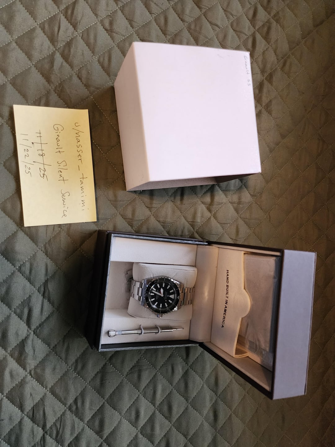 If you’ve ever held or wore a Ginault then you’ll know that the quality is unparalleled for watches costing even 5x as much. This is a no date version for a more balanced and cleaner design and has the diver bezel. Watch is in **excellent condition** (9/10) as you can see from the pics. Case, sides, bezel and crystal are flawless. The bracelet shows very light signs of wear; sides of clasp are very clean – top of clasp has barely perceptible scuffs from normal wear. I love this watch but I need to fund an order I just placed with John at Ginault for his new Trans-Atlantic model, so not accepting trades at this time. I purchased this SS exactly 3 years ago – Nov 22 2022. Full kit and sized for 7.25” wrist. For those less familiar with the Silent Service The specs are: · 41mm Diameter, 20mm Lug to Lug, 47mm Wingspan, 12.1mm Thin. · Sapphire Crystal Bezel with Luminous Indicator. · In-House 6 Weeks Regulated Sellita SW200-1 Elabore Grade Caliber. · No Date w/ Diver bezel. Located in Central New Jersey. **Price to sell at $900. Free shipping to CONUS. I can do Venmo but prefer PP FF or PP G&S (+3.5%).**