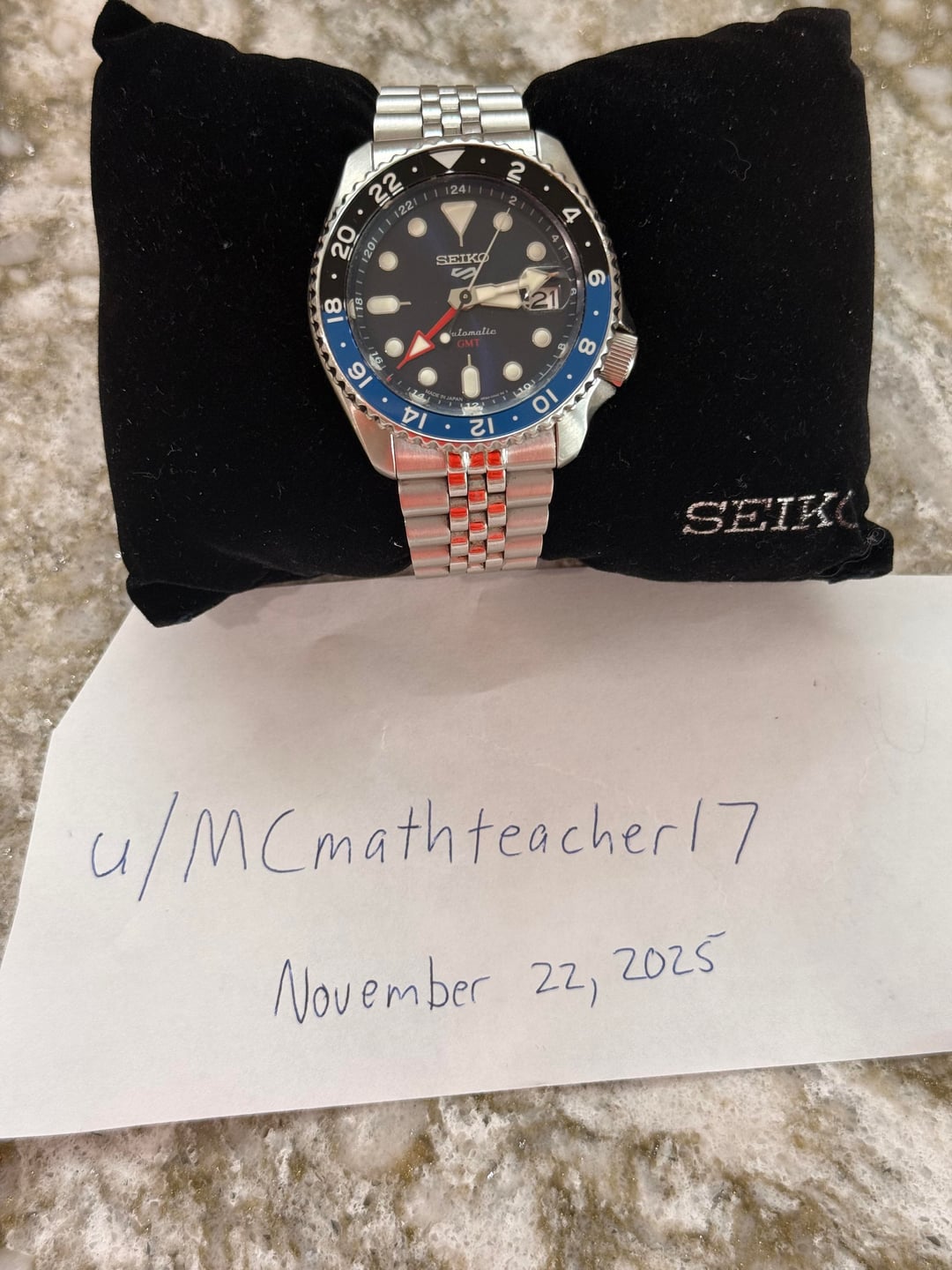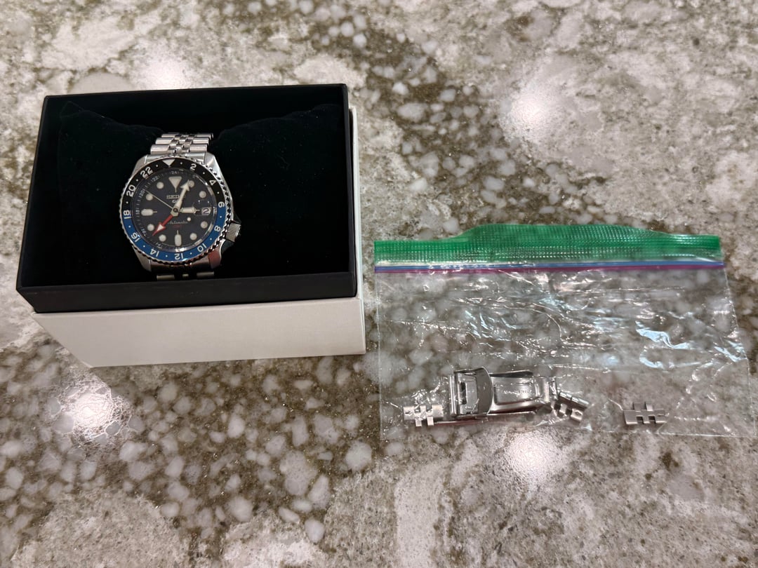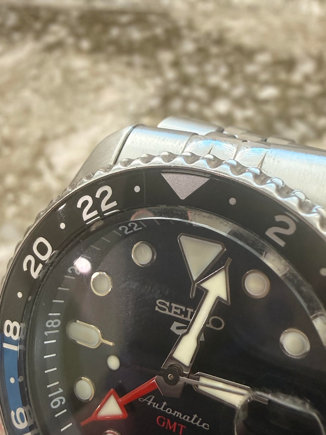 I am selling my Seiko 5 GMT SSK003. The bracelet has normal blemishes from being worn regularly. There is a scratch on the bezel around the 23 hour mark. I tried to capture it in photo. Other than that the crystal looks good. The watch has an adjustable clasp on it currently, the original clasp and extra links will being glided also. Asking $225 payment via Zelle F&F. Please don’t hesitate to reach out with any questions.