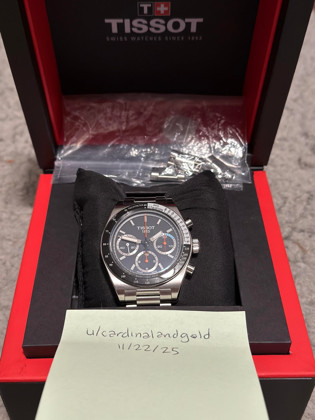 Up for grabs today is my Tissot PR516 Mechanical Chronograph with the classic and sporty black dial — a modern reinterpretation of a racing icon from the 1970s. 🔥 Specs: • Model: Tissot PR516 Mechanical Chronograph (Ref. T149.459.21.051.00) • Movement: Hand-wound mechanical chronograph (Valjoux A05.291) • Dial: Black with silver subdials, tachymeter scale, and vintage-style Tissot logo • Case: 41mm stainless steel with brushed/polished finish • Crystal: Sapphire with anti-reflective coating • Bracelet: Integrated stainless steel bracelet with quick-release • Water Resistance: 100m 💰 Price: Looking to get $950 OBO (MSRP on the watch is currently $2100 + tax directly from Tissot, so this deal is >50% off new. Unlikely to accept a trade on this one, but feel free to shoot your shot. 💬 Condition: The only thing to note is a tiny fleabite on the bezel around the 70 marking on the tachymeter scale around 10 o’clock. When I reached out to Tissot, they said the price for a bezel replacement would be $70-80, including installation. Watch has been priced to reflect this minor cost. You could always also just live with it until the watch needs a service and get it taken care of then, as it is not very noticeable on wrist. Other than that, the watch is in great condition and running well (3-4 secs/day, YMMV). See the pictures for an accurate representation of the watch’s condition. 🎯 Why it’s special: The PR516 is a faithful tribute to Tissot’s racing heritage, blending vintage aesthetics with modern reliability. The mechanical chronograph movement adds a tactile, enthusiast-driven experience that's rare at this price point. 👍 Reviews: Someone please take this absolute steal of a deal off my hands—promise you won’t be disappointed as the watch is even more stunning in person. In my opinion, this id the best watch in Tissot’s entire catalog. But don’t just take my word for it— [Hodinkee](https://www.hodinkee.com/articles/the-tissot-pr516-mechanical-chronograph-makes-its-case-as-the-best-chrono-under-dollar2000) has called the PR516 mechanical one of the best chronos under $2K. 📦 Includes: Watch and box only (no papers). The watch includes 7 full links. 📬 Shipping and Payment Methods: To be shipped via USPS priority. Buyer to pay shipping (including insurance, if desired). Would prefer PayPal F&F (G&S only available for established members with a decent number of transactions/history, with the buyer paying any fees). I’m also happy to take any additional pictures to show you the condition of the watch so you feel comfortable with your purchase. I’ve also had several successful transactions on Watch Exchange, both as buyer and seller, all with great feedback, so you can deal with confidence!