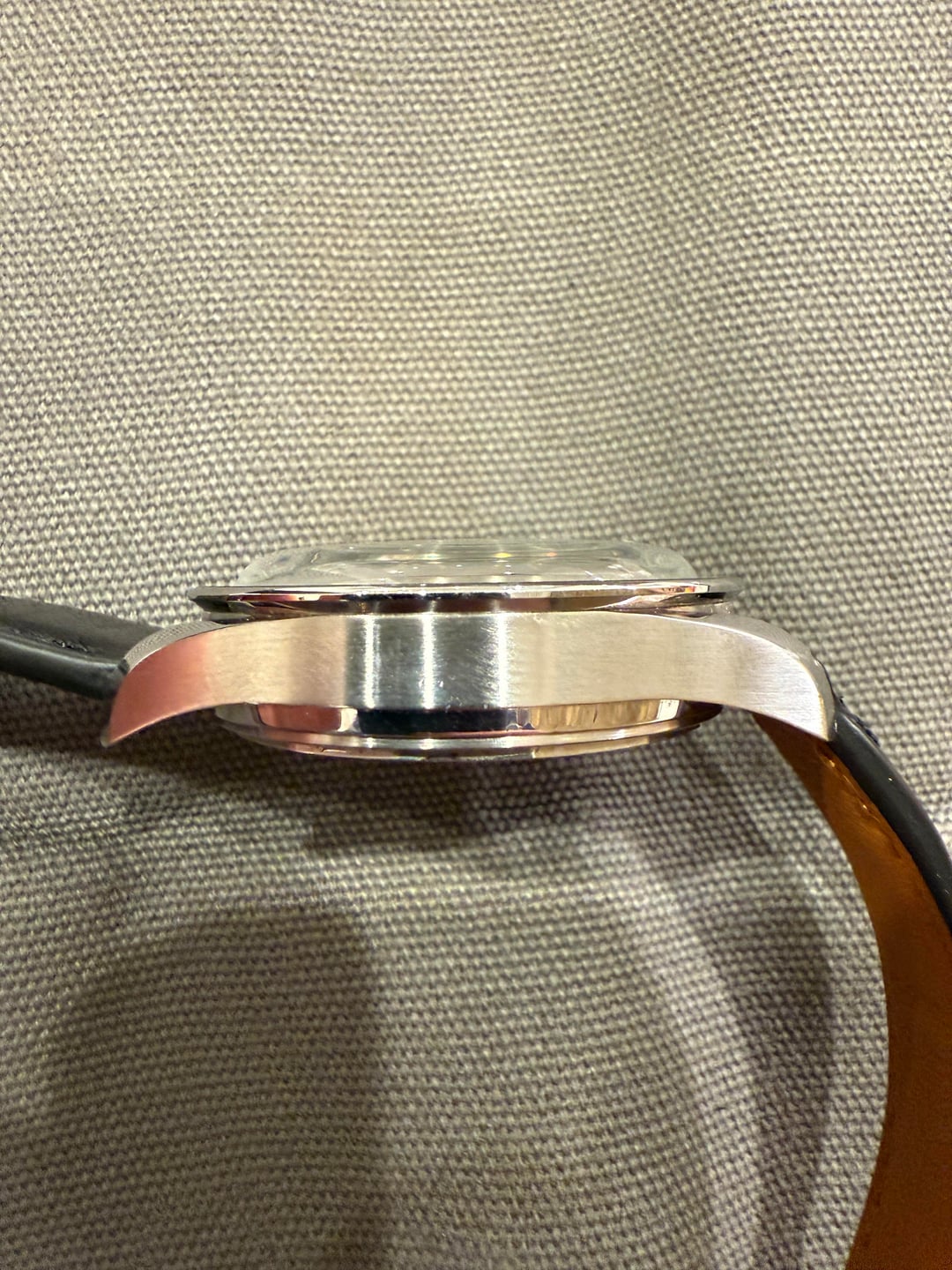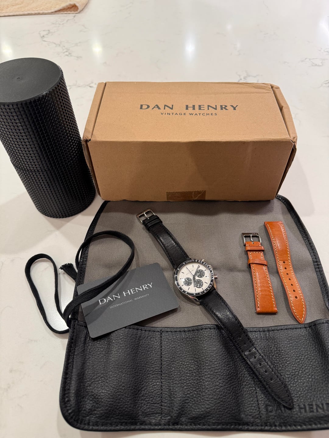 For sale is my 1962 Dan Henry chronograph in the panda colorway. Comes with the full packaging and an extra tan strap. The watch was purchased about 3 years ago and was rarely worn outside my home. I was the second owner of the watch and it is in good condition, with some scratches on the case back from battery change but nothing noticeable on the front. I just changed the battery. Fun little watch that is a nice homage to the Universale Geneve “Nina Rindt” chronograph. Size is great but just didn’t get much wrist time. Asking $225 shipped. No trades. Let me know if you have questions or want additional info.