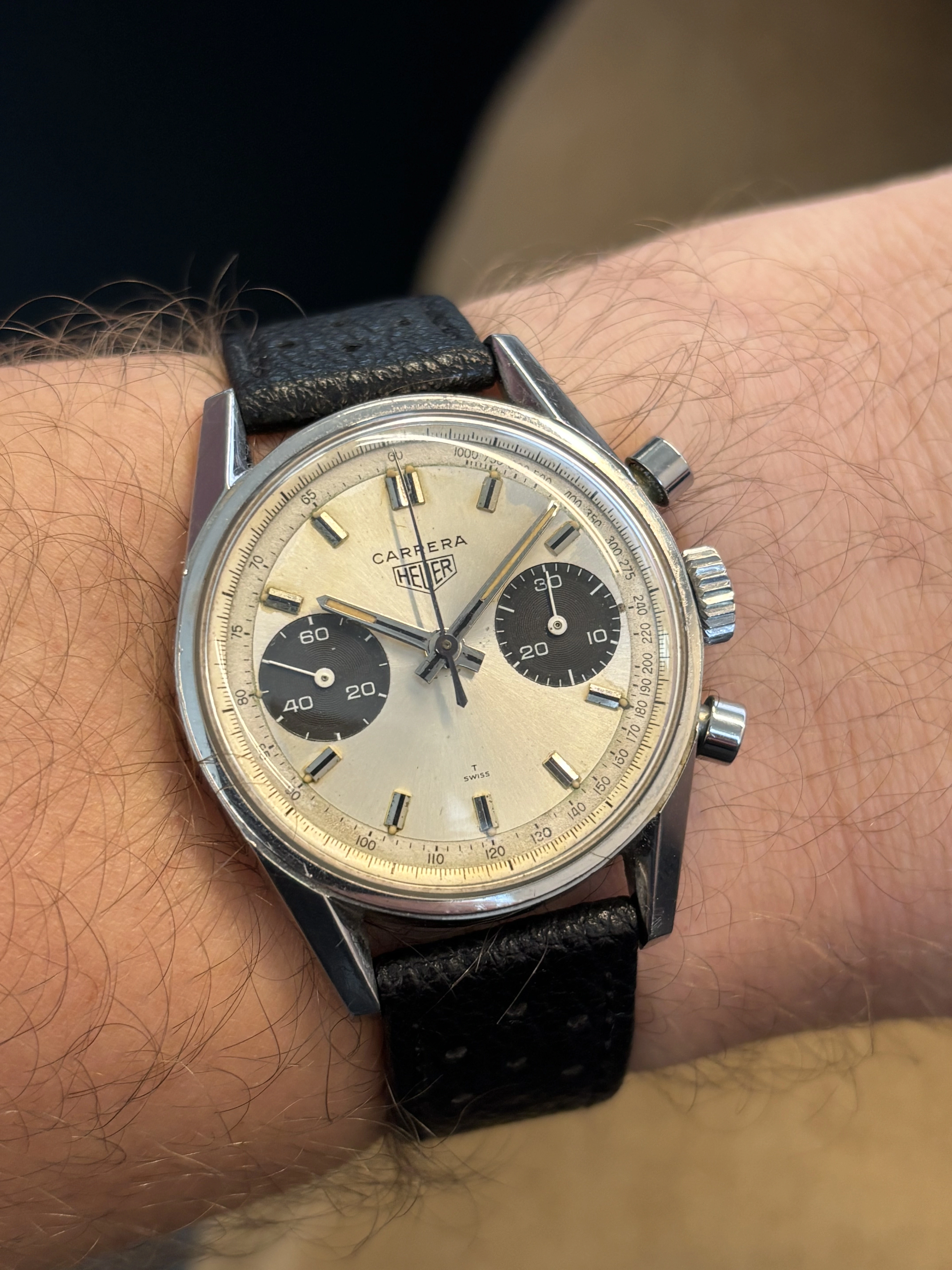 Selling my Carrera 7753 SNT panda dial with tachy track. 7733 power, circa 1968. Great condition with all movement functions working crisply and properly. The chapter ring needs to be rotated a touch back into position.