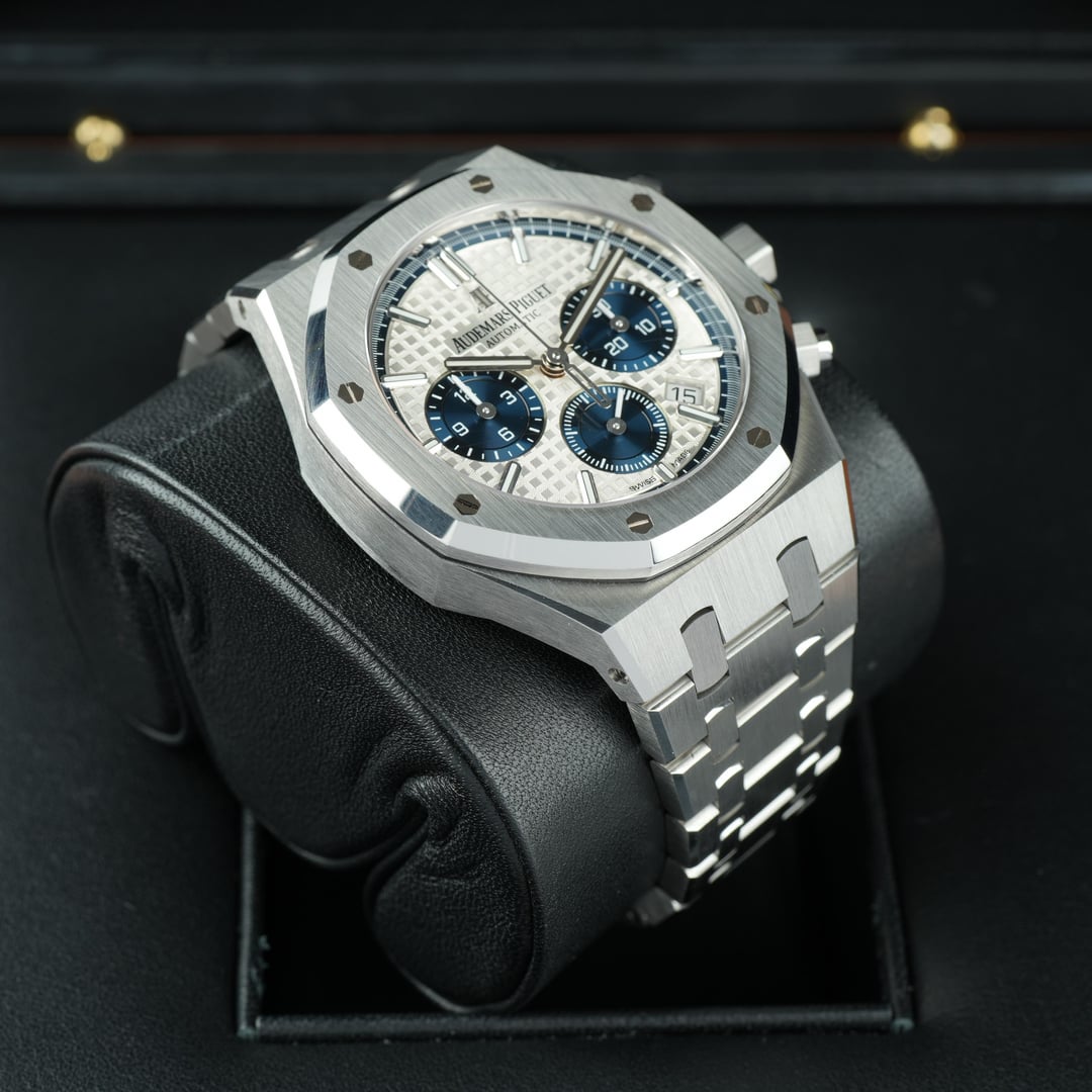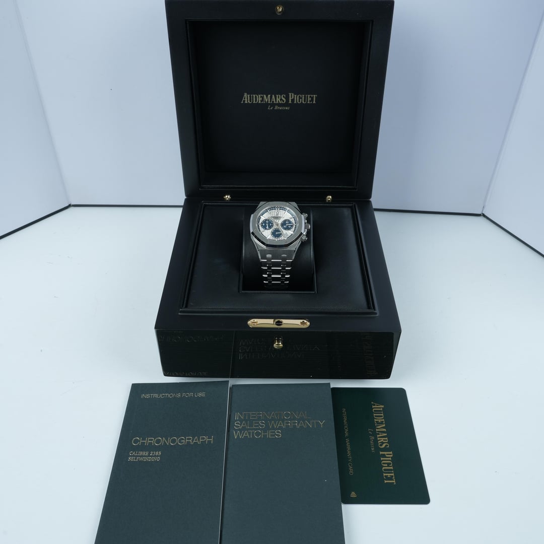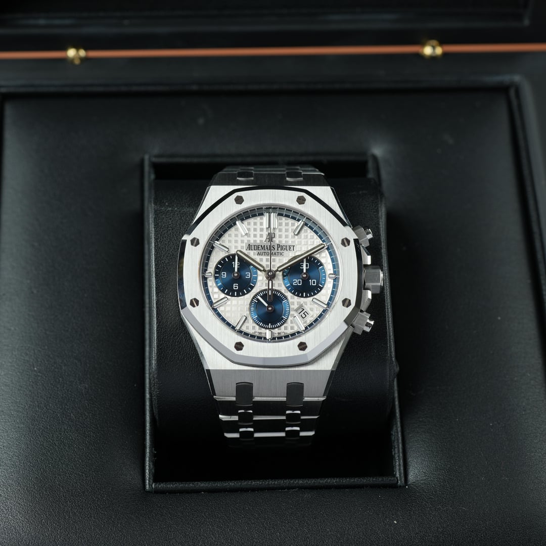 2020 Audemars Piguet Royal Oak Chrono Silver Blue Panda 38mm Steel 26315ST Complete Timestamp: [https://imgur.com/gTIJWu5](https://imgur.com/gTIJWu5) The Audemars Piguet Royal Oak Chronograph 38mm (Ref. 26315ST.OO.1256ST.01) is a masterpiece that blends timeless design with modern elegance. The striking silver-toned “Grande Tapisserie” dial is adorned with contrasting blue sub-dials and luminescent hands, offering both functionality and aesthetic appeal. Powered by the reliable self-winding Caliber 2385, this chronograph boasts a 40-hour power reserve and is water-resistant up to 50 meters, ensuring durability and precision. Comes as a complete set with Inner/Outer box, booklets, and warranty card. This timepiece is overall in mint condition. Please look at my pictures as I like to fully represent the exact condition of the watch through my photography. **Offered at $54,999 shipped in US or OBO.** Payments accepted: Wire or Direct Bank Transfer (Bank of America). Shipping is always FedEx/UPS overnight, fully insured. I am an avid enthusiast and collector and am not affiliated with any watch brand I post. **Always open to trades or purchases! Looking for Audemars Piguet, Rolex, Patek Philippe, FP Journe, Vacheron Constantin, and other luxury brands.** I guarantee every watch I sell to be 100% authentic. Follow me on IG: JJ\_Timepiece\_Co Call or text (941) 800-3931