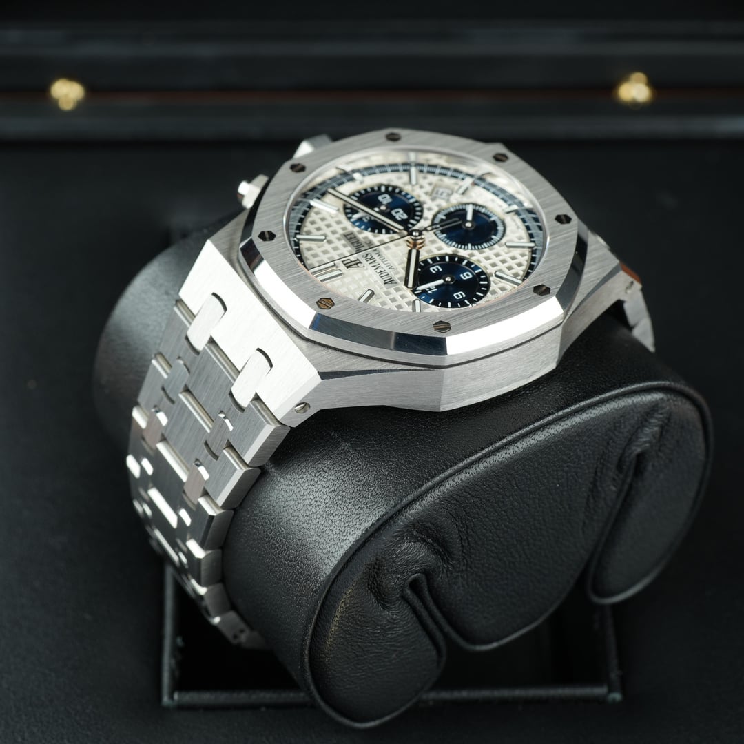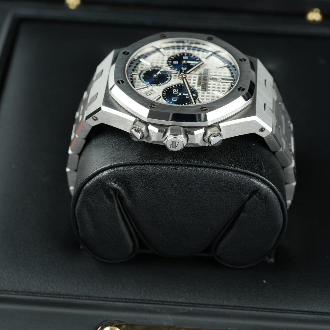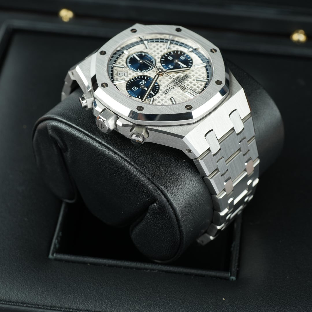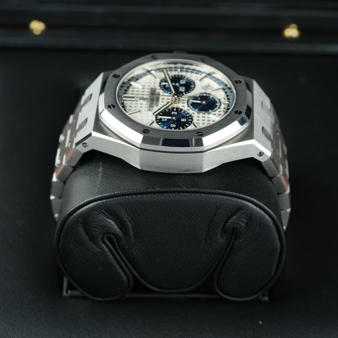 2020 Audemars Piguet Royal Oak Chrono Silver Blue Panda 38mm Steel 26315ST Complete Timestamp: [https://imgur.com/gTIJWu5](https://imgur.com/gTIJWu5) The Audemars Piguet Royal Oak Chronograph 38mm (Ref. 26315ST.OO.1256ST.01) is a masterpiece that blends timeless design with modern elegance. The striking silver-toned “Grande Tapisserie” dial is adorned with contrasting blue sub-dials and luminescent hands, offering both functionality and aesthetic appeal. Powered by the reliable self-winding Caliber 2385, this chronograph boasts a 40-hour power reserve and is water-resistant up to 50 meters, ensuring durability and precision. Comes as a complete set with Inner/Outer box, booklets, and warranty card. This timepiece is overall in mint condition. Please look at my pictures as I like to fully represent the exact condition of the watch through my photography. **Offered at $54,999 shipped in US or OBO.** Payments accepted: Wire or Direct Bank Transfer (Bank of America). Shipping is always FedEx/UPS overnight, fully insured. I am an avid enthusiast and collector and am not affiliated with any watch brand I post. **Always open to trades or purchases! Looking for Audemars Piguet, Rolex, Patek Philippe, FP Journe, Vacheron Constantin, and other luxury brands.** I guarantee every watch I sell to be 100% authentic. Follow me on IG: JJ\_Timepiece\_Co Call or text (941) 800-3931