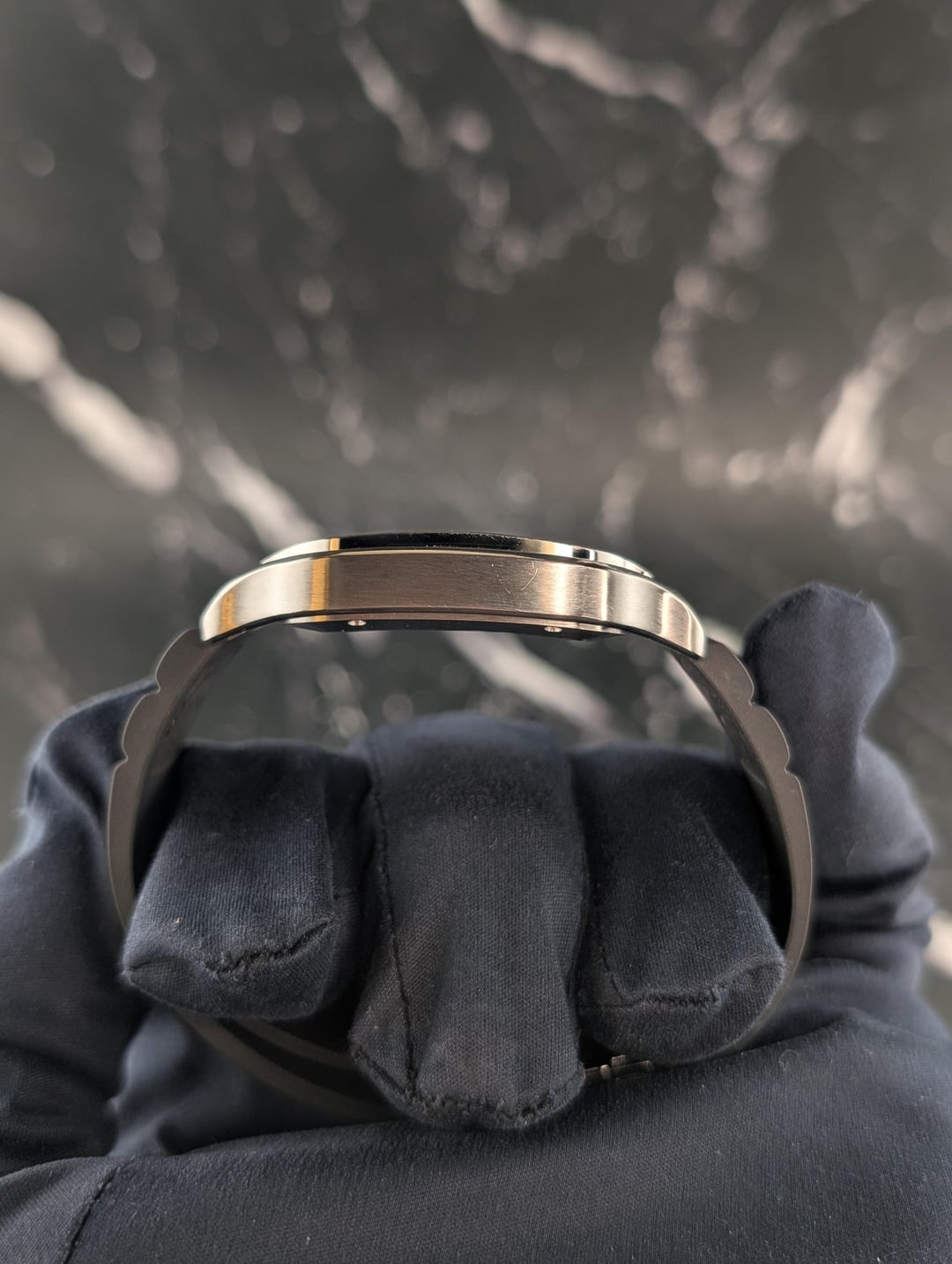 Available today from the Wrists Of Luxury Collection, is an all time great classic timepiece that needs little intro; The Cartier Santos. The Cartier Santos has been a standard for men's wristwatches since its birth in 1904, even while undergoing many transformations and updates. One of the most useful updates over the years is the quick change strap system, allowing you to go from bracelet to strap in seconds with no tools. Its classic elegance, blue faceted spinel crown, sporty signature screw down bezel and matching screws on the bracelet, its hard to mistake this piece for anything else. This exact watch, is the current generation Large model, with automatic movement and date window at 6 o'clock, and newer deployant clasp with easier strap adjustment than the previous generation WSSA0009. MSRP: $8650 + Tax Reference: WSSA0018 Model: Santos de Cartier Large Movement: Automatic Case size: 40mm Thickness: 9.4mm Water Resistance: 100m Year: 2024 Scope of delivery: watch, double boxed, warranty card, booklets, tool, case protector, stainless bracelet and OEM rubber strap This timepiece is in good pre owned condition. It has been polished at some point in its life, and remains in good shape with no major defects, just some minor hairlines on the high polished areas (please refer to photos for condition). Running and functioning as it should (see timegrapher photo). Warranty card is undated but watch is registered in Cartier's system with active warranty until 2032. Serial blurred for privacy, Available for $6525 including overnight fully insured delivery to your local FedEx location. Zelle/wire/CC+3%