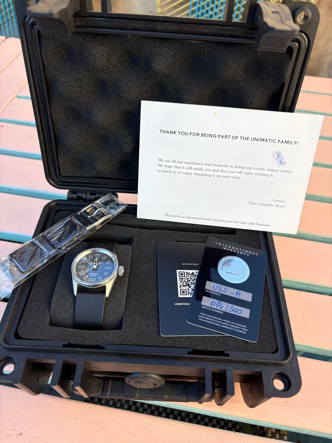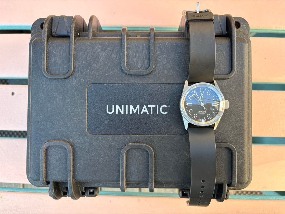 \*\*\*JUST REDUCED \*\*\* Must pay for new purchase lol UNIMATIC U5S-A Modello Cinque Limited Edition 36mm Automatic SW200-1 Full Kit - a truly unique piece with the their iconic tool-watch aesthetic in a compact, highly wearable 36mm case. Love this piece, but I unfortunately need to consolidate for my grail. Limited Edition: This is one of only 300 pieces ever produced. #074 / 300 is individually numbered on the warranty card and caseback. Condition: Mint / Near-Mint. Worn only a few times, with the case and crystal flawless. It is running perfectly. Complete Set: The watch comes as a true Full Kit, including the original tough case, all manuals, both original straps, and the uniquely ID-sealed warranty card (as pictured). Key Specifications • Reference: Modello Cinque U5S-A • Movement: Swiss Automatic Sellita SW200-1 b (28,800 VPH, 41-Hour Power Reserve) • Case Diameter: 36 mm (Smallest, most comfortable size from Unimatic) • Lug-to-Lug: 43.7 mm • Water Resistance: 300 Meters (30 ATM) (Secured by a screw-down crown) • Crystal: Double Domed Sapphire with interior AR coating. • Dial: High-Contrast Black/Dark Gray with a minimalist, legible aesthetic. Included Full Kit (See Photo) • UNIMATIC Modello Cinque U5S-A Watch • Original UNIMATIC "Tough Case" • Original \*\*Warranty Card\*\* (ID #074/300) • Original Black Tapered TPU Rubber Strap (Attached) • Original Black Calf Leather Strap (Still sealed in plastic) Asking 680USD shipped, CONUS only please. Happy to do a video call and answer any questions, thanks! Video here: [https://jmp.sh/NKDsxX9P](https://jmp.sh/NKDsxX9P)