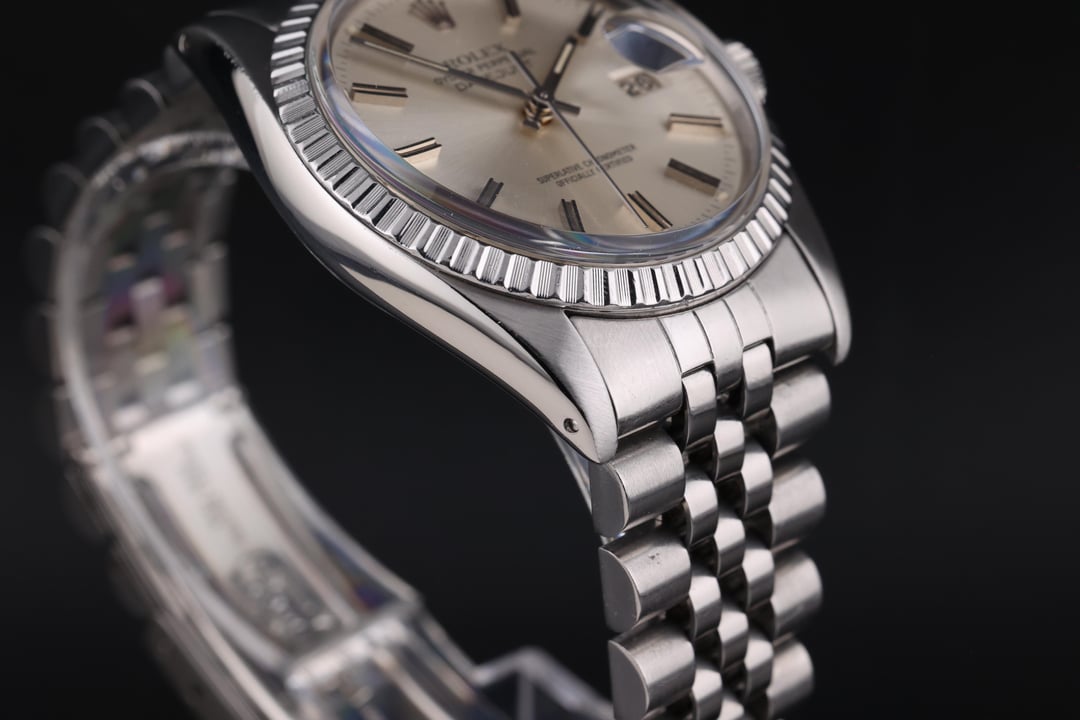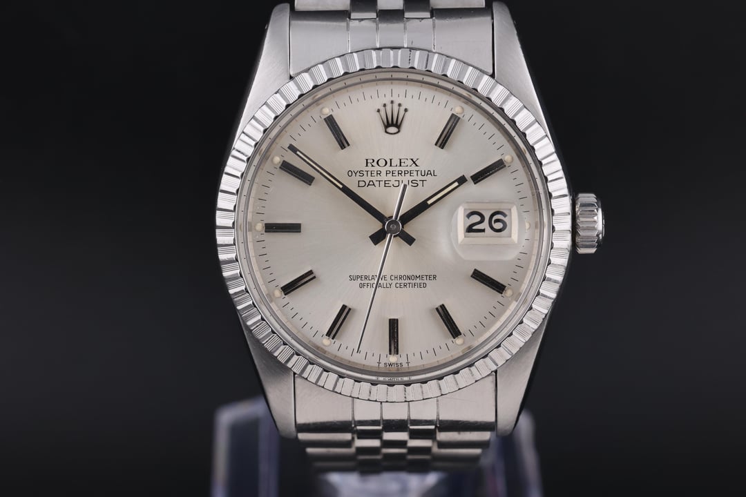 | Rolex Datejust Mens 1603 Stainless Steel Watch Engine-Turned Bezel Silver Dial beckertime (23919) |
