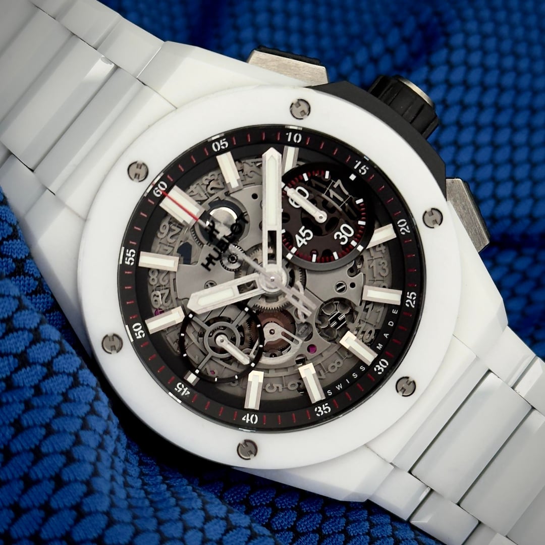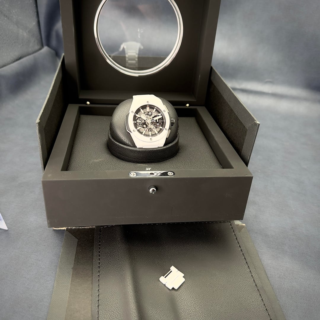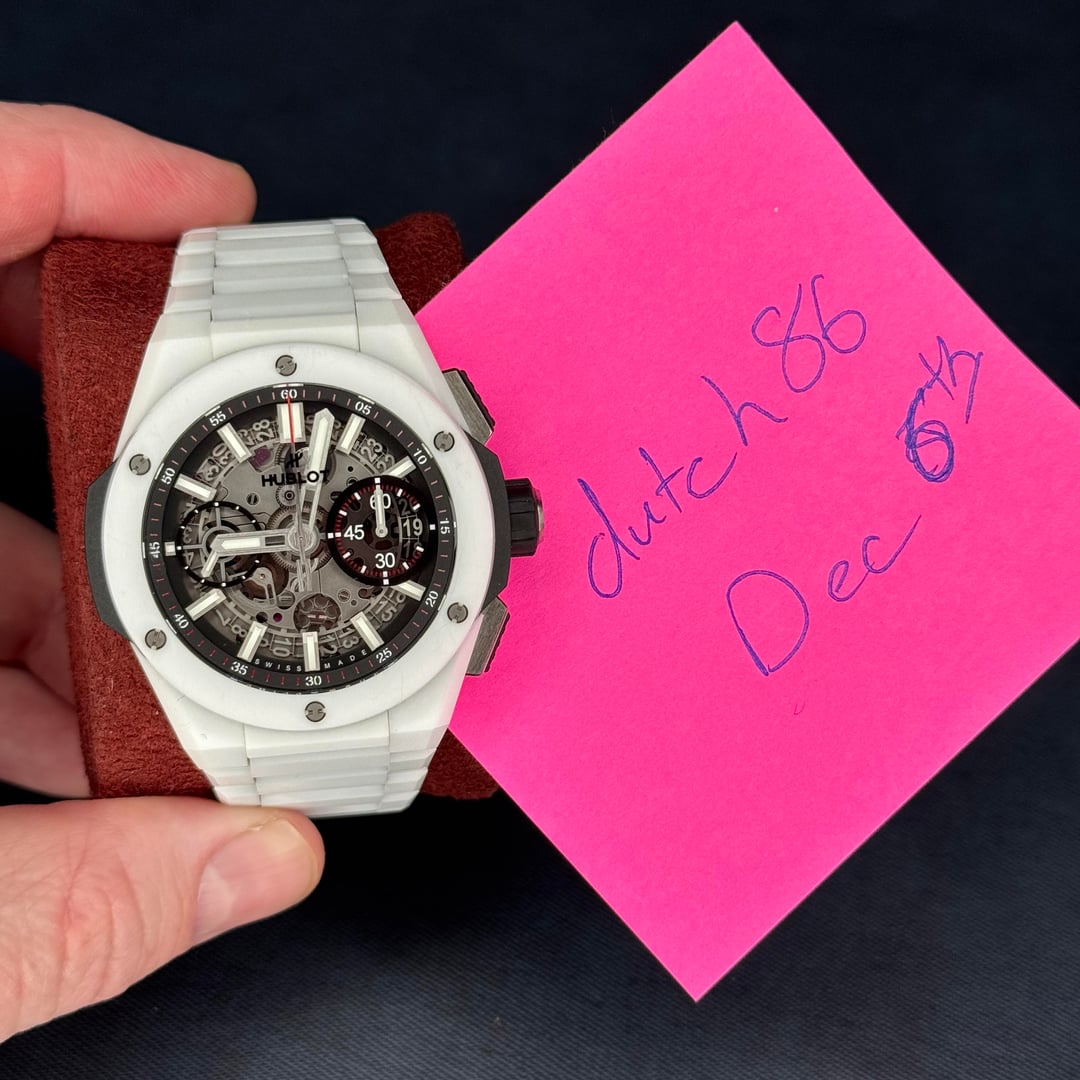 If you're looking for a fully ceramic watch where it doesn't cost as much as a house, there aren't a ton of options. Thankfully, Hublot has an option! With an original MSRP of over $25k, there's a ton of value here as well. The skeletonized chronograph movement is just the icing on the cake! This example includes the watch, outer box (flap is in bad shape) inner box, and extra links. The warranty for this watch was one of Hublot's e-warranties and was issued in 2021. This can be confirmed by the serial number through Hublot. Asking $11,500 The watch will be shipped, overnight, fully insured, with signature required, as soon as funds clear. As for myself, I have many references from buying and selling across the various forums, Reddit, WUS, TRF, and others that I would be willing to provide upon request. Feel free to reach out to me with any questions and I will do my best to answer! Thanks for looking and feel free to follow me on IG for more! @the.apex.co