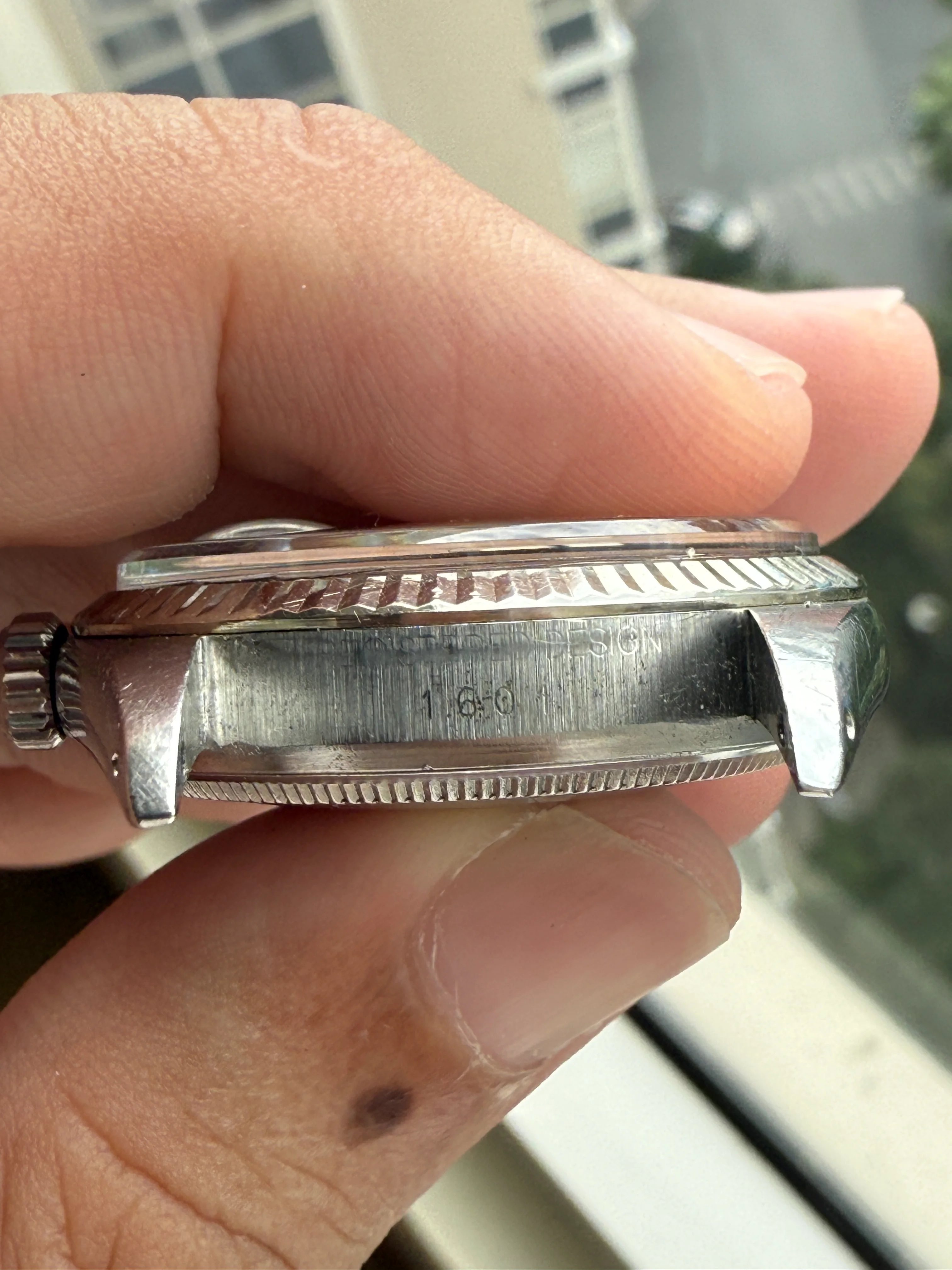- Case: The diameter is 36mm without the crown. Original case in good condition, white gold fluted bezel. Original screw-down crown. Serial number is 3338560, dated to 1973-1974.