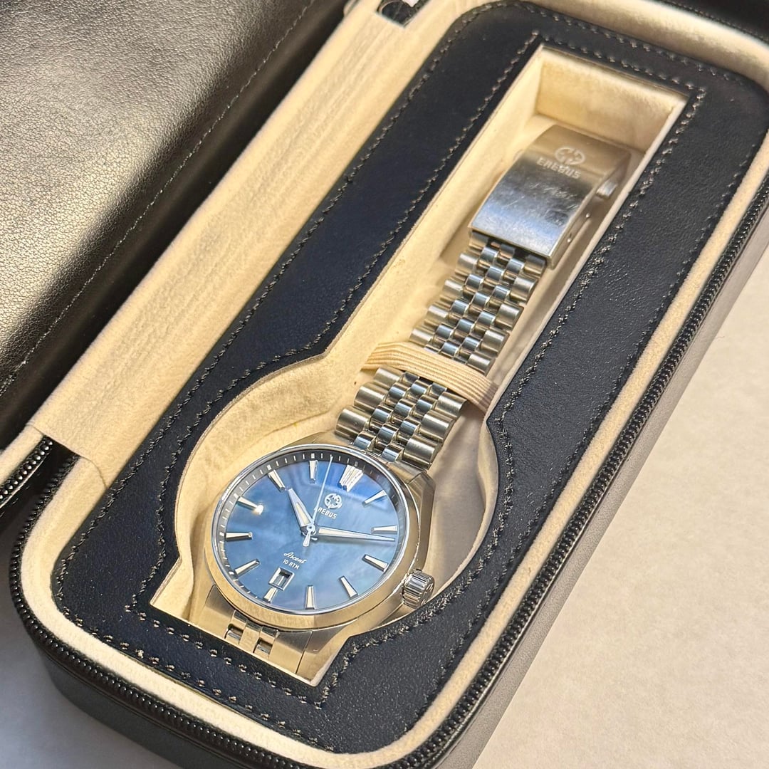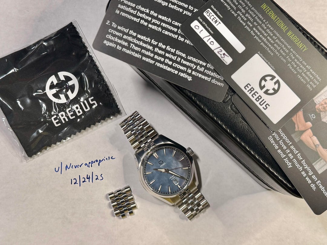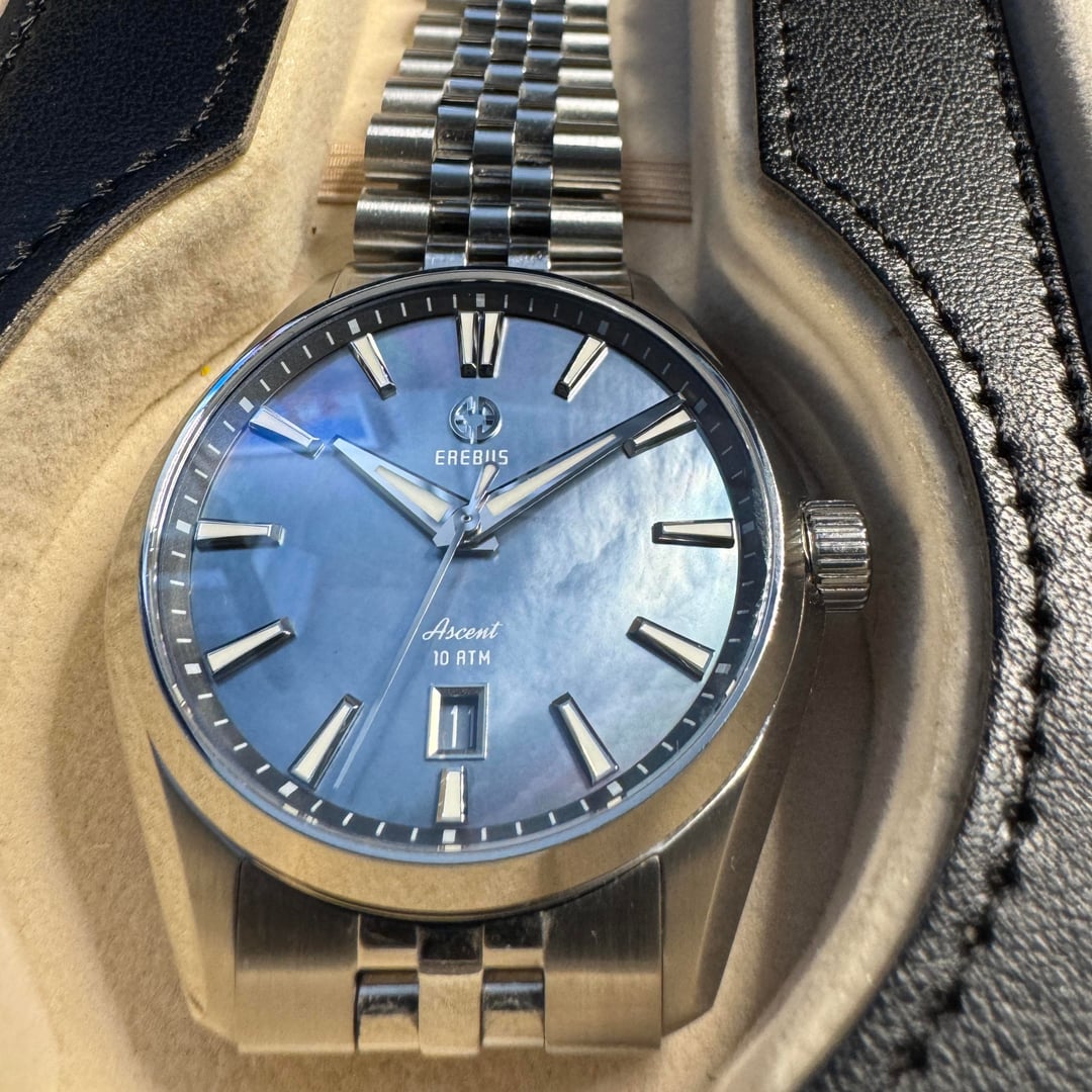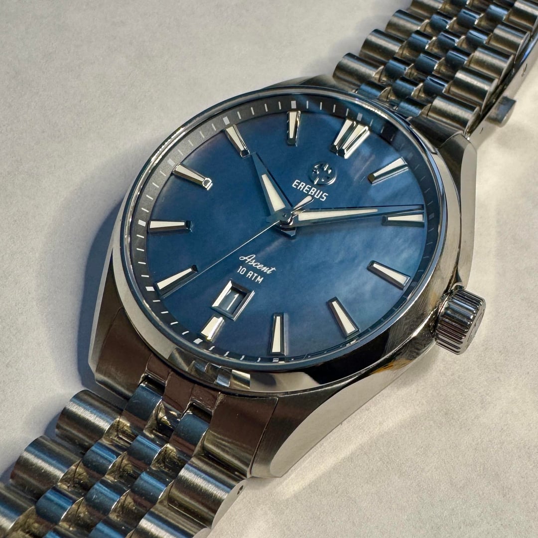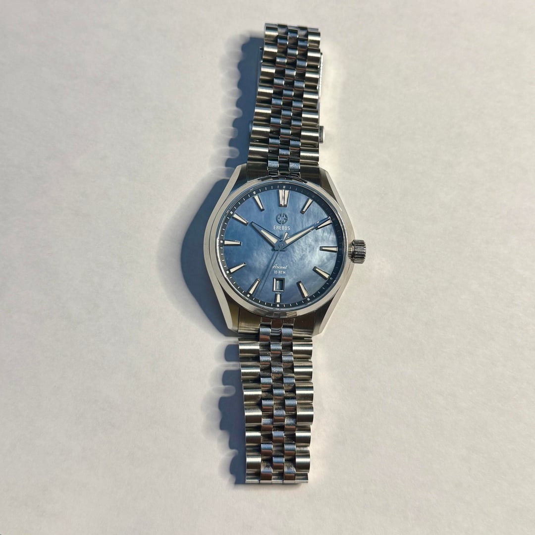 **Erebus Ascent – 41mm Blue MoP - $375** **Description:** * Model: 41mm Ascent * Dimensions: 40.7 mm x 47 mm x 11.2 mm * Lug width - 20mm * Movement: Miyota 9015 * Crystal: Double Domed Sapphire w/ clear AR Coating * Dial Color: Blue Mother of Pearl * Crown: Screw-down Crown * Case Back: Screw-down Case Back * J-style bracelet, w/ milled clasp and OTF adjustment * WR: 100 meters **Condition:** Regularly worn - in great condition. No dings, scuffs, marks, or scratches on case or crystal. Regular clasp rash w/ some bracelet scuffing. **Contents:** Full Kit - bracelet is sized for my 7.5"/19 cm wrist, but removed links are included. **Payment:** PayPal F&F or Zelle preferred: $375 PayPal G&S: $385 total to cover fees Price includes Shipping via USPS in CONUS from Tallahassee, FL. **Trades:** No trades at this time as I am looking to reduce my collection.