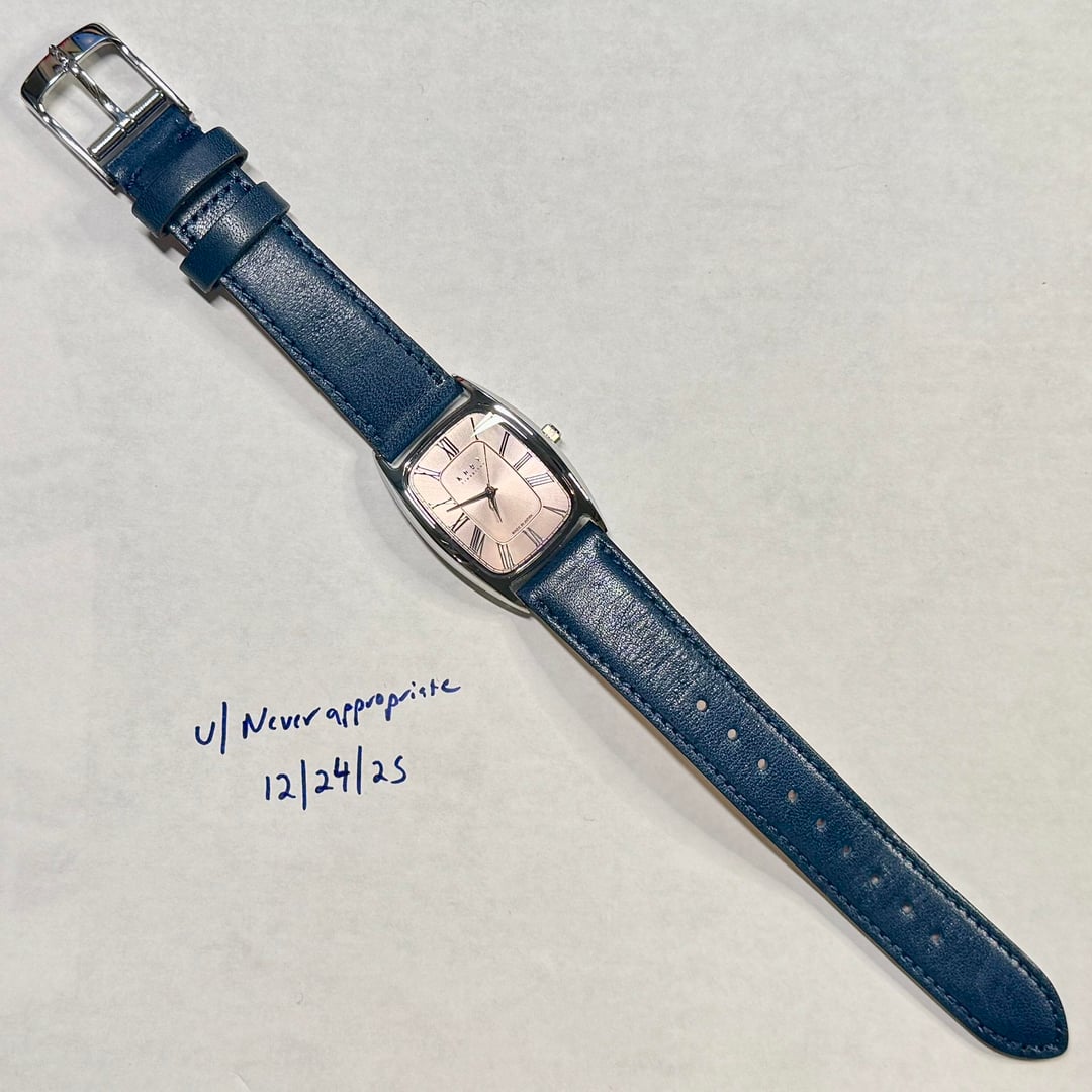 **Knot – Tonneau CT-27 - $105** I love a good art deco Tank-style watch and this is a classy little Japanese quartz. I have decided to slim down my collection and this one made the “pass along” list. It has a beautiful rose gold dial. **Description:** * Model: CT-27 * Dimensions: 27 mm x 38 mm x 7 mm with 18mm lug width * Movement: Miyota GL30 quartz * Crystal: Sapphire * WR: 30 meters **Condition:** Lightly worn– Great condition. No dings, scuffs, marks, or scratches on case, crystal, or strap buckle. **Contents:** Watch Only with OEM blue leather strap [https://en.knot-designs.com/en-us/products/ct-27svrg](https://en.knot-designs.com/en-us/products/ct-27svrg) **Payment:** PayPal F&F or Zelle preferred: $105 PayPal G&S: $110 total to cover fees Price includes Shipping via USPS in CONUS from Tallahassee, FL. **Trades:** No trades at this time as I am looking to reduce my collection.