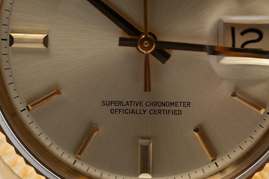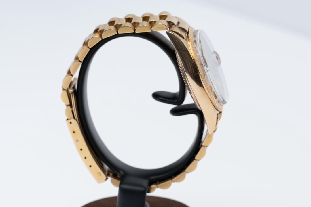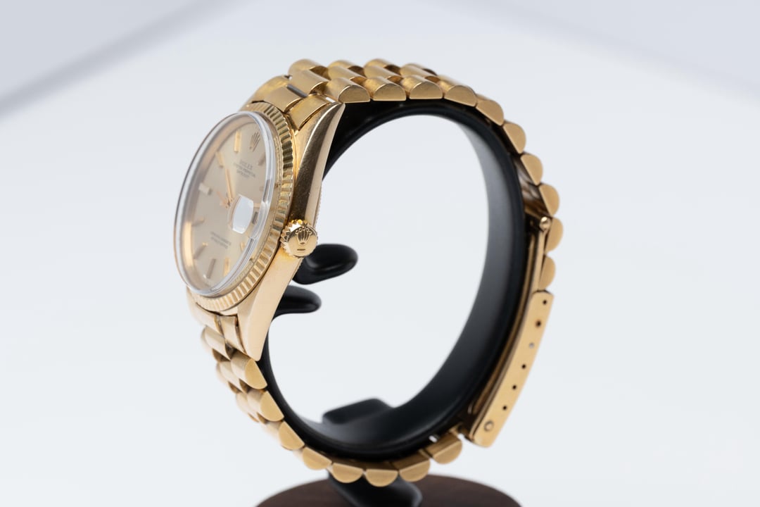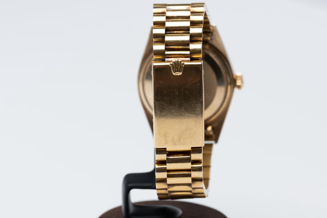 This one doesn’t whisper—it purrs. Yellow-gold case, fluted bezel striking light like a match, calm black-tie composure on the dial. Clip it on and the room changes temperature. The President bracelet drapes soft and heavy, like a promise you intend to keep. Acrylic up top gives that warm vintage glow. Serif print reads clean. Inside, a stubborn 15xx automatic that does its job whether you slept or not. Wind. Click. Set. At midnight the date snaps over like a shutter and gets on with the day. On the wrist it’s sharp and composed. The case sits low, the bracelet rolls with your pulse. Gold can be loud; this is controlled—presence without chest-beating. Condition Notes Flawless no lume dial Crystal is perfect Bracelet shows almost no stretch Offered at $13,000 wire (references available) email to [email protected] or text call +16192899258 Shipping & Returns Free, priority overnight insured shipping within the U.S. 3-day inspection window & returns allowed if watch is not as described Brand Rolex Model Datejust Reference Number 1601 Year 1970 Case Size 36mm Case Material Yellow Gold Crystal Acrylic Crystal Dial Gold Bracelet Gold Presidential Movement Automatic Water Resistance Pressure Tested - Passed Box/Papers Watch Only Condition Excellent