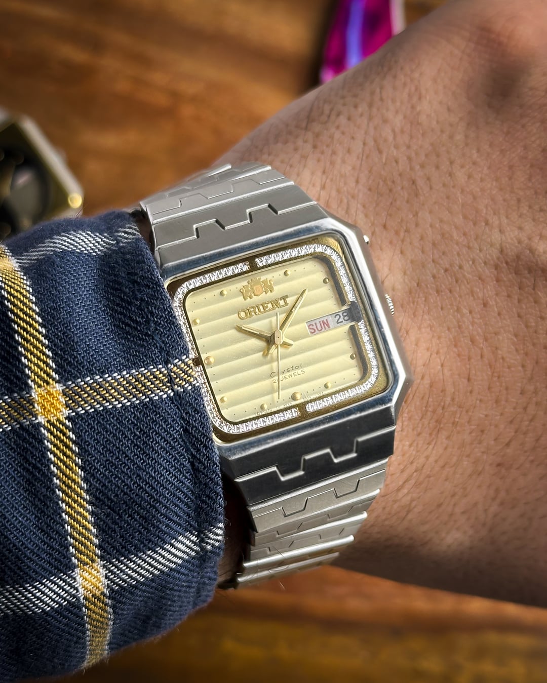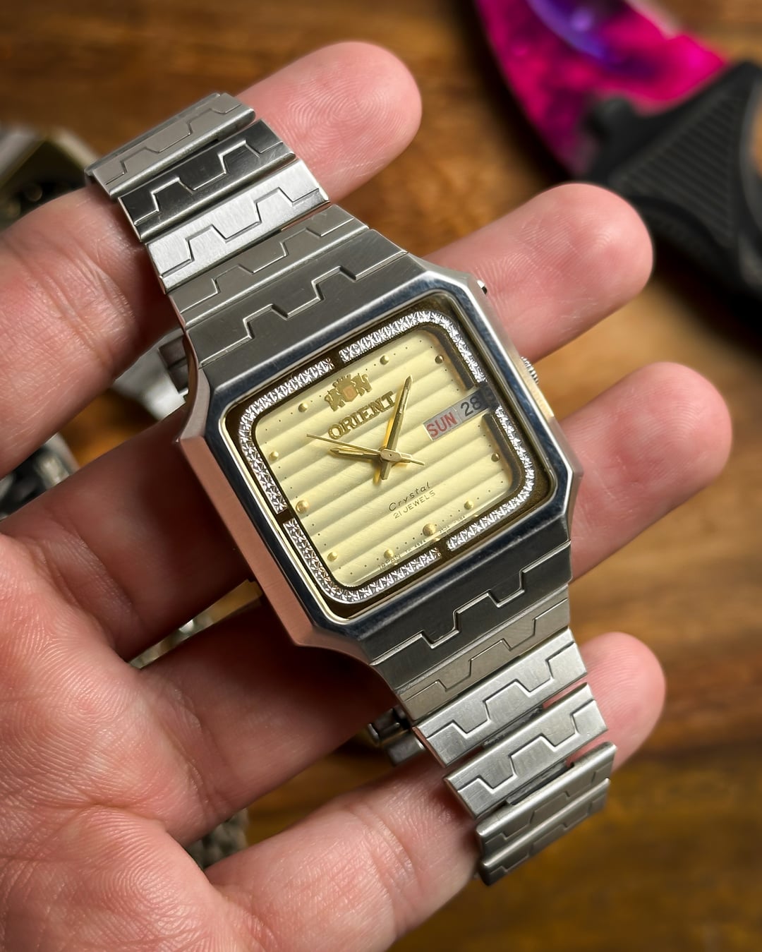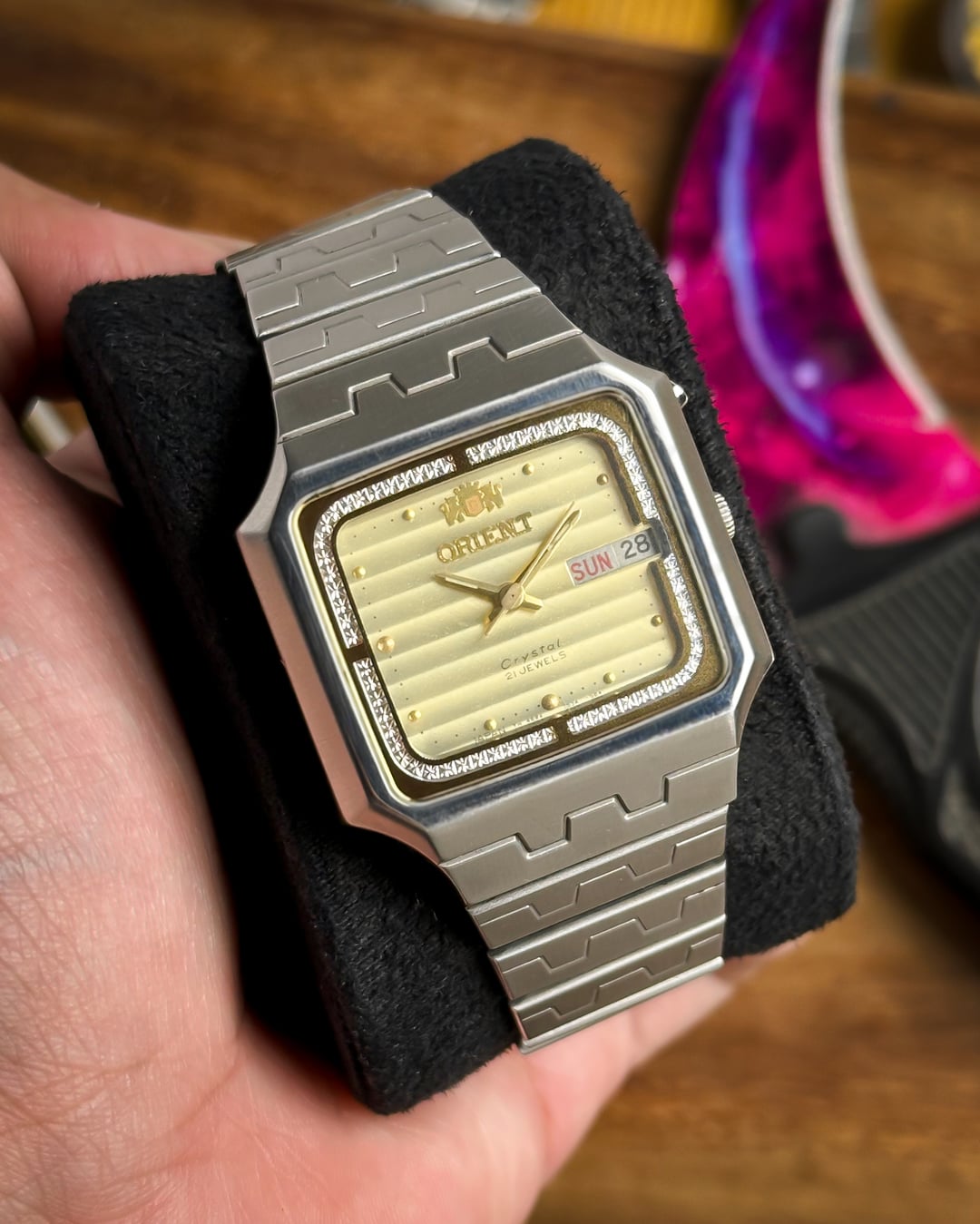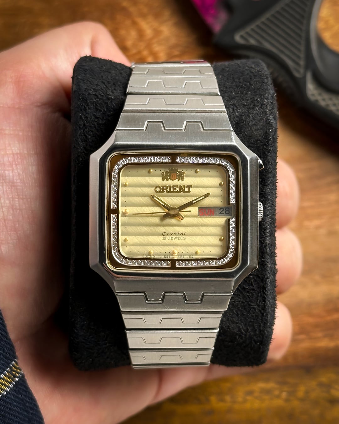 [Timestamp](https://drive.google.com/file/d/17tozbdge6j1Ytp2lChRv1cE_YurqEIGz/view?usp=sharing) Hey Watchexchange! This is the **Champagne Dweller**—a nickname we gave this automatic Orient Crystal to celebrate its luxurious **champagne dial color** and unique, bold aesthetic featuring a **TV case** and dazzling **gem-set accents**. Dating from the **1980s**, this watch is a rare and highly stylized piece of Japanese design, perfect for collectors who appreciate an integrated, statement look. The dial is the star: a striking **cream-yellow (champagne) color** featuring a **brushed texture** with faint **gradient lines** running horizontally. Time is displayed via **gold-tone pencil hands** and **golden dotted indices**. The day-date complication is at 3 o'clock. Adding flash, the inner bezel has a **reflective gold-tone surface** where **small gems are meticulously set**, acting as a dazzling decorative hour track. The case features the iconic **TV/Cushion shape** in stainless steel. The design is bold and geometric, with a crown at 3 o'clock and a distinct **date adjustment pusher at 2 o'clock**. Inside beats a dependable, in-house **21-jewel automatic Caliber 46941** movement, a hallmark of Orient's reliable watchmaking. The watch comes on its **original stainless steel bracelet**. Both the case and the bracelet share a bold, **stepped design** characterized, creating a cohesive and aggressively geometric look. **🔹 Key Dimensions** * Case Diameter: **35mm** (without crown) * Lug-to-Lug: **42mm** * Thickness: **10mm** * Lug Width: **18mm** 💵 **Price: $135 shipped!** 📦 **Payment: PayPal F&F** or G&S (**+4.5% fee by buyer**) or **bank wire (US banks accepted)** 📩 DM me for more pics or a custom timestamp. If you're looking for a rare, geometric vintage Orient with a truly unique gem-set dial and aggressive bracelet design, this watch delivers amazing value. Follow my [**Instagram**](https://www.instagram.com/everistwatches/) and **Reddit profile** for more **vintage drops**.