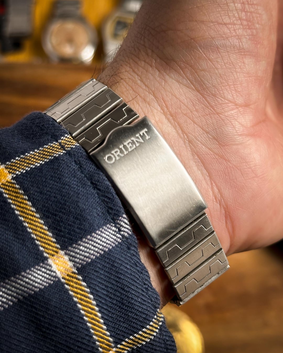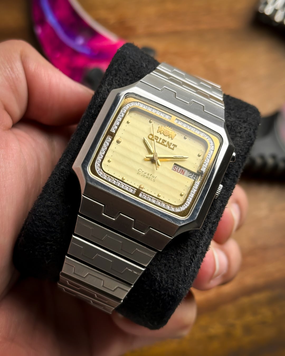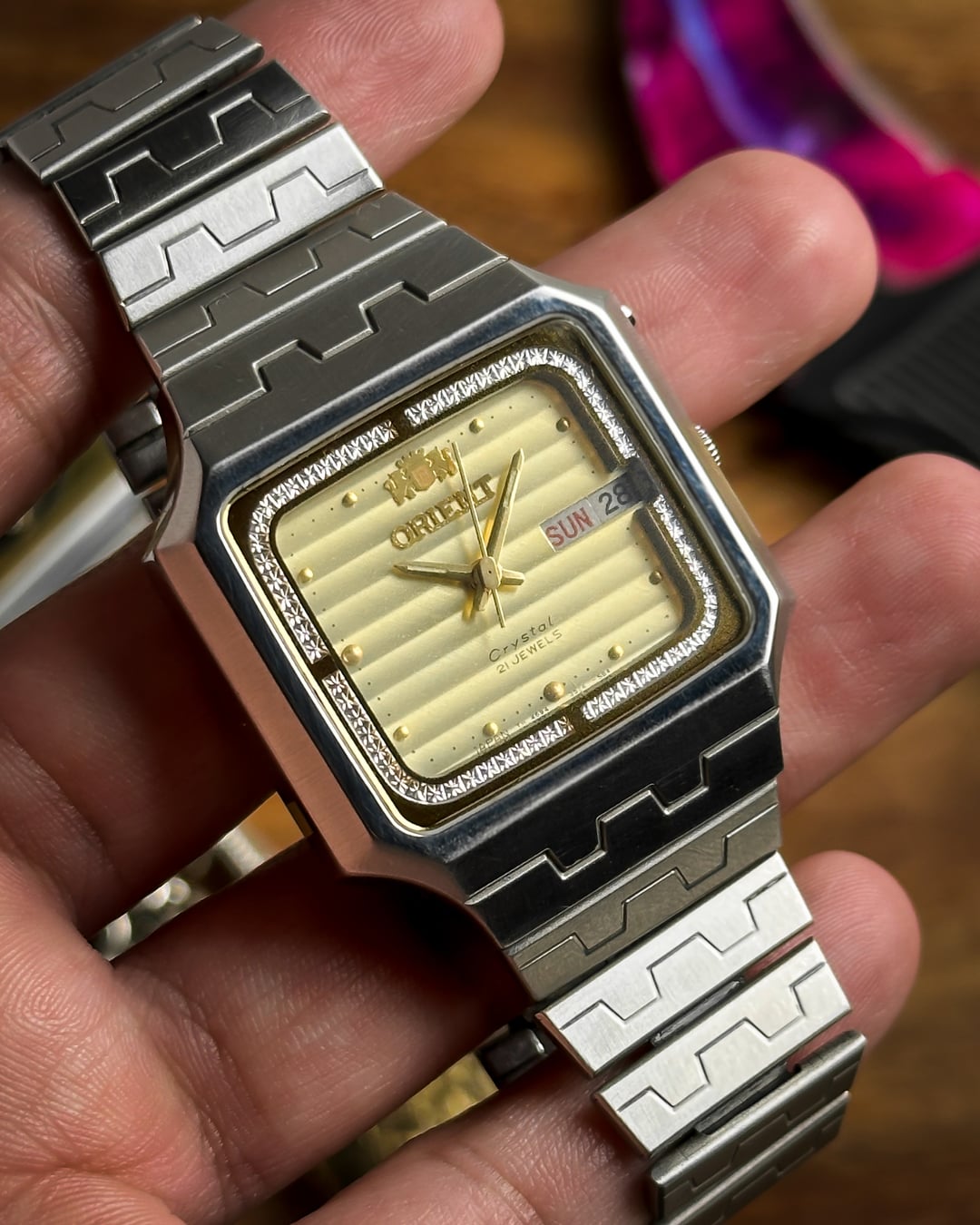 [Timestamp](https://drive.google.com/file/d/17tozbdge6j1Ytp2lChRv1cE_YurqEIGz/view?usp=sharing) Hey Watchexchange! This is the **Champagne Dweller**—a nickname we gave this automatic Orient Crystal to celebrate its luxurious **champagne dial color** and unique, bold aesthetic featuring a **TV case** and dazzling **gem-set accents**. Dating from the **1980s**, this watch is a rare and highly stylized piece of Japanese design, perfect for collectors who appreciate an integrated, statement look. The dial is the star: a striking **cream-yellow (champagne) color** featuring a **brushed texture** with faint **gradient lines** running horizontally. Time is displayed via **gold-tone pencil hands** and **golden dotted indices**. The day-date complication is at 3 o'clock. Adding flash, the inner bezel has a **reflective gold-tone surface** where **small gems are meticulously set**, acting as a dazzling decorative hour track. The case features the iconic **TV/Cushion shape** in stainless steel. The design is bold and geometric, with a crown at 3 o'clock and a distinct **date adjustment pusher at 2 o'clock**. Inside beats a dependable, in-house **21-jewel automatic Caliber 46941** movement, a hallmark of Orient's reliable watchmaking. The watch comes on its **original stainless steel bracelet**. Both the case and the bracelet share a bold, **stepped design** characterized, creating a cohesive and aggressively geometric look. **🔹 Key Dimensions** * Case Diameter: **35mm** (without crown) * Lug-to-Lug: **42mm** * Thickness: **10mm** * Lug Width: **18mm** 💵 **Price: $135 shipped!** 📦 **Payment: PayPal F&F** or G&S (**+4.5% fee by buyer**) or **bank wire (US banks accepted)** 📩 DM me for more pics or a custom timestamp. If you're looking for a rare, geometric vintage Orient with a truly unique gem-set dial and aggressive bracelet design, this watch delivers amazing value. Follow my [**Instagram**](https://www.instagram.com/everistwatches/) and **Reddit profile** for more **vintage drops**.