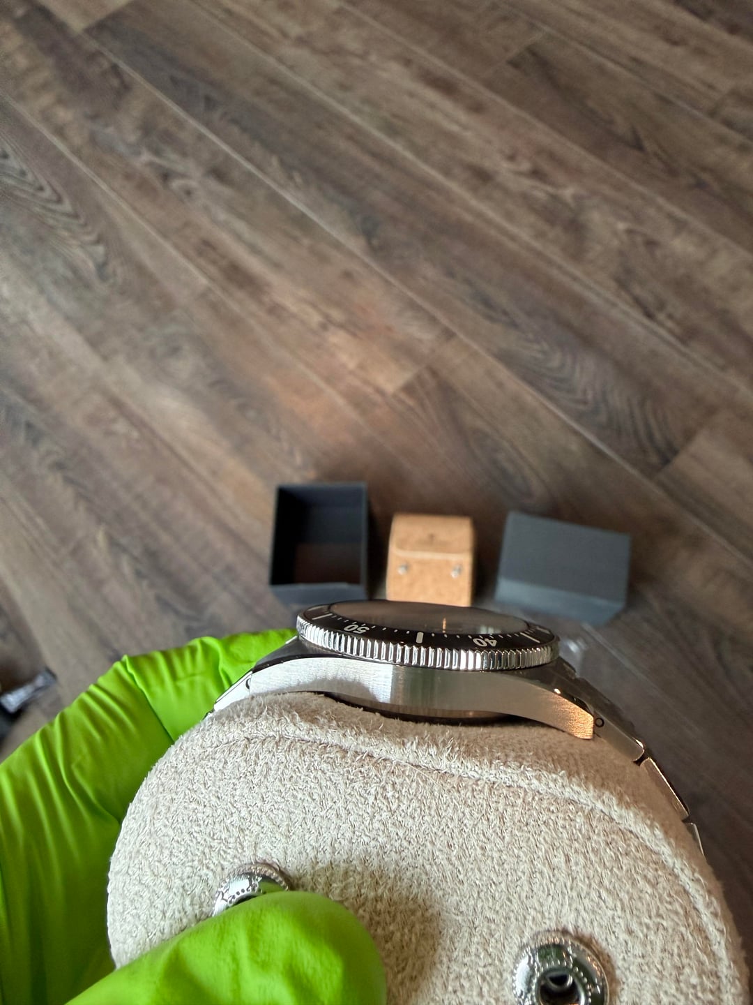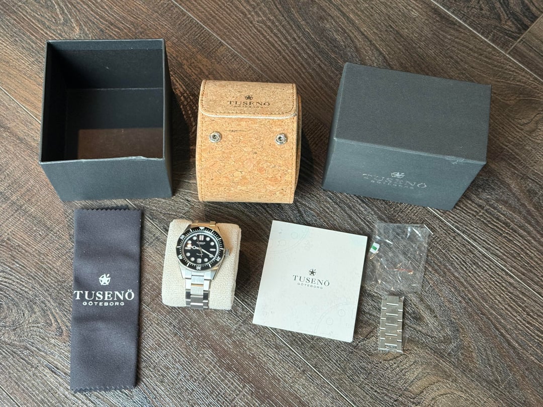 For sale is my Tuseno Shellback diver. Excellent condition and a great example of a modern tool watch from a Swiss made microbrand Movement: Sellita SW200-1 automatic Stainless steel case & bracelet Sapphire crystal 300m water resistance Strong lume, solid bezel action Condition: Like new. Only very light marks on the clasp from desk wear. Crystal and case are clean. Included: Full kit — inner/outer box, cork travel case, papers, cloth, extra links, and watch as shown. Price: sold to Cuetrader PayPal F&F preferred (G&S add fee). No trades at this time. Don’t hesitate to ask any questions or request additional photos or videos, Thanks!