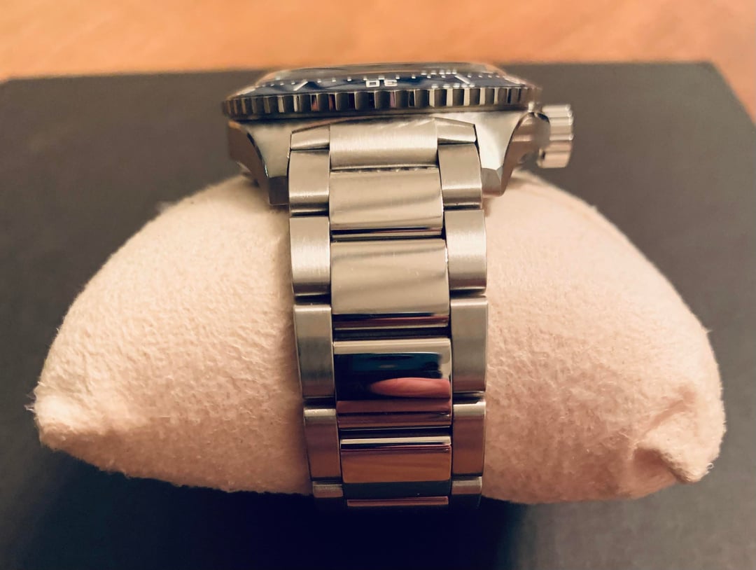 For sale is a Glashütte Original SeaQ 43mm automatic dive watch featuring the striking blue sunburst dial and matching blue unidirectional bezel. This larger 43mm SeaQ offers strong wrist presence while retaining the refined fit and finish Glashütte Original is known for. Inspired by the historic Glashütte “Spezialist” dive watches, the SeaQ is a true professional diver rated to 300 meters / 1000 feet, yet elegant enough for daily wear. The dial features applied Arabic numerals, bold luminous hands and markers, and a panoramic date window at 4 o’clock. This example is fitted to the original Glashütte Original stainless steel bracelet and presents very well, as shown in the photos. Details & Specifications: • Brand: Glashütte Original • Model: SeaQ • Case Size: 43mm • Movement: Automatic (Glashütte Original in-house) • Case Material: Stainless Steel • Dial Color: Blue (sunburst) • Bezel: Blue unidirectional rotating dive bezel • Crystal: Sapphire • Water Resistance: 300m / 1000ft • Bracelet: Stainless steel, signed • Date: 4 o’clock • Made in Germany Condition: Very good pre-owned condition with light signs of normal wear consistent with careful use. No major scratches or damage noted. Most notable wear is light scratches on polished links and clasp. Included: Box and papers dated 03.02.2022.