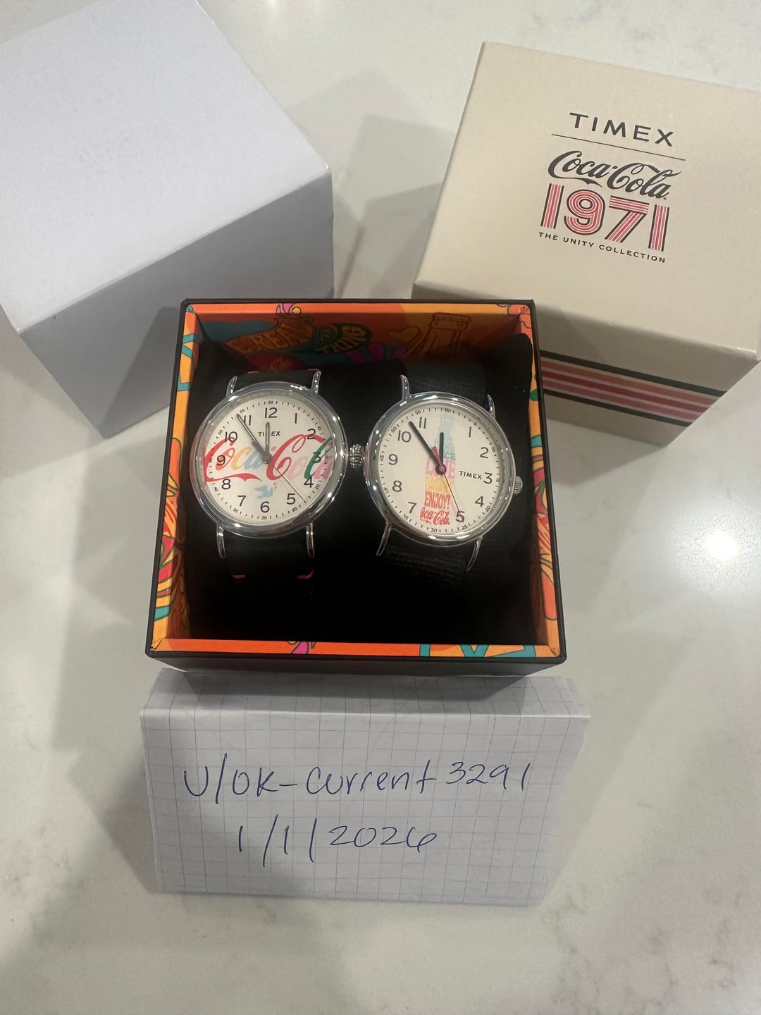 $150 USD OBO Payment: Zelle or PayPal Location: USA Shipping: CONUS — FedEx 2 day shipping Description: Selling a pair of Timex x Coca-Cola 1971 Unity Collection watches from the limited-edition capsule release celebrating the classic 1971 Coca-Cola “Hilltop” campaign. Both watches run well and are included in the sale.  Details: • Two watches included (pictured) • Quartz movement, vintage-inspired Coca-Cola themed dials • One original box included (both watches included) • Great casual/collector pieces for Coca-Cola or Timex enthusiasts Condition: Pre-owned. Excellent- some normal wear visible consistent with age; both watches run and keep time. One box included.