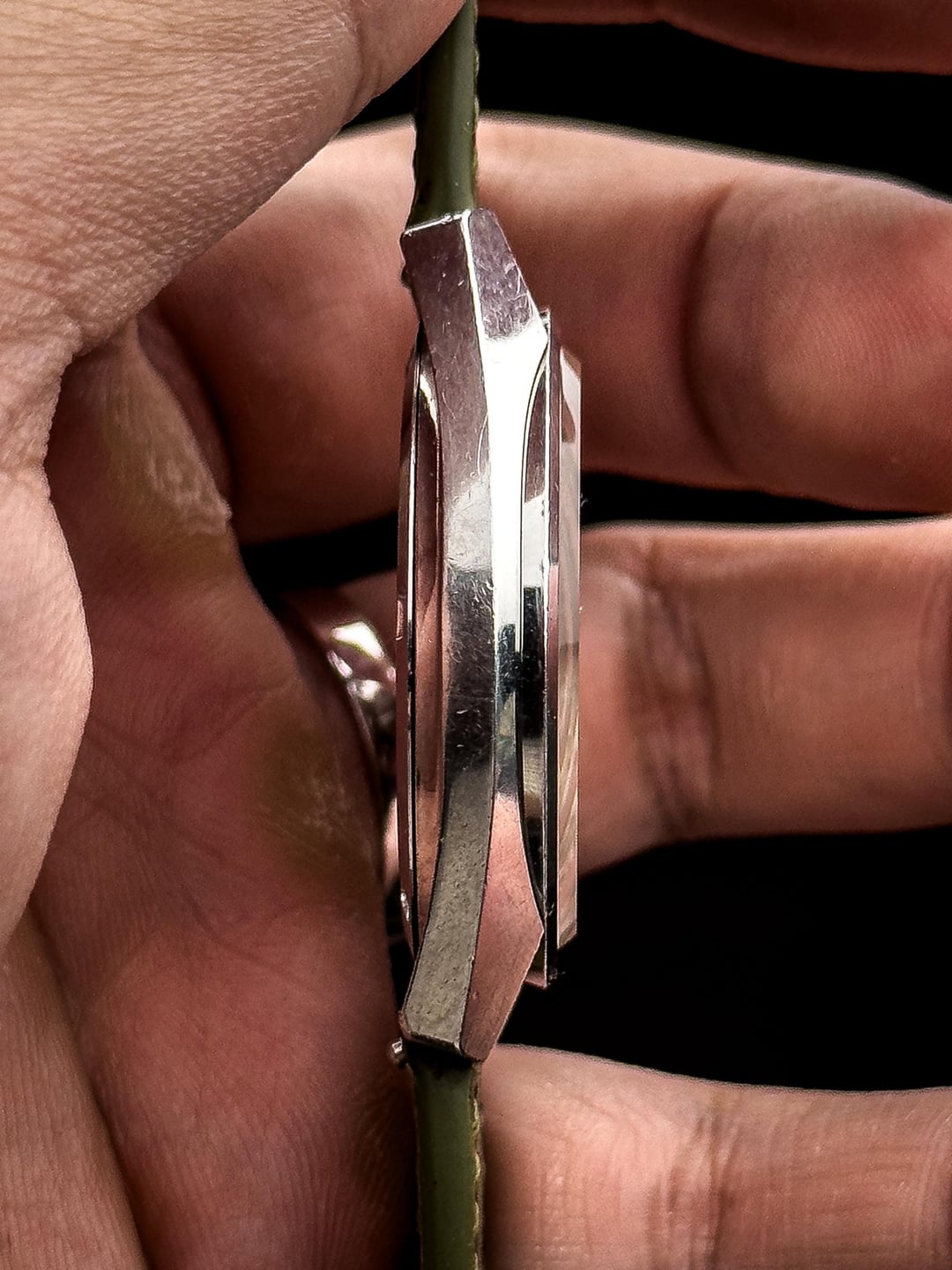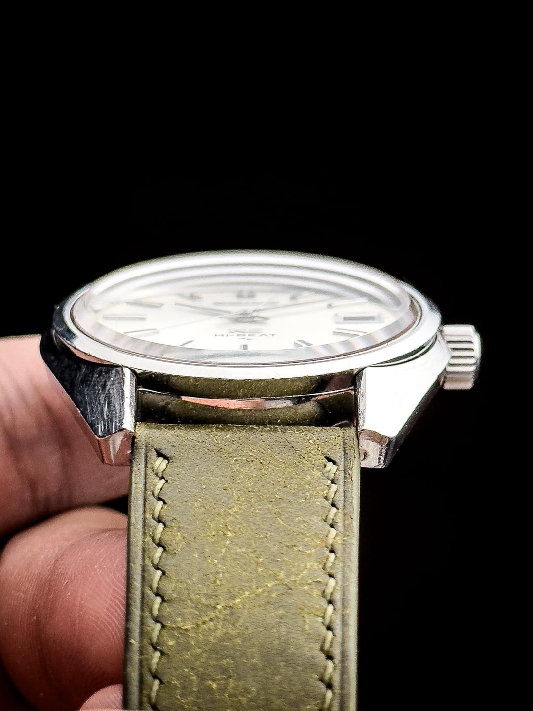 Up for sale is the 1969 King Seiko Hi Beat 36000 vph 4502-7001 in good serviced condition. Images: https://drive.google.com/drive/folders/1MrlZSEZzp35jWwBNZ_u0zEv1RZfTxovx Video: https://drive.google.com/file/d/1zJo8kgeGp004oXDGuGRNKT2AboUWMqVg/view?usp=drivesdk Timestamp: https://drive.google.com/file/d/1SUm63yEdx5u9AUn_YYx68svEZchpItEL/view?usp=drivesdk The King Seiko 4502-7001 represents one of the finest expressions of Seiko’s mechanical mastery from the late 60s — a true high-beat classic that beautifully embodies the brand’s “Grammar of Design” philosophy. Often regarded as the dressier sibling to Grand Seiko, this model captures everything that made the King Seiko line special — precision, purity, and presence. The watch features a stainless steel case measuring approximately 36.5mm to 37mm, defined by its sharp, angular geometry and high-polish Zaratsu-style finishing. Every edge and plane has been executed with precision, reflecting light cleanly in that signature Taro Tanaka style. The case is complemented by a screw-in case back with a gold King Seiko medallion, a hallmark of Seiko’s upper-tier craftsmanship during this golden era. Powering the watch is the Caliber 4502A, a hand-wound, 25-jewel, high-beat movement running at 36,000 vibrations per hour — offering smooth seconds motion and exceptional accuracy. It also features hacking seconds and an instantaneous date change mechanism, both rare and refined technical details for its time. The silver sunburst dial radiates understated elegance, with faceted baton indices and razor-sharp dauphine hands finished to perfection. There’s no lume anywhere on the dial, staying true to its minimalist, formal aesthetic. The original domed acrylic crystal adds just the right amount of vintage warmth, catching light in a way only old-school watchmaking can deliver. This example remains in good vintage condition, showing only light wear consistent with age. The case retains its sharp lines, the dial is clean although you can see some patina spots, crystal shows no scratches. It comes fitted on a new leather strap for an effortlessly classic look. The watch has been serviced and it currently keeps great time at +/-5s a day. Watch comes with standard Seiko watch box (no papers) Price: $750 + $60 flat shipping (via DHL/UPS express with tariffs/duty fee covered). Payment via PayPal F&F or G&S (+4.6% fee covered by the buyer). Not accepting trades. Feel free to message me with any questions or if you're interested. Have a great day! Check out my other watches on Instagram: @jasonswatchcorner