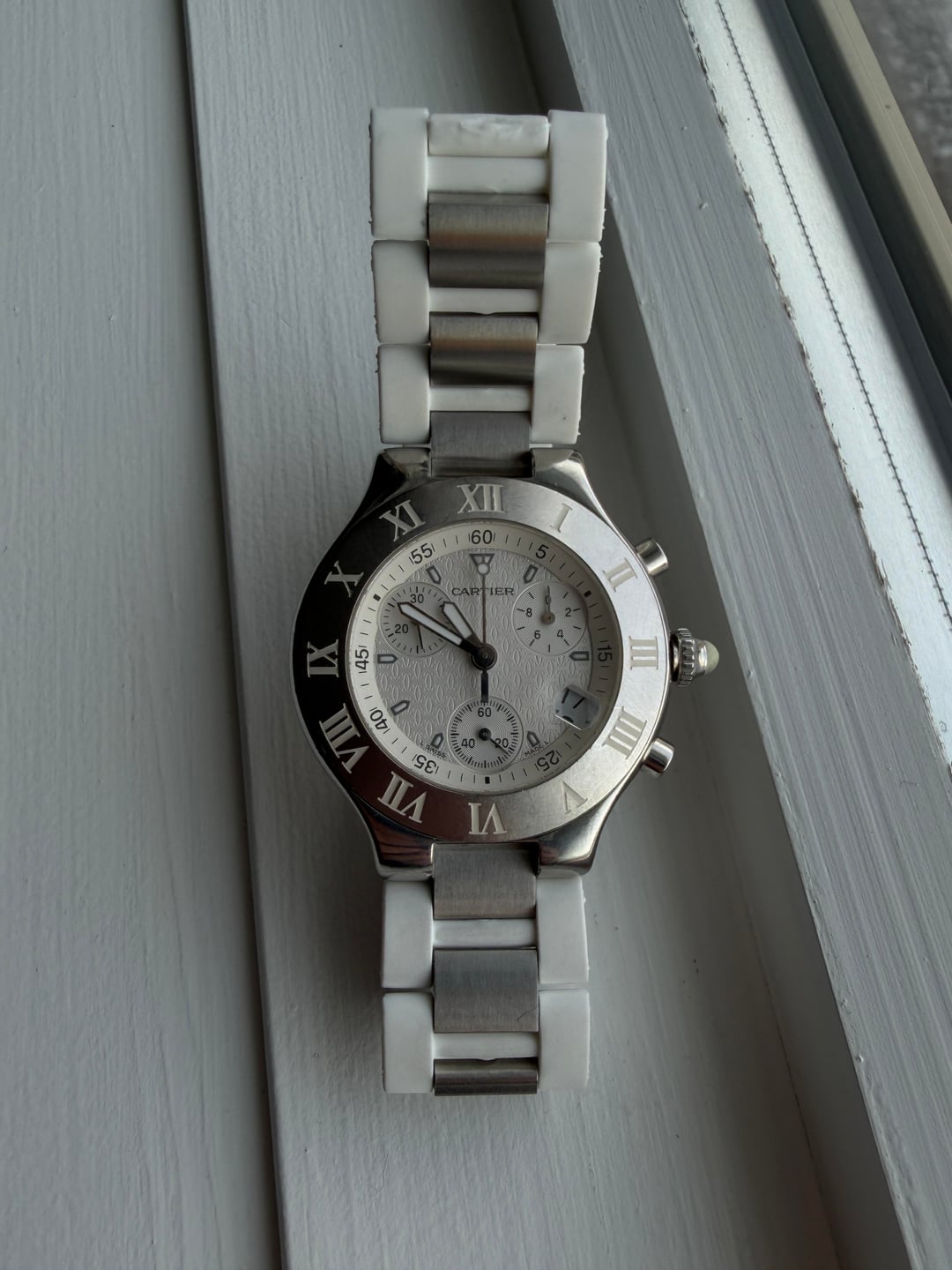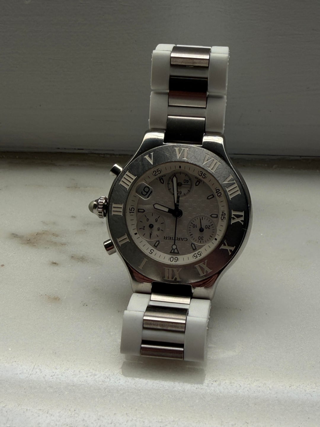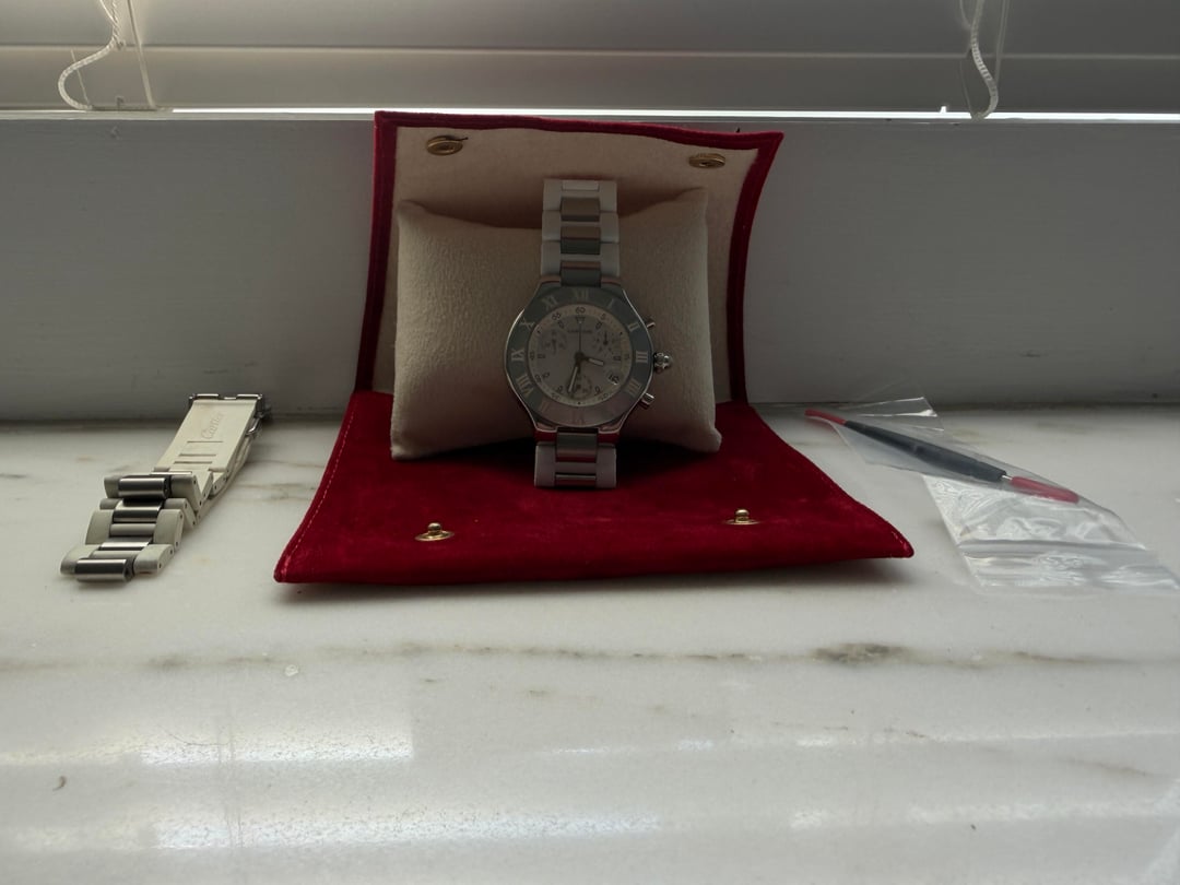 Hello everyone! All of the details are below and feel free to reply here with questions. Please refrain from PMing without asking here first. Have a lovely day! Authentic Cartier Must 21 Chronoscaph ref. 2424 (quartz). Fresh battery installed; all functions and chronograph professionally tested and working properly. Watch is in very good overall condition with light surface scuffs and minor scratches consistent with age; dial, hands, and crystal are clean. Comes fitted with a new silicon strap with deployment clasp for daily wear, and the original Cartier strap is also included. Includes a genuine Cartier velvet travel pouch. No box or papers. Late-2000s - early 2010s production era. Asking $1,950 OBO. Payment & Shipping: International buyers welcome. Buyer covers shipping and any import duties. Preferred payment is bank wire or Wise. PayPal Goods & Services available if needed (buyer covers fees). Watch will ship via UPS/FedEx, fully insured with signature required.