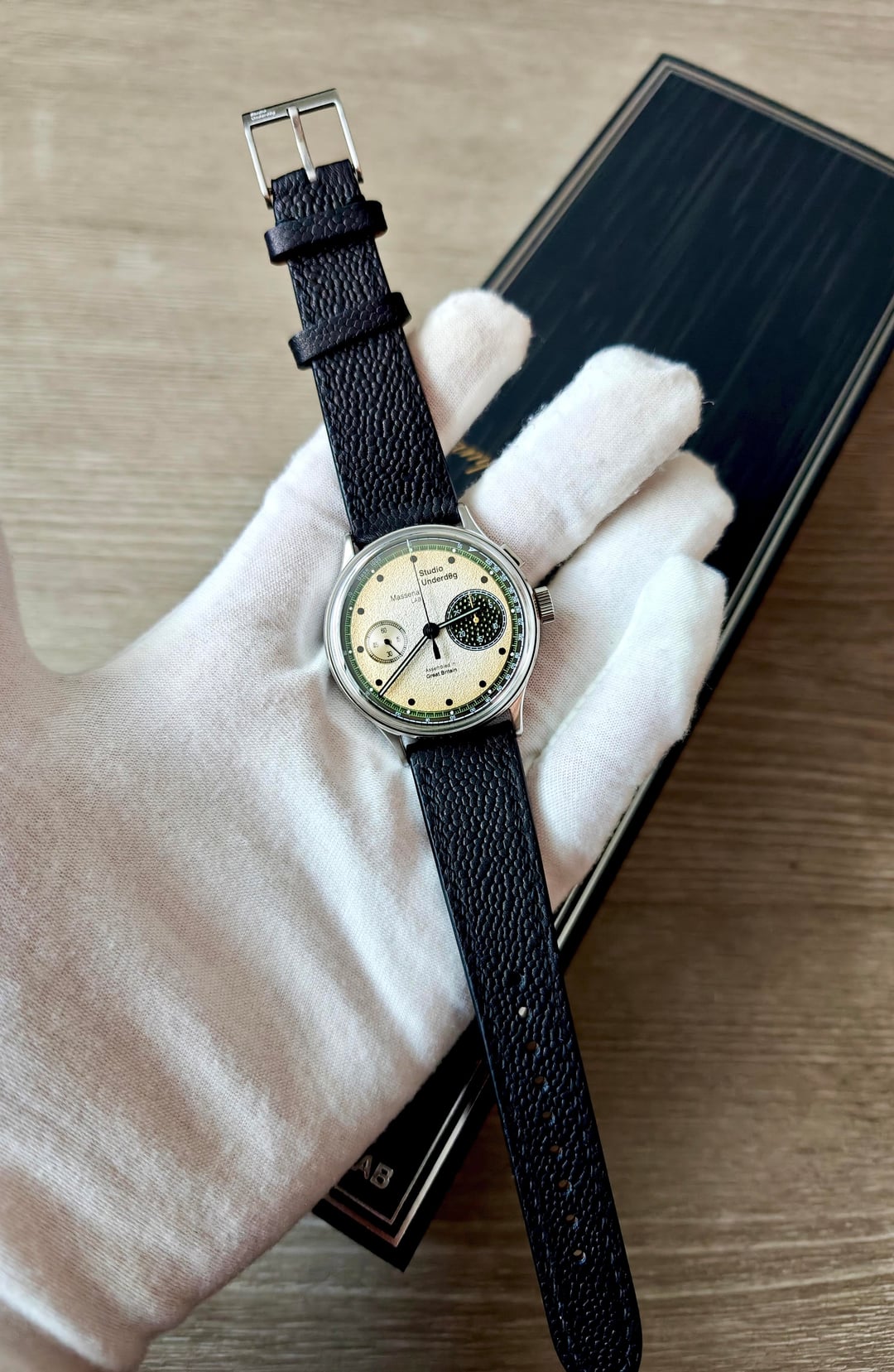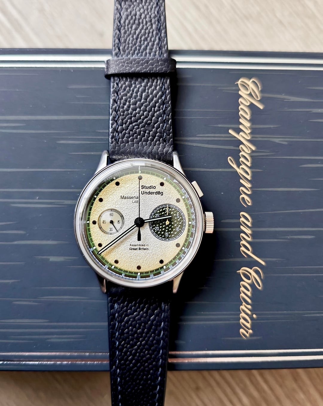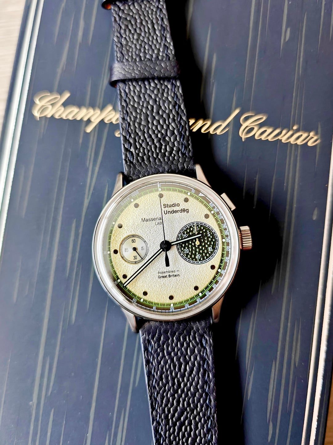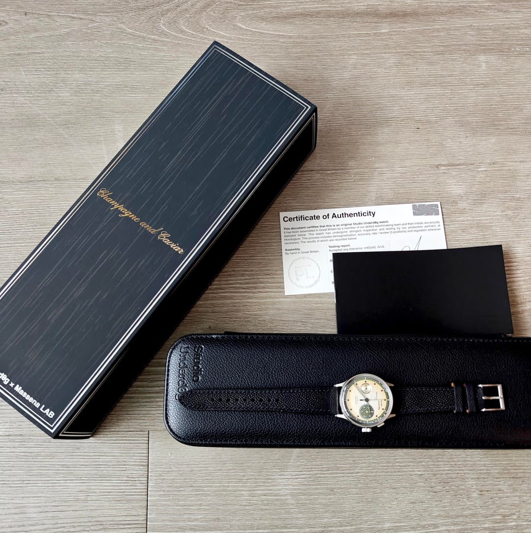 Up for sale is an awesome team up between Studio Underdog and Massena LAB. This is the Champagne and Caviar, which is a 03SERIES model with a customized Sellita SW510 Chronograph movement. There's only 200 pieces worldwide. This watch is in brand new condition. The watch will come with the original box, certificate of authenticity, and manual. -Reference: 03CHB -Size: 38.5mm -Movement: Manual wound -Strap: Original strap -Watch with box, cert of authenticity, and manual. Price: $2,995 shipped anywhere in the continental U.S. No trades sorry! I take Zelle and bank wire as payment. Paypal F&F/Venmo can be an alternative if you have feedbacks on this subreddit. I have 120+ confirmed transactions on watchexchange, and many more on other platforms. Buy with confidence!
