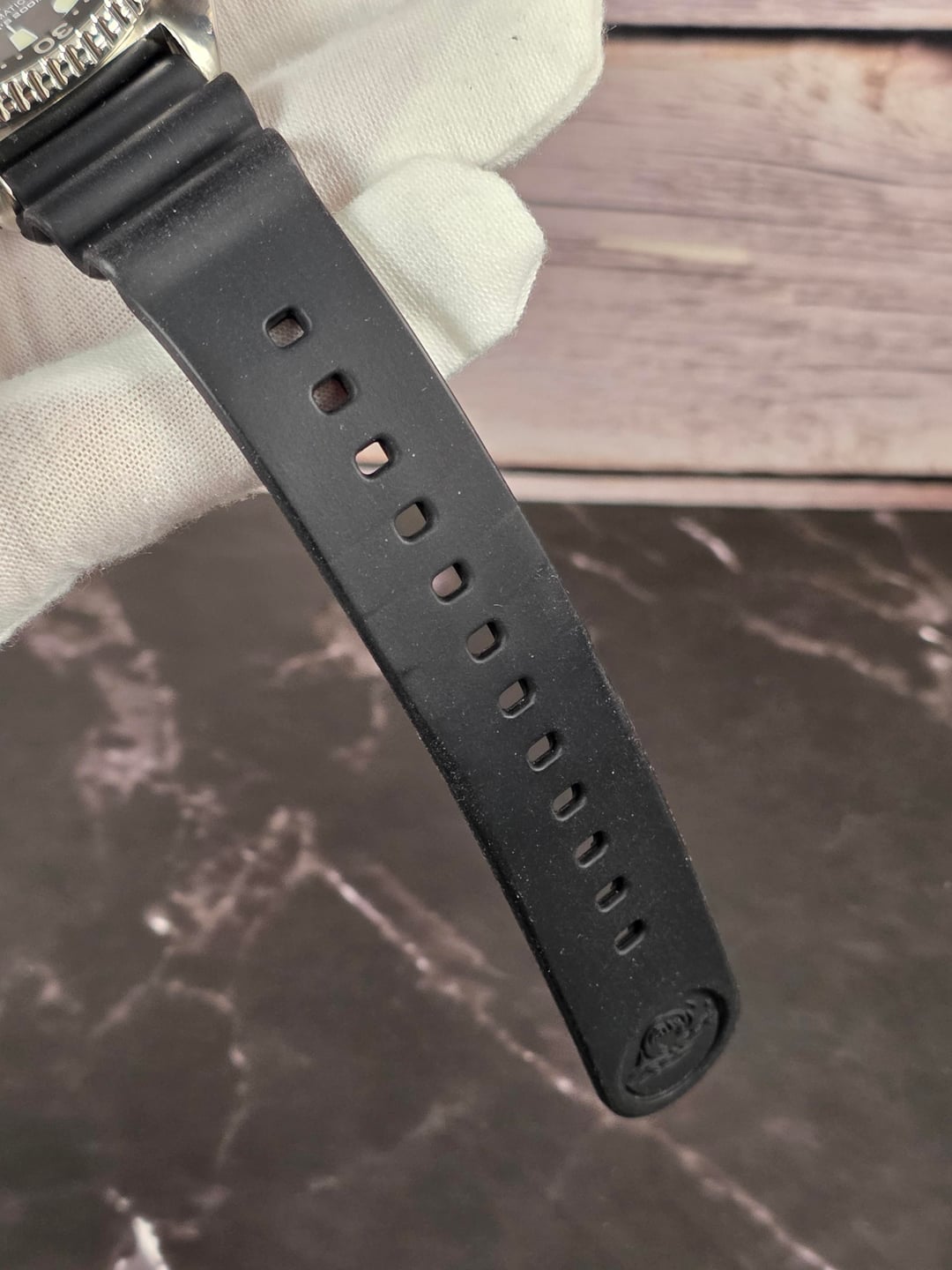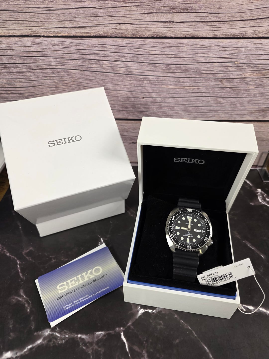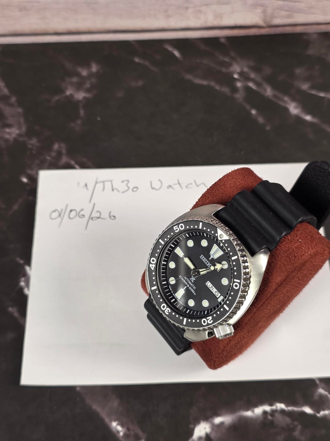Available for sale! Seiko Mini Samurai Ref: SRPL13 Good Pre-Owned Condition • Crystal has a small mark mid dial towards 6. Hard to see. • Case shows wear on polished sides • Small mark at 9-minute position on bezel • Rubber is in good shapen • Clasp and keeper show wear Includes box, papers, hangtag, and warranty card. Asking: $315 + label Ships from NJ (CONUS only) Zelle preferred, PayPal & Venmo FF accepted NJ buyers subject to sales tax More photos available.