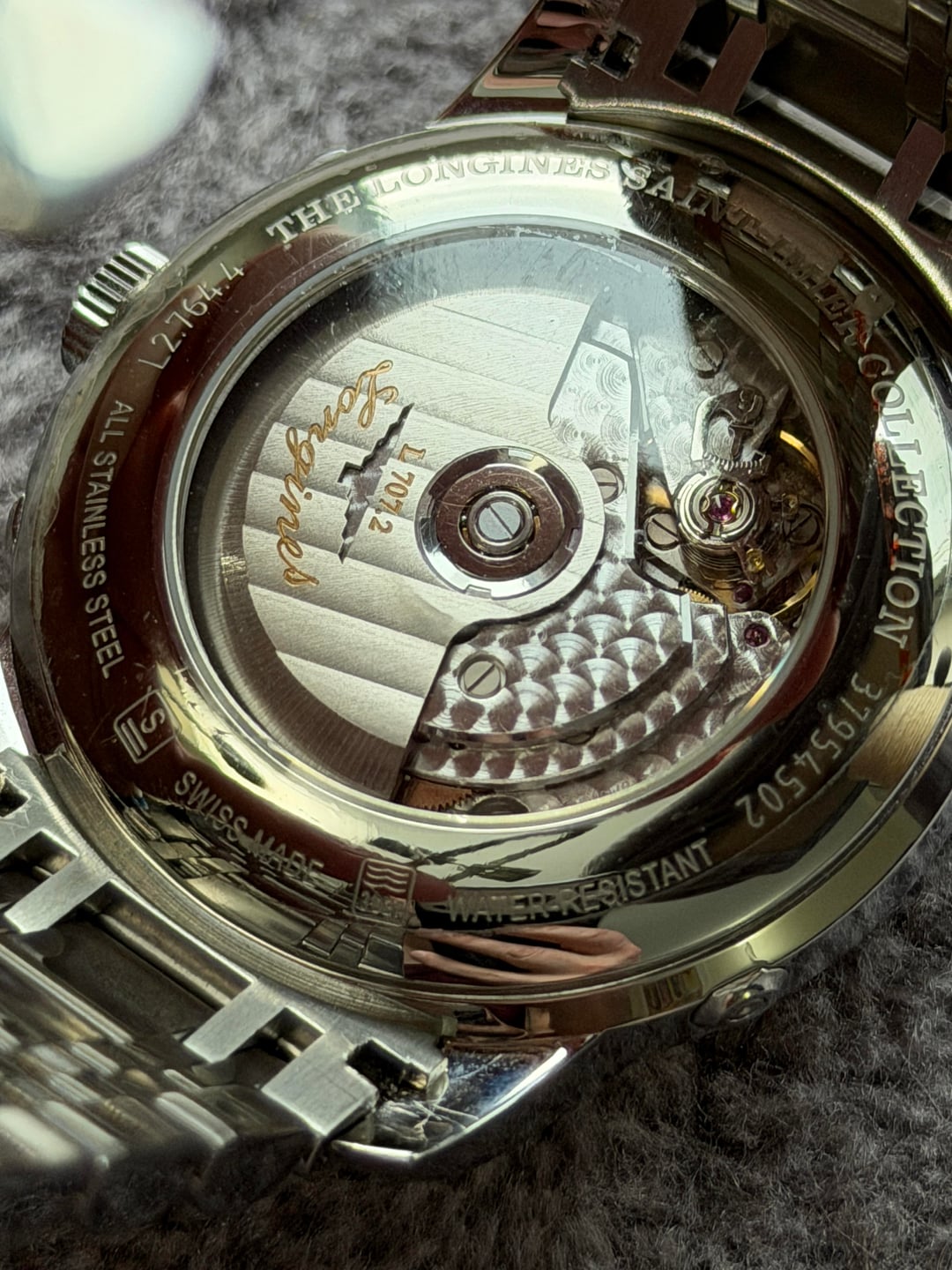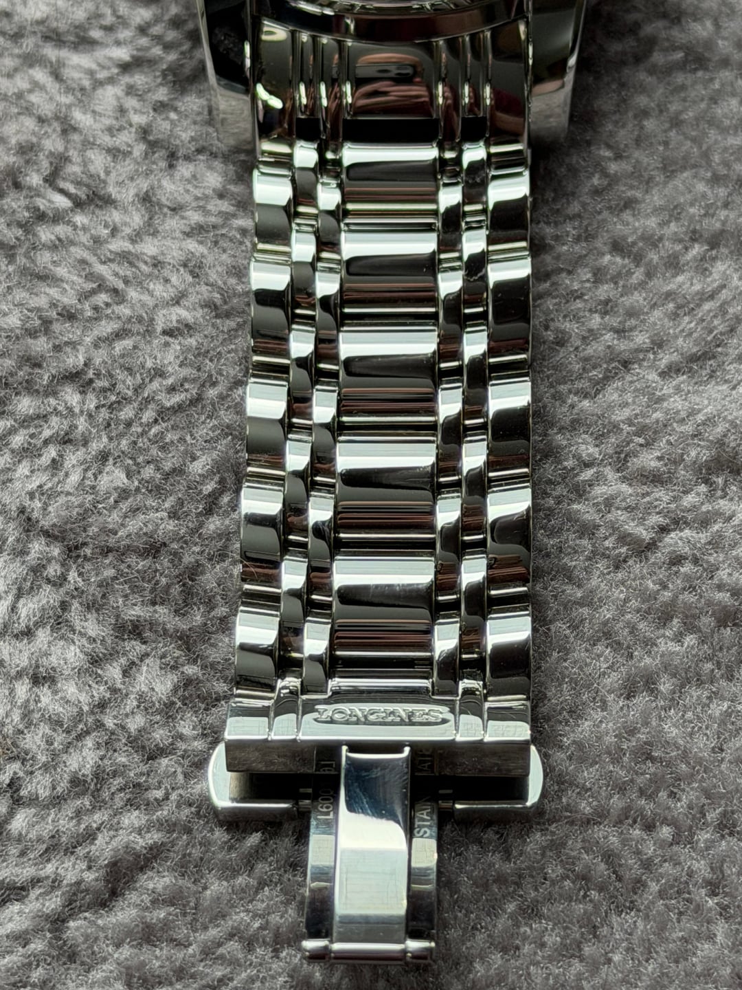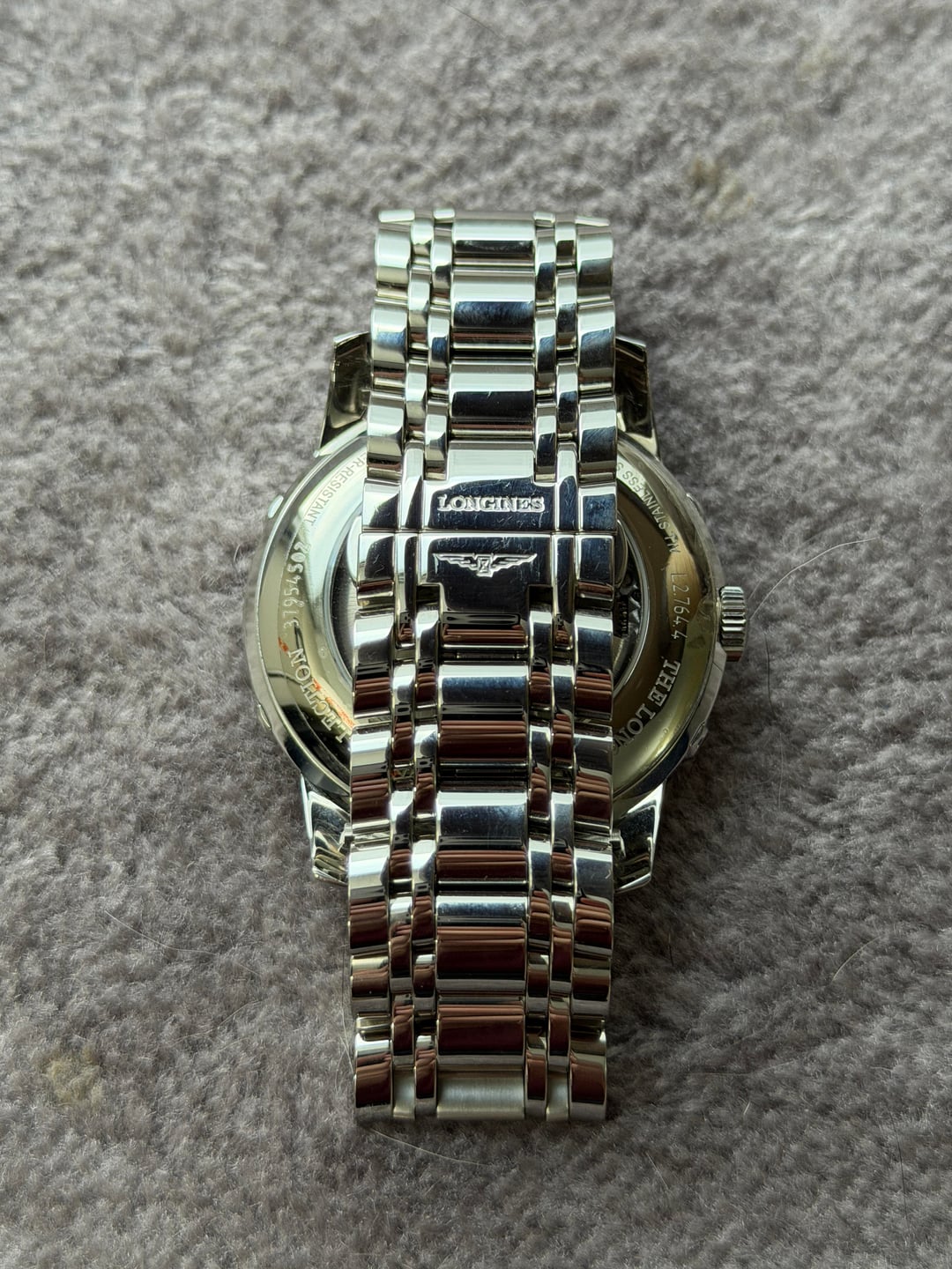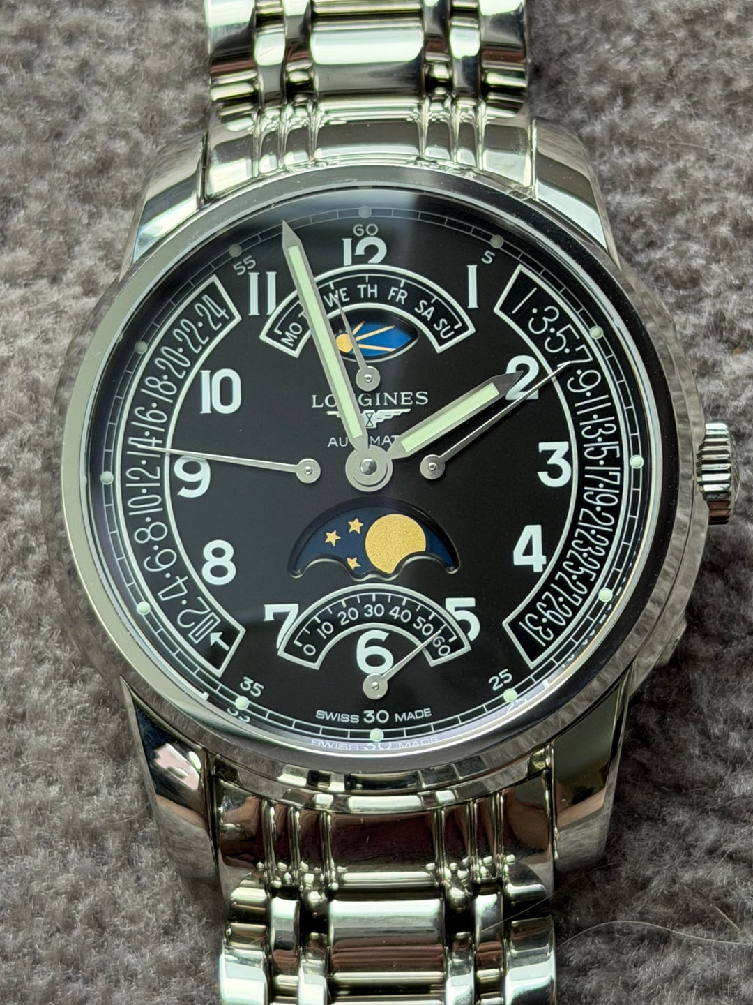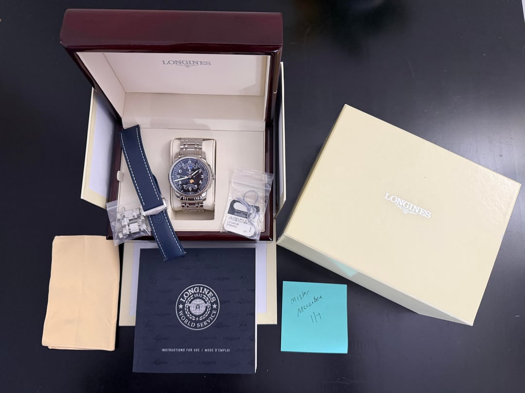Hey folks Gorgeous and beautiful! This is a hard one to find, especially on that official Longines clasp it was originally shipped with. This is the Saint-Imier Edition (where the Longines factory site is located in Switzerland), born in 2012 and only made for a couple of years, as you can see by the arabic numerals on the dial (the regular editions have roman numerals). For an almost 15 year old watch it’s in really great condition! Back glass still has plastic on it. There are some minor everyday marks on clasp, case but very minimal and can barely see them. I took a lot of up-close pics so please check them out prior to purchase. Comes full kit including original box, manual, button pusher, Cloth, all links, hang tag and an additional 22mm sailcloth strap with deployment clasp in navy blue I purchased separately from Artem. $3500 shipped conus PayPal F&F or Zelle. I have 60 positive transactions on watchexchange with good feedback so please read them. Also have an eBay store with hundreds of sales and hundreds of positive feedback so read them as well (offtherakcollectibles) Sale only, no trades. Ships from NYC so if you're in area can meet up locally. Please leave a comment here so I can view your transaction history and then message me if you're interested. Thank you! —— Per Fratello: This watch is packed with complications: moon phase indicator at 6 o’clock, day/night indicator at 12 o’clock, retrograde day indicator at 12 o’clock, retrograde 24-hour indicator at the left side of the dial and retrograde date indicator at the right side of the dial. All these complications are powered by an automatic caliber L707.2 movement. This nicely finished movement of Longines prestigious moon phases watch is based on ETA’s caliber A07 L31 movement. From what we’ve understood, ETA is making this movement exclusively for Longines. Besides the great classic look of this timepiece from the Watchmaking Tradition collection of Longines, there is another aspect that will please a lot of people. As you probably know Longines is positioned within the Swatch Group as a serious watchmaking brand with a lot of heritage to show but also one that is still affordable. This particular Saint-Imier Retrograde Moonphase has a price tag of 2950 EUR, which is approximately $3700 USD ——— \- Swiss Made - Black Dial- Arabic Numeral Hour Markers - Minute Track - Polished Stainless Steel Bezel - Retrograde Calendar Date Feature - Retrograde Hand Displays: Date Hand on Right Side of Dial Day of the Week Hand Below 12 O'Clock 24 Hour / GMT Second Time-Zone Hand on Left Side of Dial- Retrograde Small Seconds Hand at 6 O'Clock- Day / Night Indicator Located at 12 O'Clock - Moonphase Feature at 6 O' Clock - 48 Hour Power Reserve - Self-winding Automatic Movement - Longines Caliber L707 - Vibrations Per Hour: 28,800 - Jewels: 25- Manufacturer Box & Manual - Polished Stainless Steel Case- Polished Stainless Steel Bracelet- Scratch Resistant Sapphire Crystal - 30 Meters / 100 Feet Water-Resistant - 44mm = 1 3/4" Case, 7" Adjustable Bracelet- Fixed Bezel- Sapphire Crystal Exhibition Case Back - Luminescent Hands - Push & Pull Crown - Stainless Steel Deployment Buckle