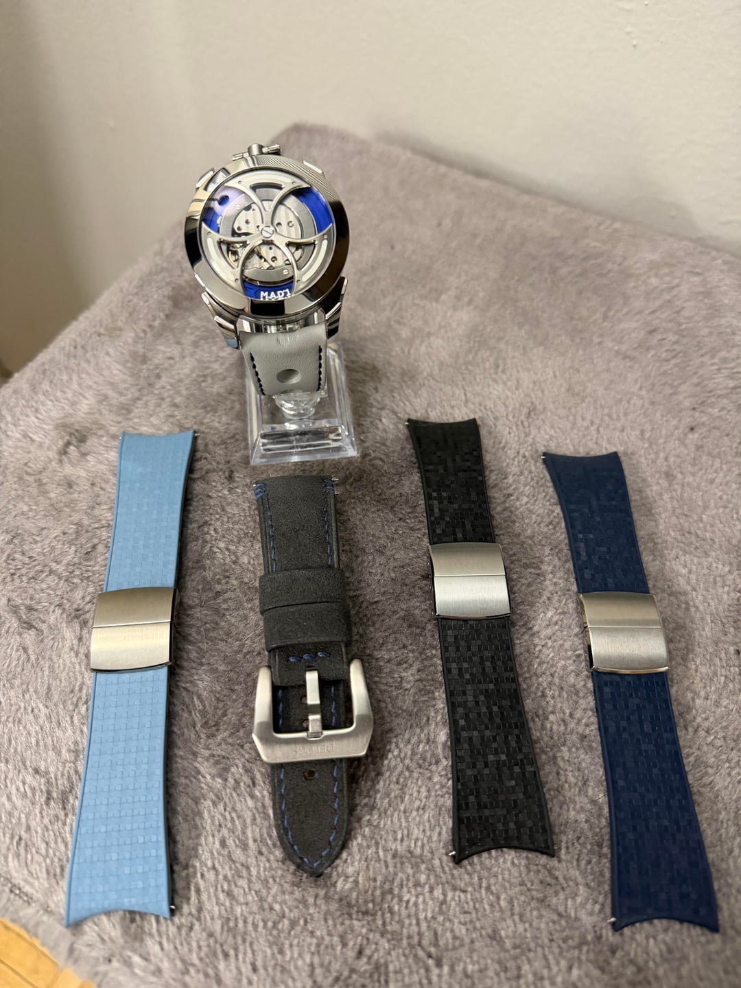 Hey folks This is the original friends and family version, the first version produced, of the M.A.D.1 Mad Editions from Max Busser and MB&F. It has been sold out for a while now. This will come with over $600 of additional Delugs straps - see pics. There are 3 different colored CTS rubber straps cut to size for about a 7 inch wrist or so. Plus a gray/blue alcantara strap that is on backorder currently. in really nice condition. I am not the original owner. See pics for condition of case. Some minor wear to be expected. Note- black rubber cts shown in pic not included $3750 shipped conus PayPal F&F or Zelle. I have 60 positive transactions on watchexchange with good feedback so please read them. Also have an eBay store with hundreds of sales and hundreds of positive feedback so read them as well (offtherakcollectibles) Sale only, no trades. Ships from NYC so if you're in area can meet up locally. Please leave a comment here so I can view your transaction history and then message me if you're interested. Thank you!