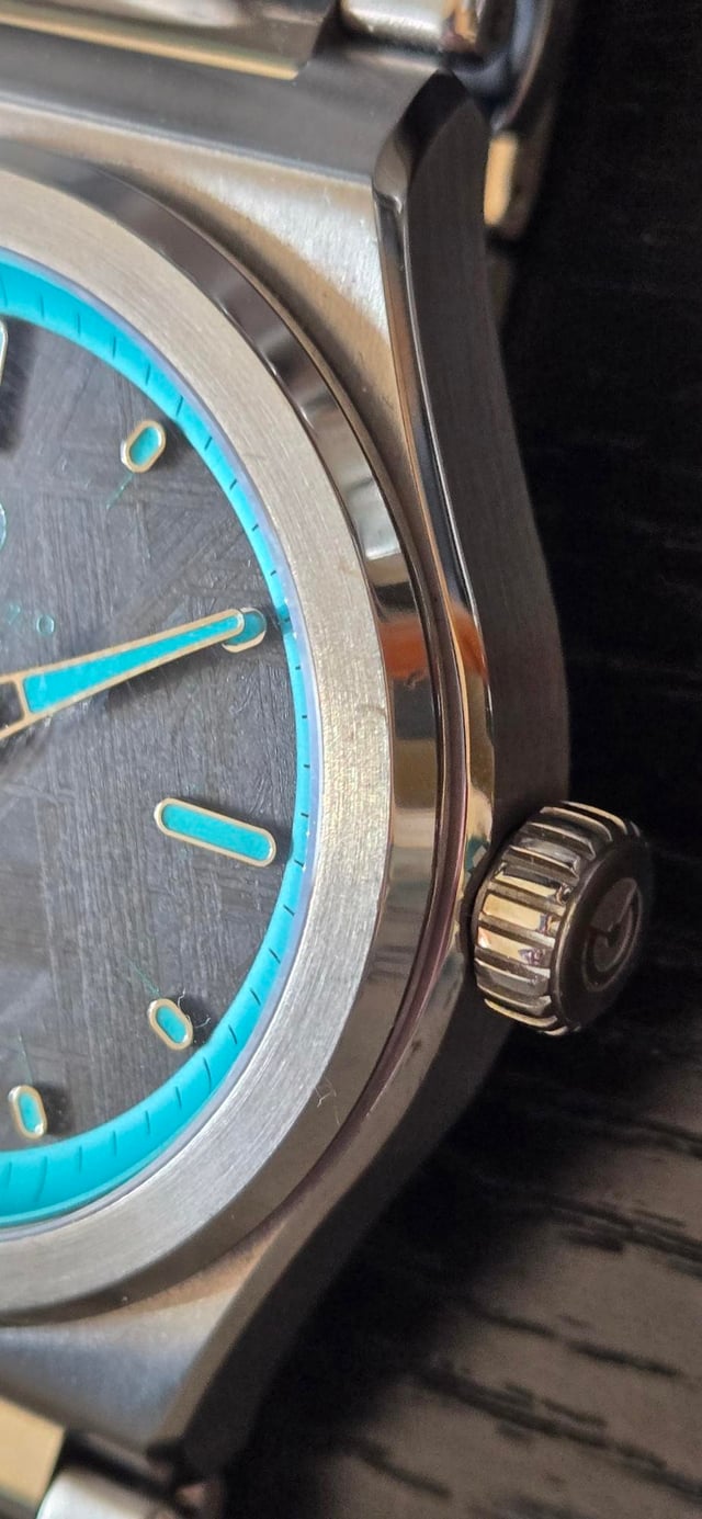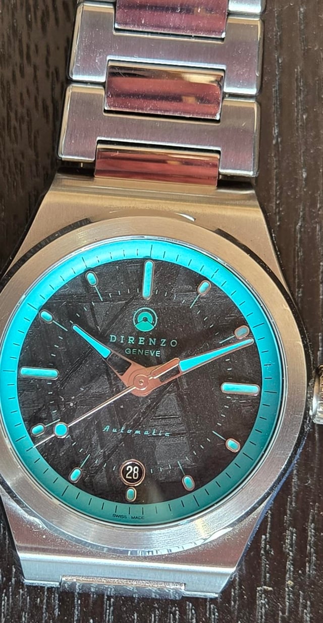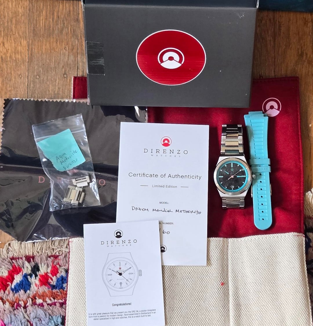 Greetings: Parting with my beautiful, unique Direnzo DRZ 04 Mondial Meteorite Dial with its light blue/turquoise accent. Swiss Made quality microbrand. This watch is in excellent condition. It's a rare find, a limited edition. Only 60 ever made. Full Kit includes a light blue/turquoise Mondial rubber strap. Asking **$1380** o.b.r.o shipped CONUS. International buyers pay shipping. Local San Francisco Bay Area pickup is ok. PayPal F&F. Add 4% for G&S. No trades please. Thanks! Here are the specs: |Bracelet|Metal bracelet with butterfly clasp| |:-|:-| |Diameter W/0 crown|40mm| |Lug to Lug|48mm| |Height|10.8 mm including sapphire| |Water resistance|10 atm| |Movement|Sellita SW-200-1 Elaboré + Incabloc| |Caseback|Screw down with sapphire crystal| |Weight|150gr. with bracelet (all links)|