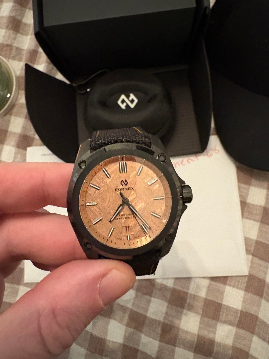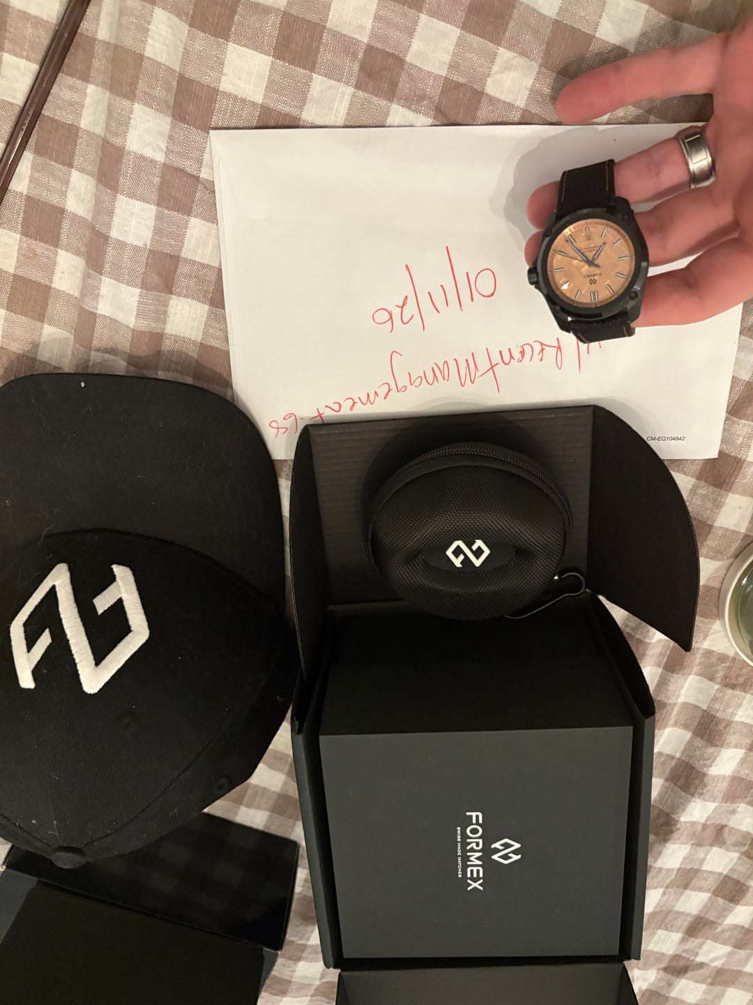**Brand:** Formex **Model:** Essence Leggera Automatic Chronometer – Space Gold **Movement:** COSC‑Certified Automatic **Case Size:** **41mm** **Case:** Carbon fiber composite w/ Space Gold accents **Crystal:** Sapphire w/ AR **Straps & Accessories:** * OEM Formex **Black Canvas strap** with **Gold stitching** and **Formed Deployant Clasp** * **Bonus OEM Black Rubber strap** (never used) * **Lightly worn Formex hat** * **Formex‑branded Clam travel case** **Included:** Watch, all accessories listed above, and full kit **Price:** **$2,050 shipped OBO** **Shipping:** **CONUS only** **Location:** Massachusetts Selling my **Formex Essence Leggera Space Gold**, received in **November**. This is a **tough one to let go** — it’s incredibly lightweight, comfortable, and beautifully executed — but a recent collection shake‑up means something has to move. Condition is **excellent**. Worn sparingly and carefully. Case, crystal, and clasp are clean with no notable marks. Running perfectly and maintaining strong COSC chronometer performance. The carbon composite case makes this watch disappear on‑wrist, and Formex’s suspension system adds real‑world comfort you don’t get elsewhere. The Space Gold accents paired with the gold‑stitched canvas strap give it a unique but refined look. # Payment & Trust * **Venmo, Zelle, PayPal F&F** * **PayPal G&S available** (buyer pays fees) * **Willing to FaceTime** with serious buyers * **Fully insured shipping included (CONUS)** * **50+ verified transactions** No trades. **Reasonable offers welcome.** Please message with any questions or requests for additional photos.