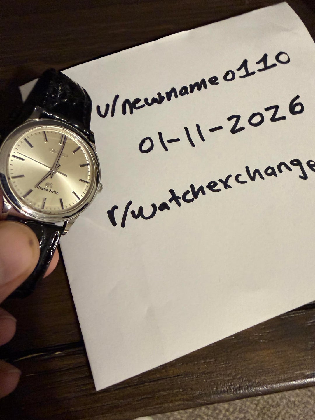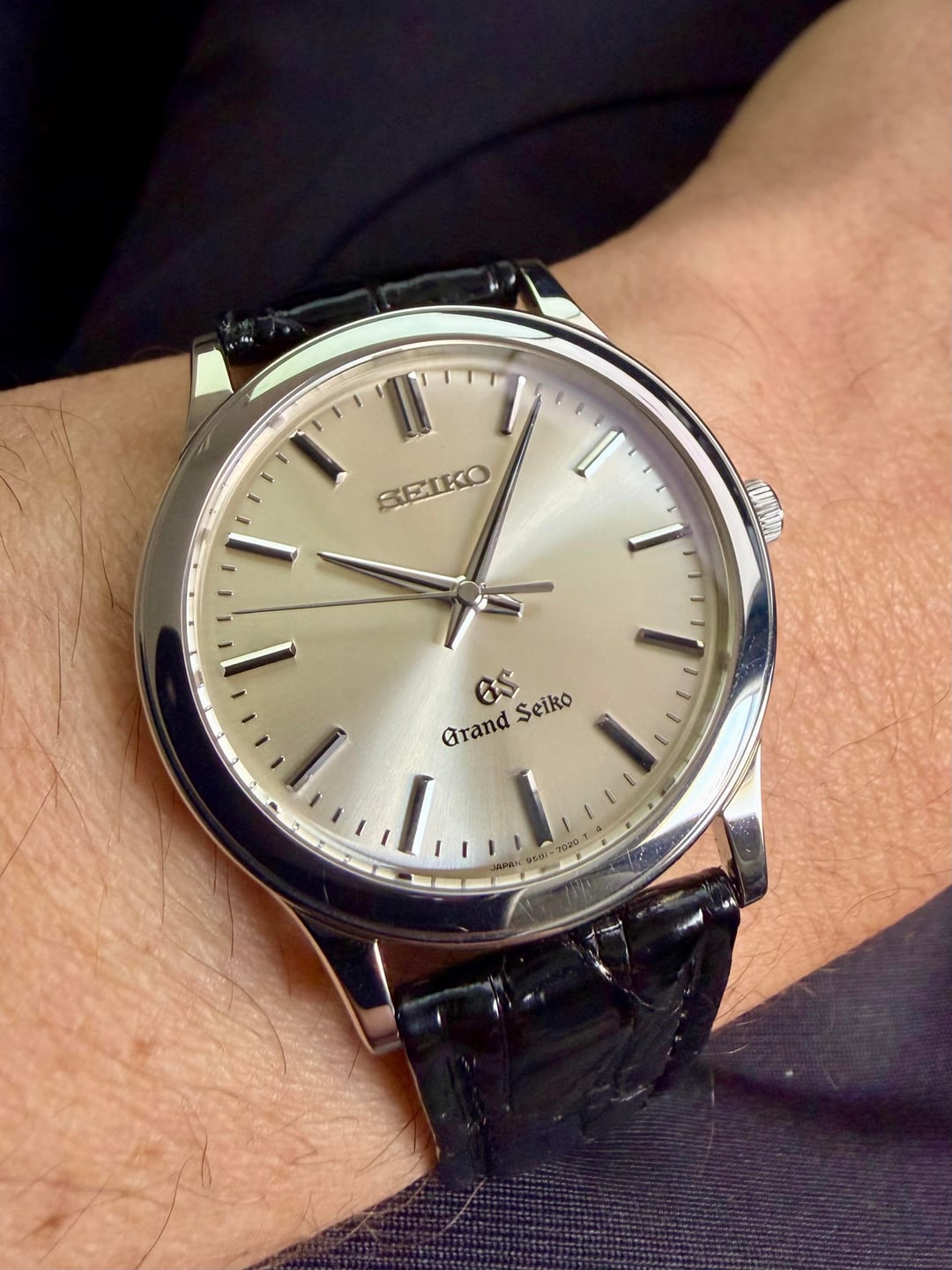 Offering here my JDM-only Grand Seiko SBGS009, featuring the legendary 9581 high-accuracy quartz movement, Zaratsu polished case/markers and a classic silver sunburst / champagne-toned dial. This is an uncommon reference, rarely seen for sale in the US. Most, if not all currently listed examples of this watch are located in Japan and come with added taxes, tariffs/duties and international shipping fees. My watch is in TX, USA right now and priced “all-in”, with fully insured shipping included. My experience: This is an exceptional dress-focused Grand Seiko timepiece. At approximately 36mm diameter (inclusive of the crown.) and just ~7mm thick, it wears incredibly light and elegant on the wrist. I have a 6.75in wrist and this watch just melts right into it as you can see in the wrist shot. The no-date layout keeps the dial perfectly balanced, and the HAQ movement has been nothing short of flawless — this watch has not drifted even one second during my ownership. ⸻ Details •Reference: Grand Seiko SBGS-009 (9581-7020, JDM only reference) •Movement: Grand Seiko 9581 High Accuracy Quartz (rated ±10 sec/year) •Case: Stainless steel •Crystal: Sapphire •Dial: Silver sunburst featuring a subtle champagne hue with Zaratsu polished markers and applied indices all the way around. •Functions: Time only, no date •Size: ~34.5mm case × ~7mm thick. Lug to lug is -38mm •Strap: Black crocodile leather strap (generic) with original GS signed clasp •Accessories: Double boxed in OEM inner & outer green Grand Seiko branded boxes, with original watch pillow, matching microfiber cloth and original instruction manual. ⸻ Condition Excellent to near mint condition. Very lightly worn and presents extremely well. Crystal, case, indices, crown, GS buckle and dial are all excellent. The watch is keeping outstanding time, exactly as expected from a GS HAQ. No functional or cosmetic issues that I’m aware of. ⸻ 📍 Location: Dallas, TX 💰 Asking: $965 shipped to CONUS - reasonable offers are welcome. Trades: Grand Seiko trades plus additional cash on either end may be considered. 💳 Payment: PayPal F&F or Zelle 📦 Shipping: Included to CONUS. Fully insured for sale price with signature required at delivery. Happy to provide additional photos, video, or timestamps on request.