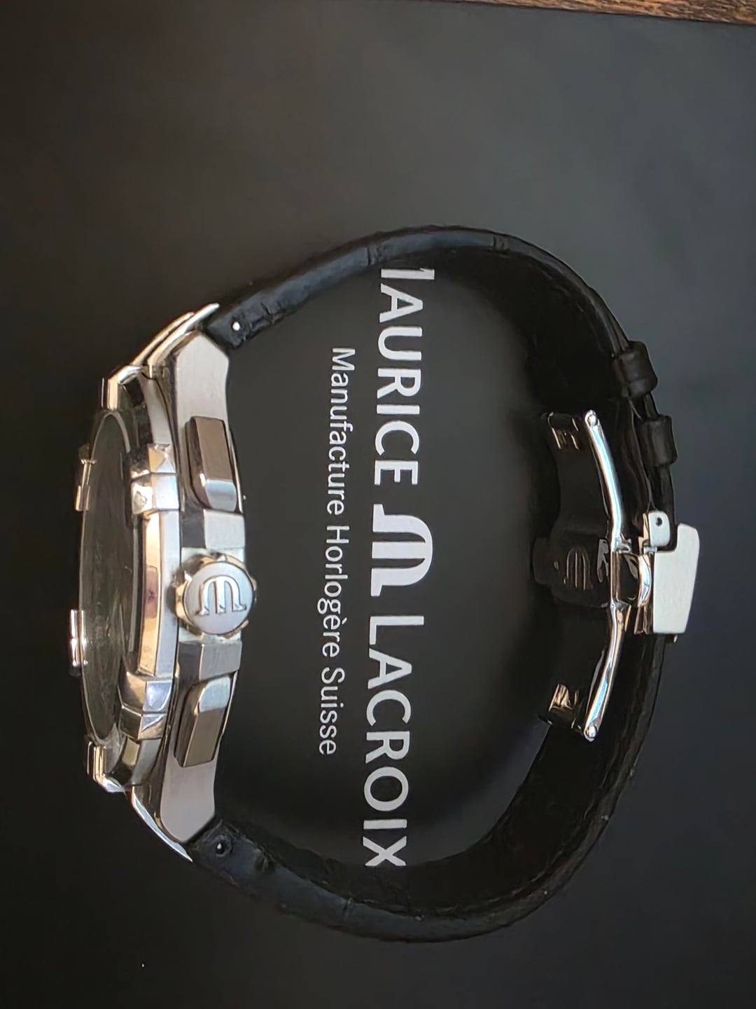 Mint Condition Maurice Lacroix Aikon Chronograph Quartz Watch AI1018-SS001-330-1 Black Dial 44mm with box and manual. Maurice Lacroix AIKON Chronograph 44mm Model: AI1018-SS001-330-1 Case Material: Stainless Steel Case Size: 44mm Dial: Black sun-brushed with snailed (sub-dial) counters Strap: Black calf leather with alligator pattern Movement: Quartz Chronograph Functions: Hours, Minutes, Seconds, Date, Chronograph Water Resistance: 10 ATM (100 meters/330 feet) $700 shipped CONUS only with tracking. Payment via PayPal F&F or Zelle. DISCLAIMER: You can rest assured that the watch will come safely packaged, but once it leaves my hands, I am not responsible for it whatsoever, whether lost or DOA. No returns or refunds. Your purchase constitutes acceptance of these terms.