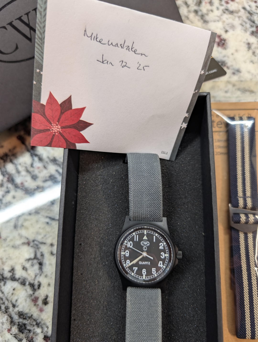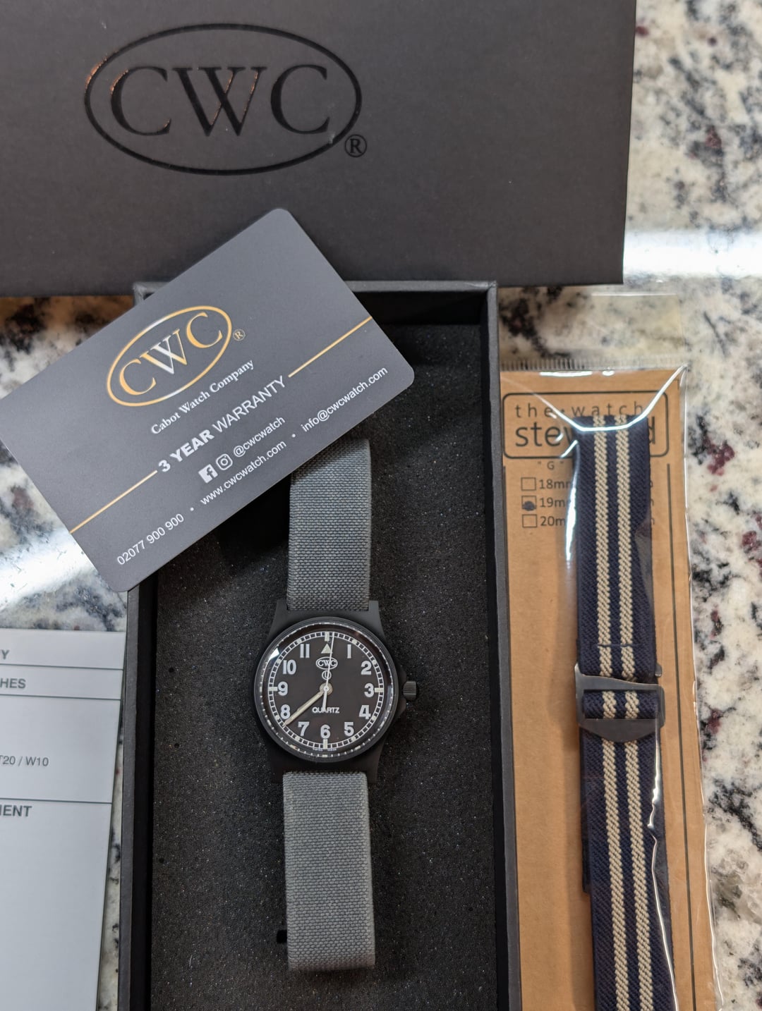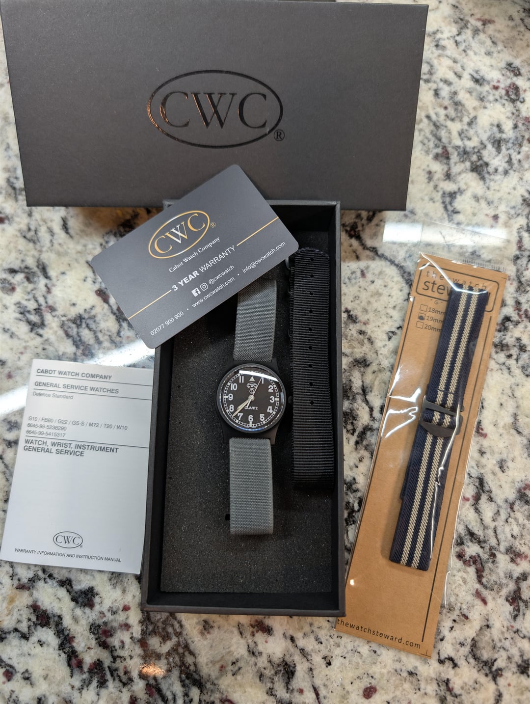 Selling CWC GS Sapphire Black on Black 39.5mm case incl. crown, 36.5mm without crown. Beefed up specs for the CWC GS. Sapphire crystal, 200m water resistance. Will include on a really nice grey Watch Steward G Series strap, with another unworn as a bonus for CWE friends. OEM Nato also included. Apparently Scarlett Johannson wears this one in the new Jurassic Park movie so that’s cool! Model details here: [CWC GS Sapphire Watch, Black with Black Dial](https://www.cwcwatch.com/products/cwc-gs-sapphire-watch-black) 3 year warranty dates to April ’25. Inner/outer box, paperwork. Asking $350 shipped CONUS. That’s considerable savings over buying one new with import duties and taxes. Timestamp: [https://i.imgur.com/sfpkzxn.jpeg](https://i.imgur.com/sfpkzxn.jpeg)