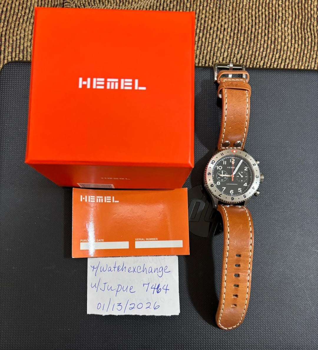 Offering this up at the reduced steal price of only $215 plus $13 for CONUS shipping via USPS Priority. Killer, sold out watch that had an msrp of $449!! Watch is in excellent overall cosmetic condition with no gouges, deep scratches, or dents. Comes with everything pictured. https://www.hemelwatches.com/collections/hf-series-1/products/hemel-hft20-vk64-configuration This is being sold as-is with no warranty or returns expressed or implied. Thanks for your consideration and please let me know if you have any additional questions or requests as I'm happy to oblige.