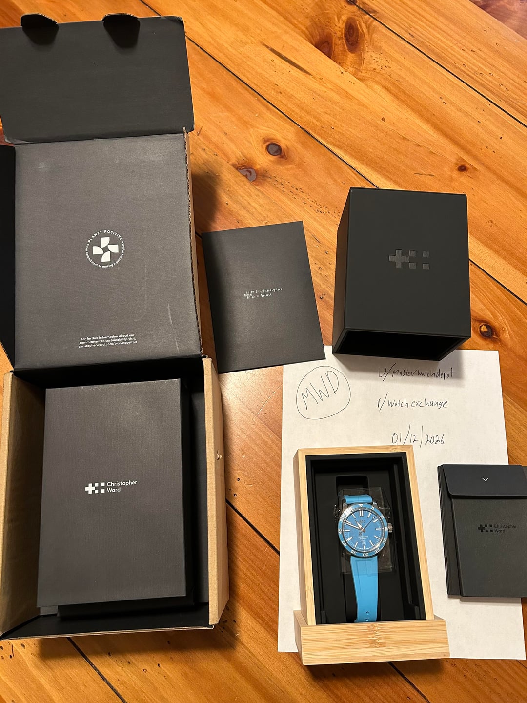 🤝 250+ references across multiple platforms — deal with confidence. Ships same or next business day. Payment: Zelle, Venmo, or PayPal. No trades. Buyer pays label unless noted. Christopher Ward C60 Trident Pro 300 – Pool Blue (40mm, Bracelet) — $799 shipped — Brand new in box. Unworn, unsized. Stainless steel bracelet, automatic movement, sapphire crystal, 300m water resistance. Full kit. Other colors of same model currently listed on CW site for $1255 pre taxes. Christopher Ward C60 Trident Pro 300 – Pool Blue (42mm, Rubber) — $679 shipped — Brand new in box. Unworn. Factory rubber strap, automatic movement, sapphire crystal, 300m water resistance. Full kit. Other colors of same model currently listed on CW site for $1050 pre taxes.