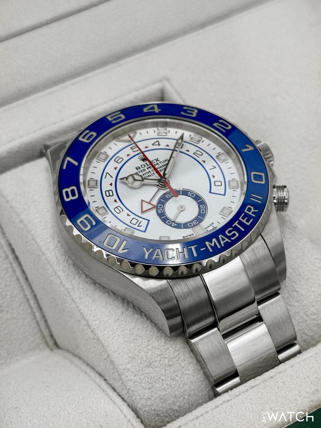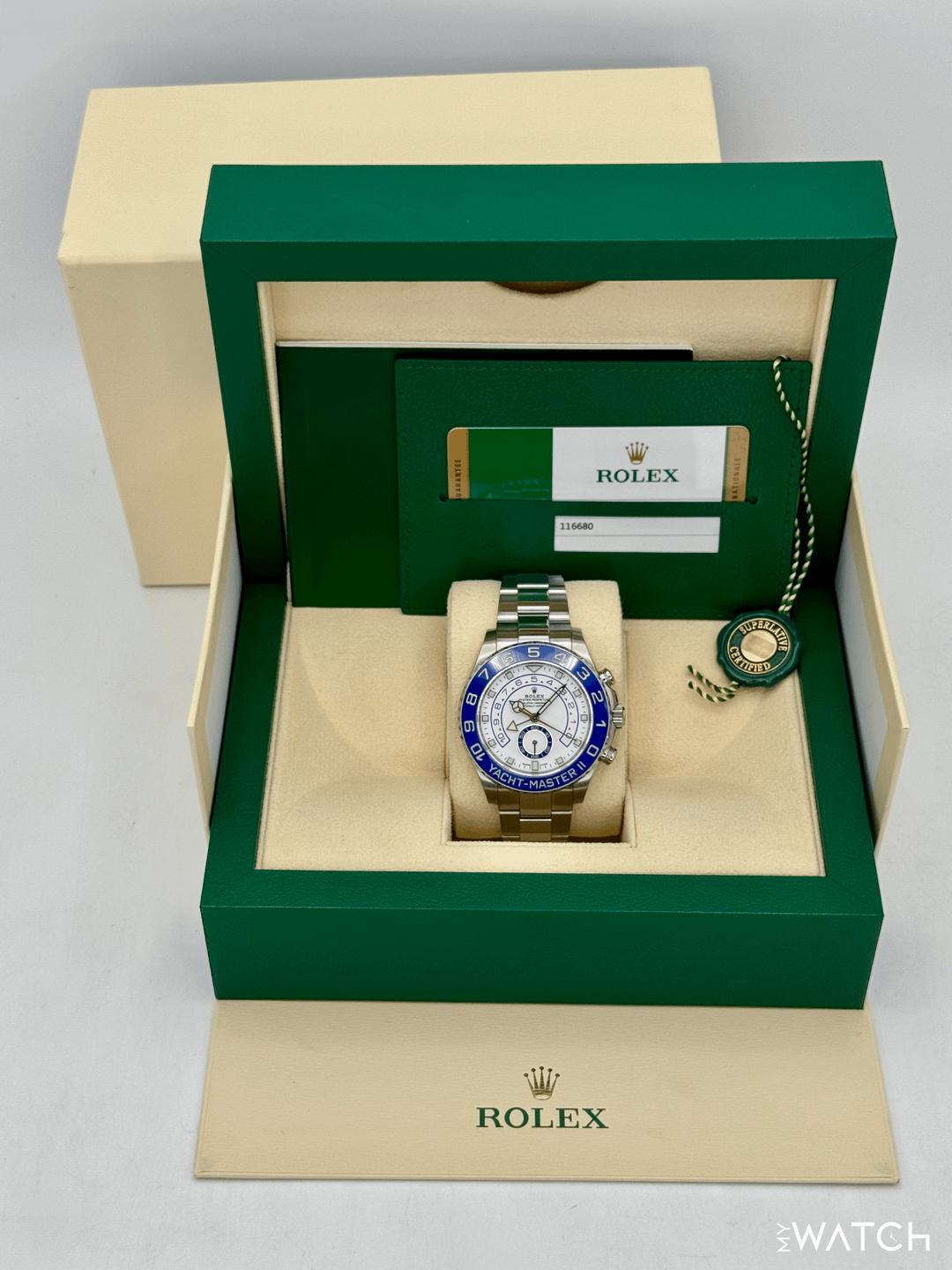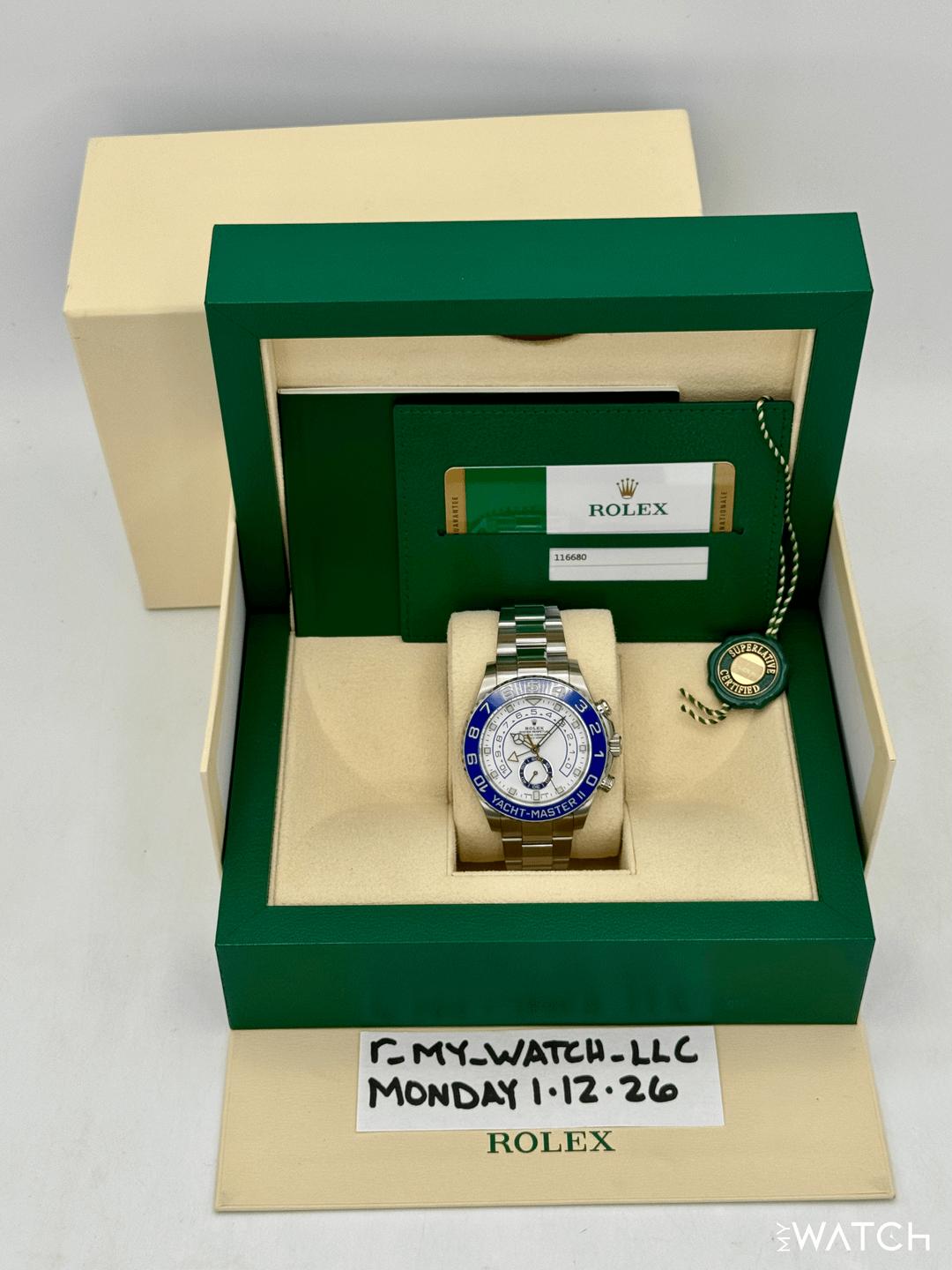 🔵**2019 Rolex Yacht-Master II 44mm 116680 Stainless Steel Oyster Bracelet White Dial** 🔵**TRADE or SELL us your luxury watch, all brands considered. Message me details.** **Includes the following:** **✔️Original Rolex Double Boxed** **✔️Box and Papers - Yes** **✔️5 Year Manufacturer Warranty** **✔️Warranty Card Dated November 2023** **✔️Manual and Warranty booklets** **✔️Green and White Hang Tags included** **✔️Material: Stainless Steel** **✔️Size: 7.75inch wrist (Full Links)** **✔️Watch is in excellent overall condition. Please see photos for details.** **✔️**[**Trades**](https://mywatchllc.com/pages/sell-rolex-watch) **welcome** Business Name: **My Watch LLC** LOCATION: Oak Park, Michigan ✔️[MyWatchLLC.com](http://mywatchllc.com/) for current inventory ✔️Google Business Listing [https://g.co/kgs/Cmd6FPW](https://g.co/kgs/Cmd6FPW) ✔️Business Hours M-F 9-6 ✔️Facetime/Video chat/calls welcome to view the watch interested. ✔️Contact: 248-422-0909 via text or call for quickest response. 🟢TERMS: Visit [MyWatchLLC.Com](http://mywatchllc.com/) for payments accepted 🟢REFERENCES/REVIEWS: We are well reviewed on all platforms from google, trust pilot, rolexforums, additionally we have 300+ reference in multiple FaceBook watch groups, reference checks welcome. 🟢SHIPPING: If you are not local, we offer Fully Insured FedEx overnight shipping in the USA for a fee. International shipping available. [https://mywatchllc.com/products/2019-rolex-yacht-master-ii-44mm-116680-stainless-steel-white-dial](https://mywatchllc.com/products/2019-rolex-yacht-master-ii-44mm-116680-stainless-steel-white-dial)