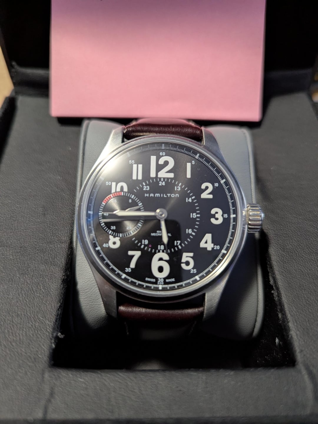 **Hamilton Khaki Field Officer Mechanical – Classic, Reliable, Timeless** The Hamilton Khaki Field Officer Mechanical is a watch that keeps things simple, classic, and dependable. Inspired by traditional military field watches, it features a hand-wound Swiss mechanical movement—no batteries, just pure watchmaking you can feel every time you wind it. The 44 mm stainless-steel case gives the watch a bold wrist presence while staying comfortable and easy to wear. It’s protected by a scratch-resistant sapphire crystal, making it ideal for everyday use. The clean black dial is highly legible, with bold numerals. A sturdy leather strap completes the classic officer-style look. **Specs at a glance:** * **Movement:** Swiss hand-wound mechanical * **Case Size:** 44 mm stainless steel * **Thickness:** Approx. 11.55 mm * **Crystal:** Sapphire, scratch-resistant * **Dial:** Black with white numerals * **Water Resistance:** 100m * **Strap:** Leather strap with pin buckle More info on the watch - [Hamilton Website](https://www.hamiltonwatch.com/en-ca/h69619533-khaki-field-officer-mechanical.html) It comes with box and watch. The box has seen better days (glue loosen on the insides) Price: $465 shipped within US/Canada Any questions/more photos, please feel free to ask