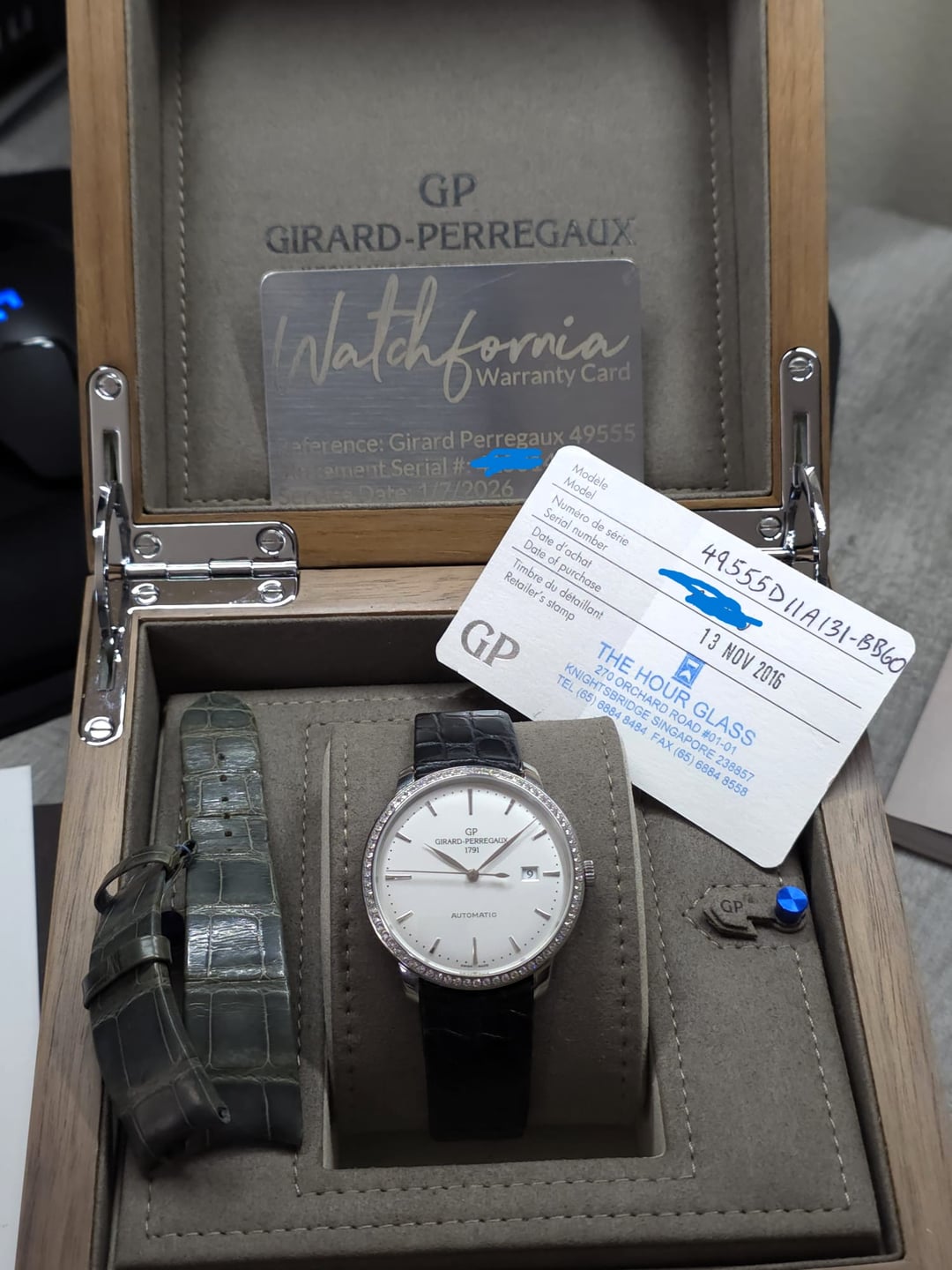 **Girard-Perregaux 1966 – OEM Factory Diamond Bezel** **Ref. 49555** This Girard-Perregaux 1966 is in superb condition and was just serviced by my watchmaker. The watch will come with a **1-year service warranty** on the service card for added peace of mind. **Included with the watch:** * Large original wooden presentation box * Jewelry certificate * Booklet * OEM green gator leather strap * Aftermarket black gator leather strap * Original warranty card A very elegant and timeless GP dress watch, complete and well cared for, ready to be worn or added to a collection. Price - $4499 shipped Pics & Timestamp - [https://imgur.com/a/zPcxNlW](https://imgur.com/a/zPcxNlW) IG = watchfornia Cheers , Adam