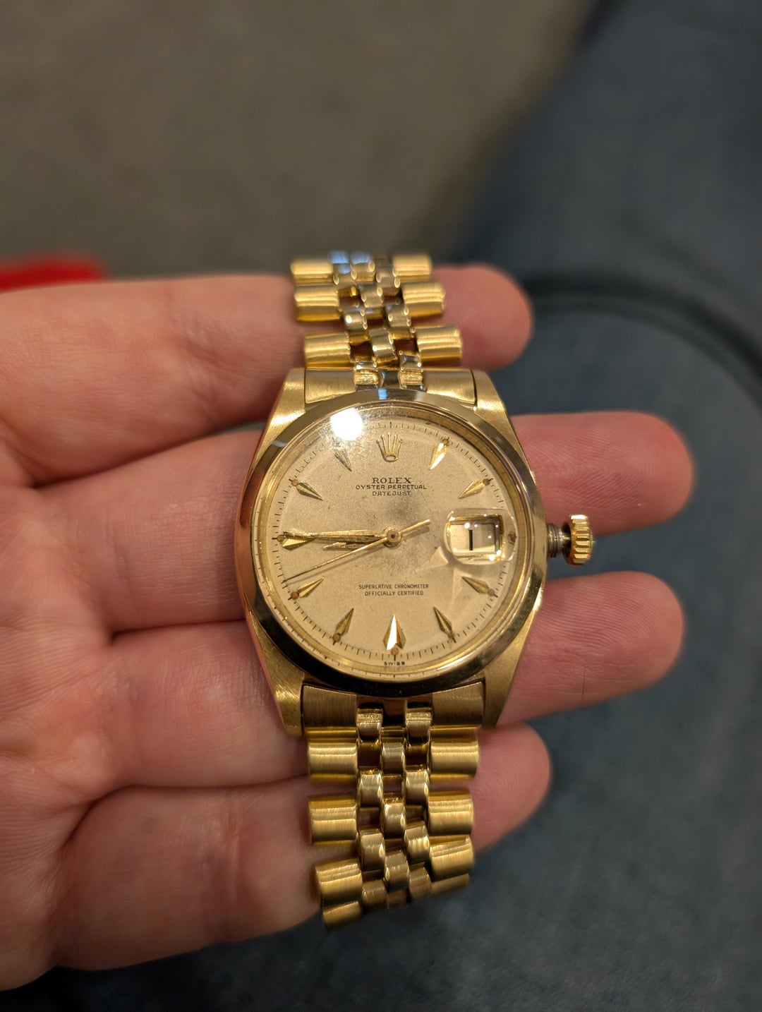 I inherited this very rare piece from my father and it was in pretty bad shape at the time. I sent it to Zimmerman Watch Repair for a total restoration and it's now like new with its original vintage face. Absolutely sparkling and beautiful, case and bracelet are 18kt yellow gold. Asking USD 14,600 + shipping More pics and video: https://www.dropbox.com/scl/fo/hhbnop9z6zr8gec26kmet/AFR-OLAJ-zc13hRmjlvTsaQ?rlkey=rhf011aquh9j84xss7ayd3lx2&st=sb4s2buv&dl=0 Pics from before restoration can be found in my profile