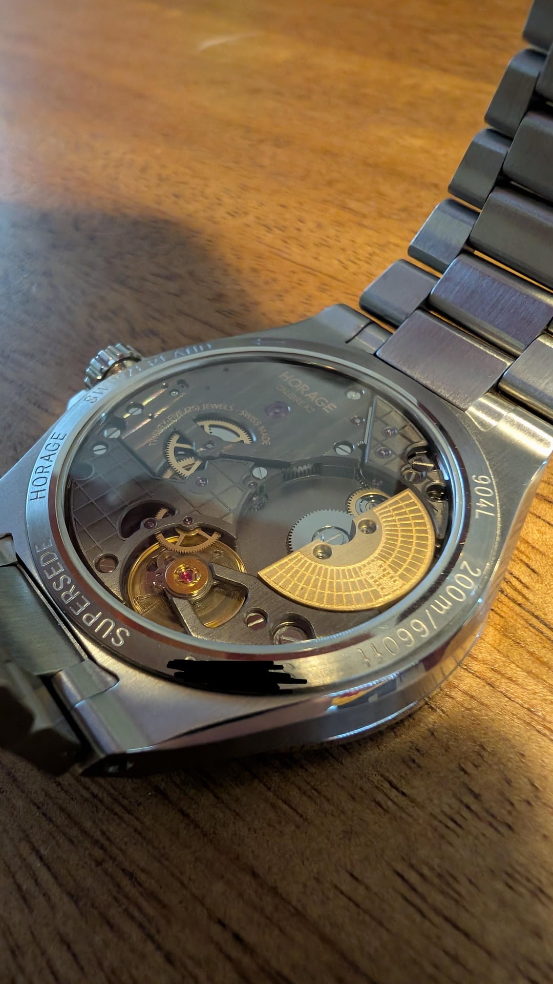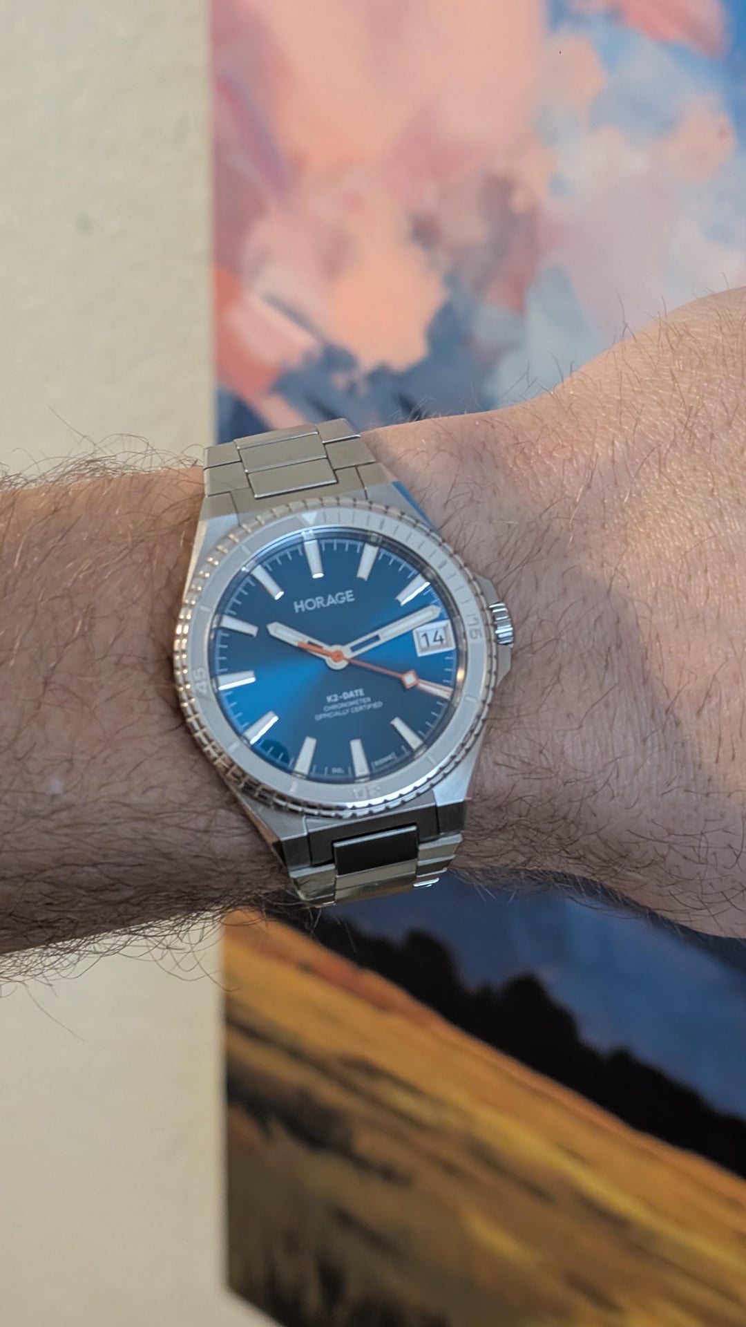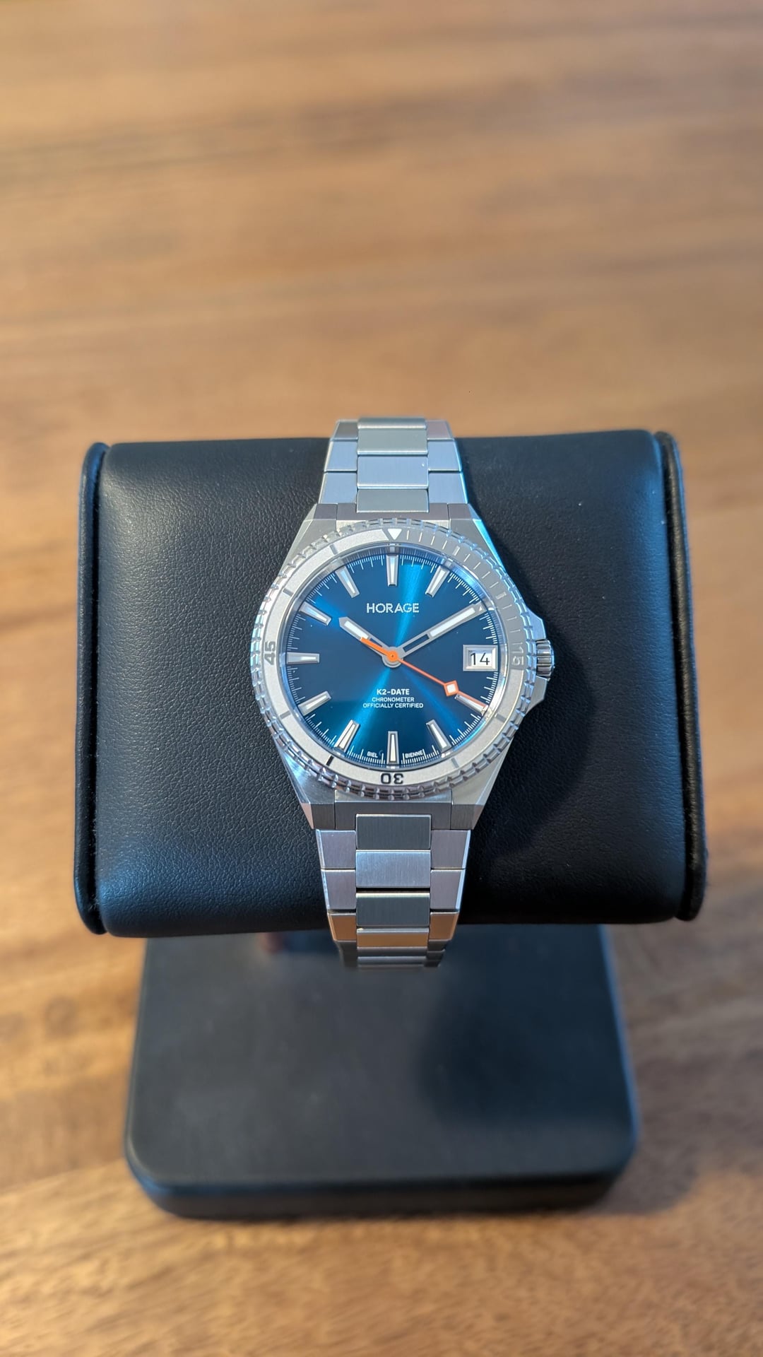 Hello watch exchange, up for sale today is my Horage Supersede Date. This is a fantastic watch, but I recently picked up a Daytona and am trying to consolidate my collection. Asking $3999 + shipping. Sold as a complete set with original box and papers, an extra orange strap to match the watch, and an additional two years of warranty from the manufacturer after the service. This is a stunning little watch that packs in a lot of features and checks a lot of boxes for a collection. ✅ Thin (10.28mm) ✅ Quick set hour AND quick set date ✅ Decent water resistance (200m) ✅ 3-day power reserve ✅ COSC certified ✅ Rotating bezel (must have for reminders) ✅ Silicon hairspring ✅ On the fly micro-adjust ✅ Automatic (micro-rotor) ✅ Decent lume The watch is in good lightly worn condition with some normal scuffs and hairlines on the bracelet. And was just returned from service, keeping time well within cosc spec. Please see the images and reach out with any questions! Link to manufacturer website: https://www.shop.horage.com/product-page/supersede-date